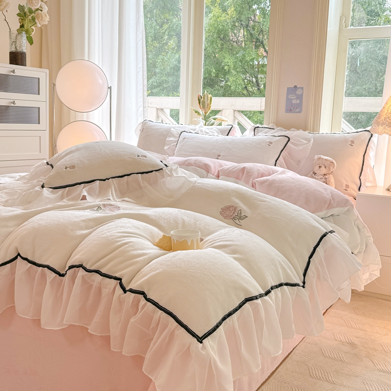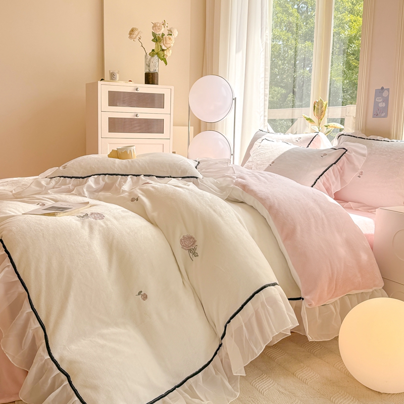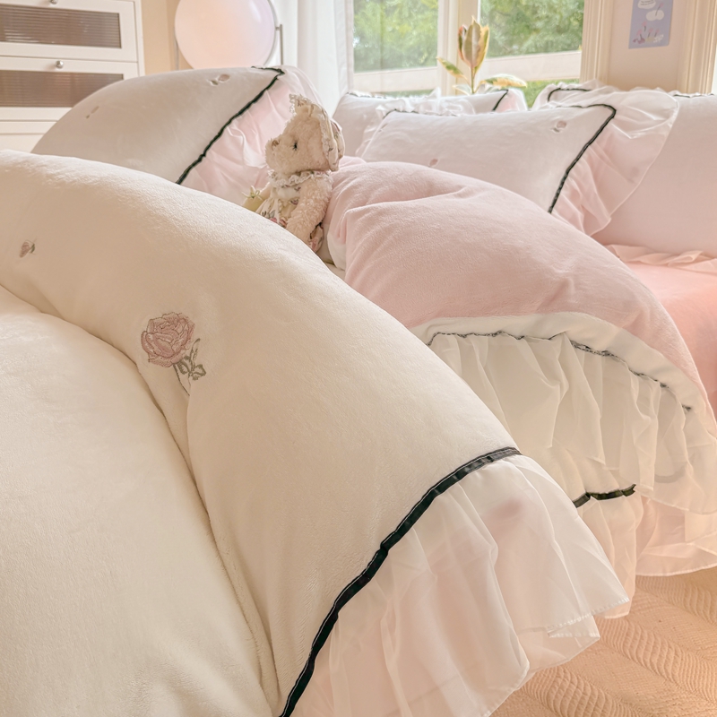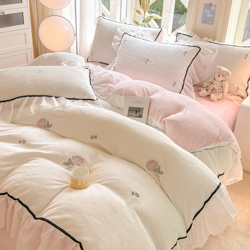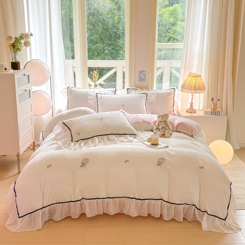 商品名称:二八年华 2024新款洛神玫瑰刺绣花边牛奶绒四件套 洛神-白粉