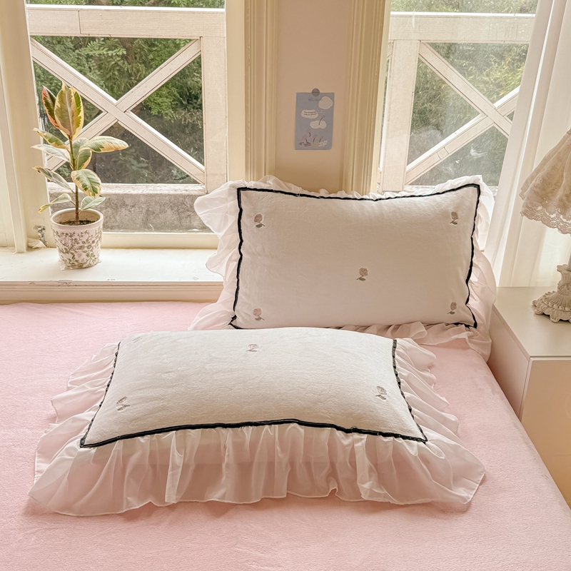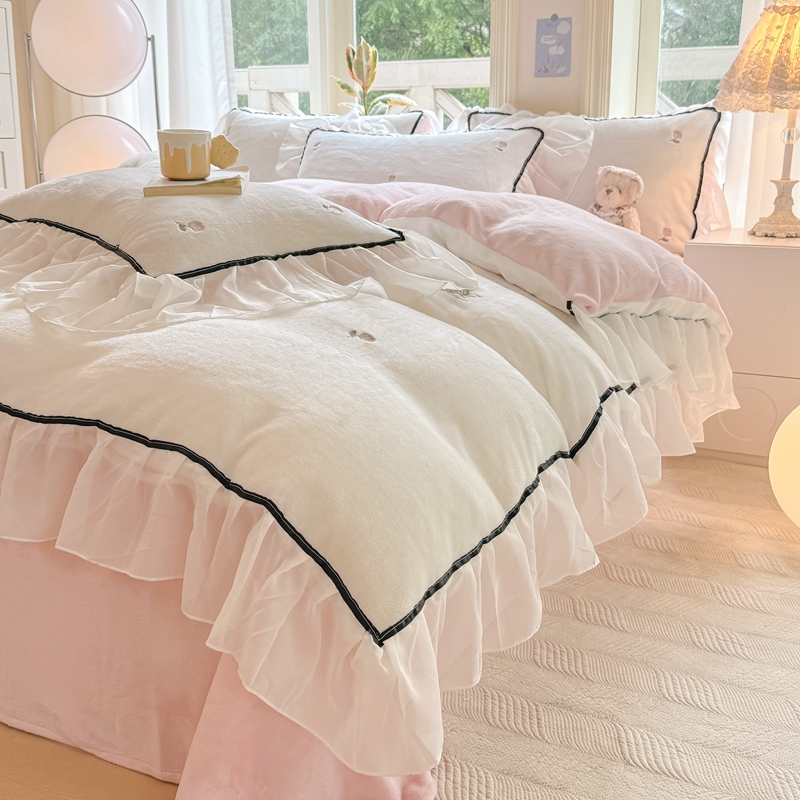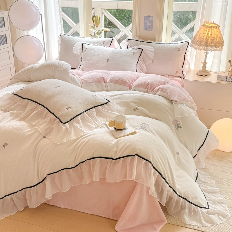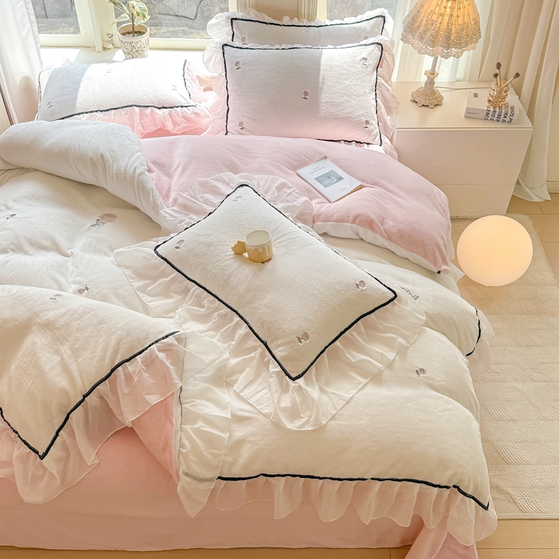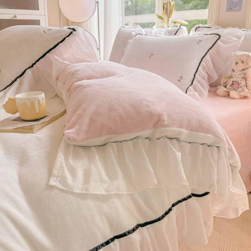 (总)二八年华 2025新款韩式花边款牛奶绒四件套,天蓝,豆沙,鹅黄,粉玉,水绿,鸢紫