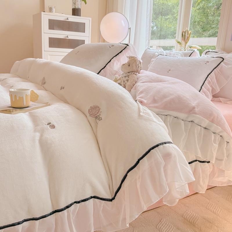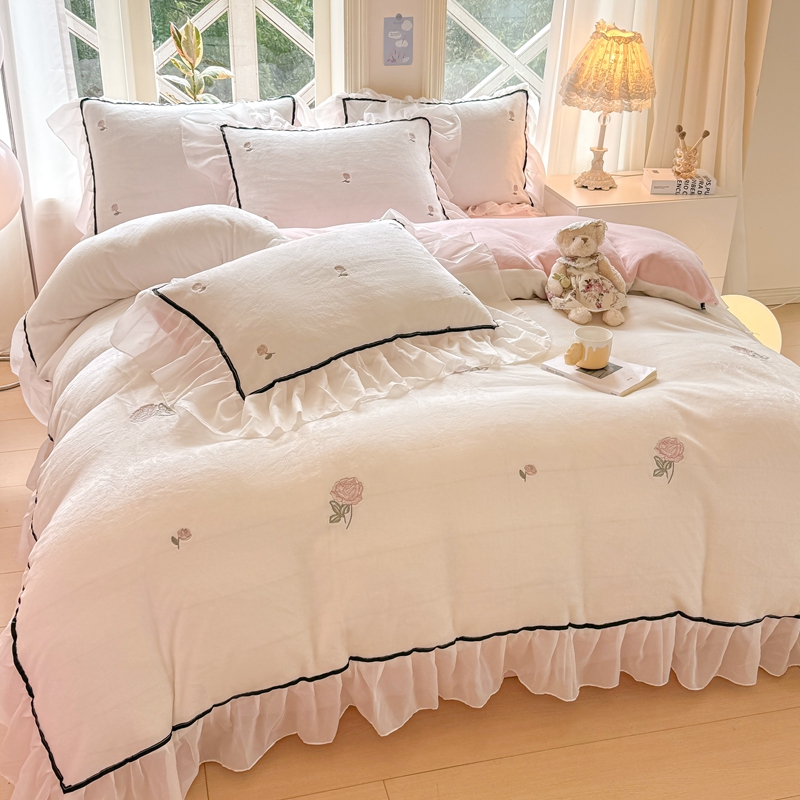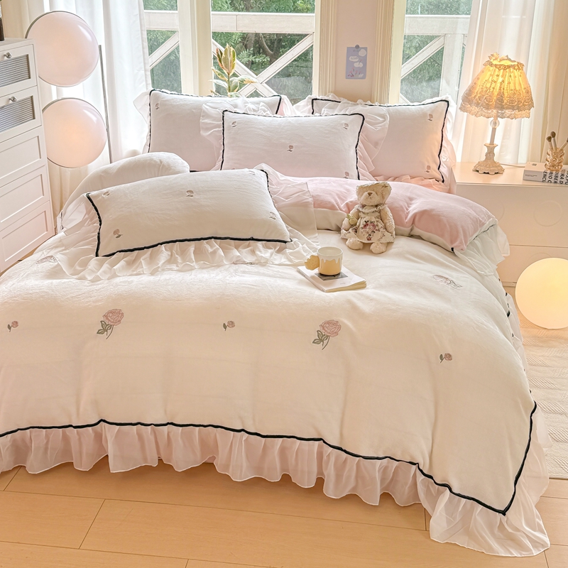 二八年华 2024新款洛神玫瑰刺绣花边牛奶绒四件套 洛神-白粉