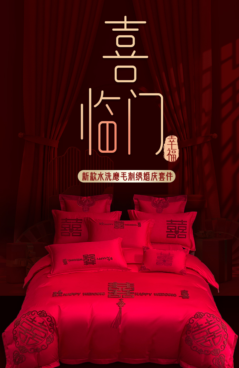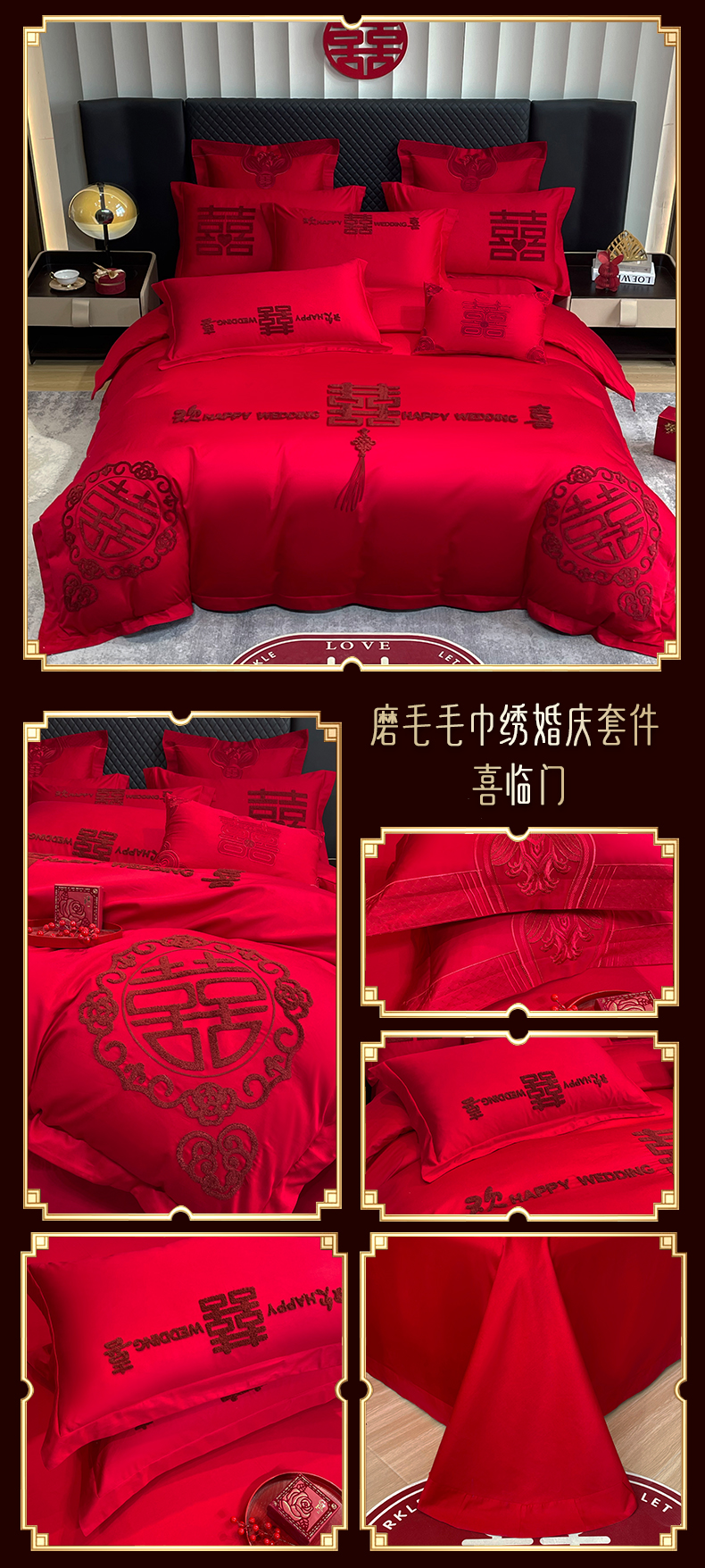 芊囍纺 2024新款亲肤磨毛婚庆刺绣四件套 喜临门