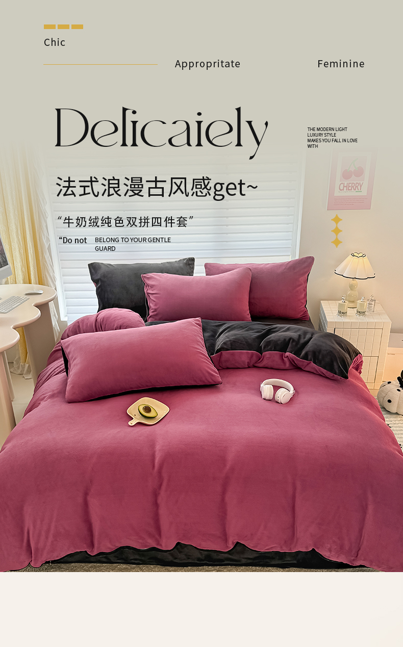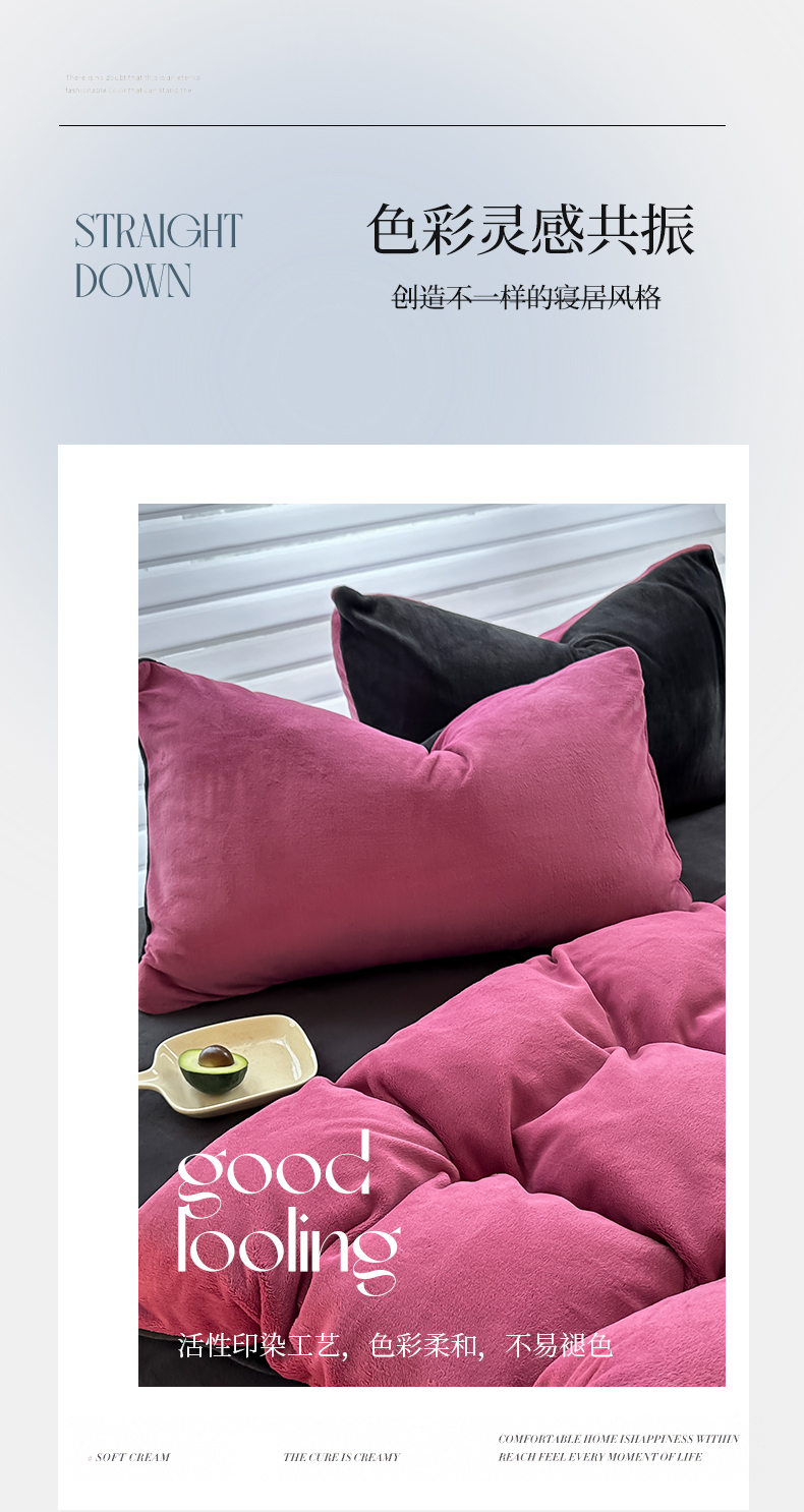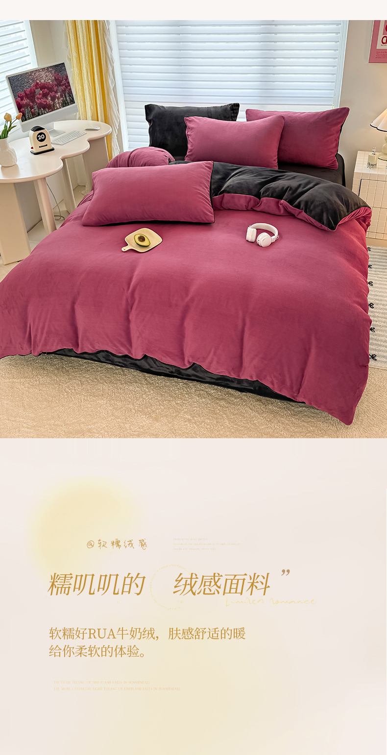 (总)觅妮家纺 2025新款纯色高克重牛奶绒四件套系列,果绿粉,宝石蓝,高级黑,卡其黑,柠檬粉,浅粉灰,深浅灰,树莓粉