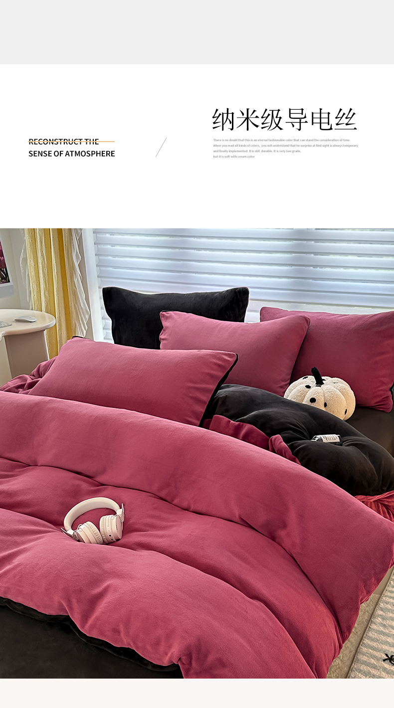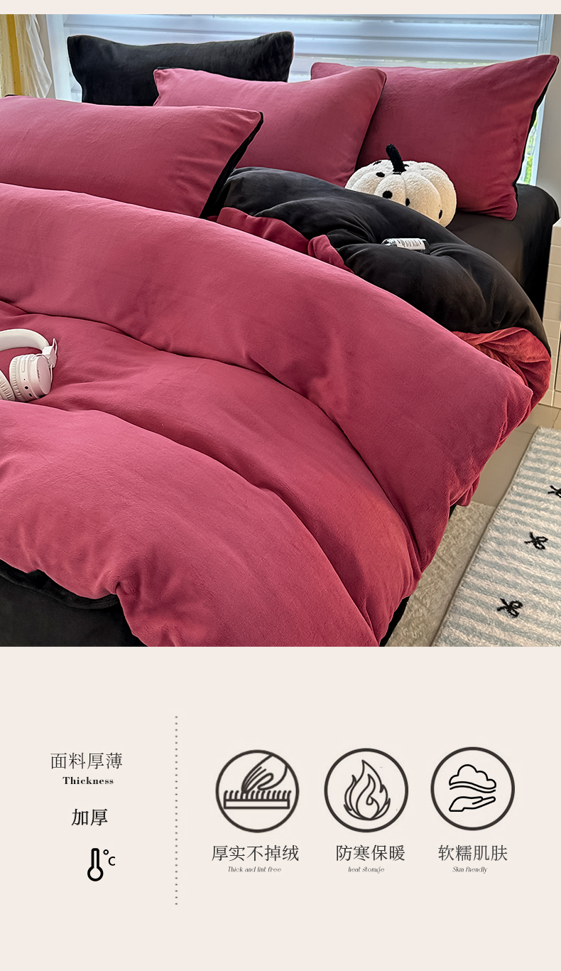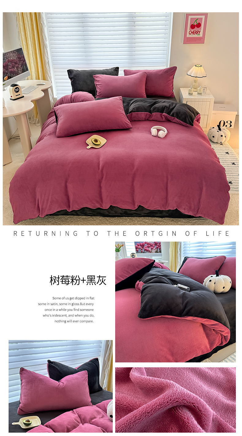 商品名称:觅妮家纺 2025新款全消光200g简约高克重秋冬加厚双拼牛奶绒单被套 树莓粉+黑灰