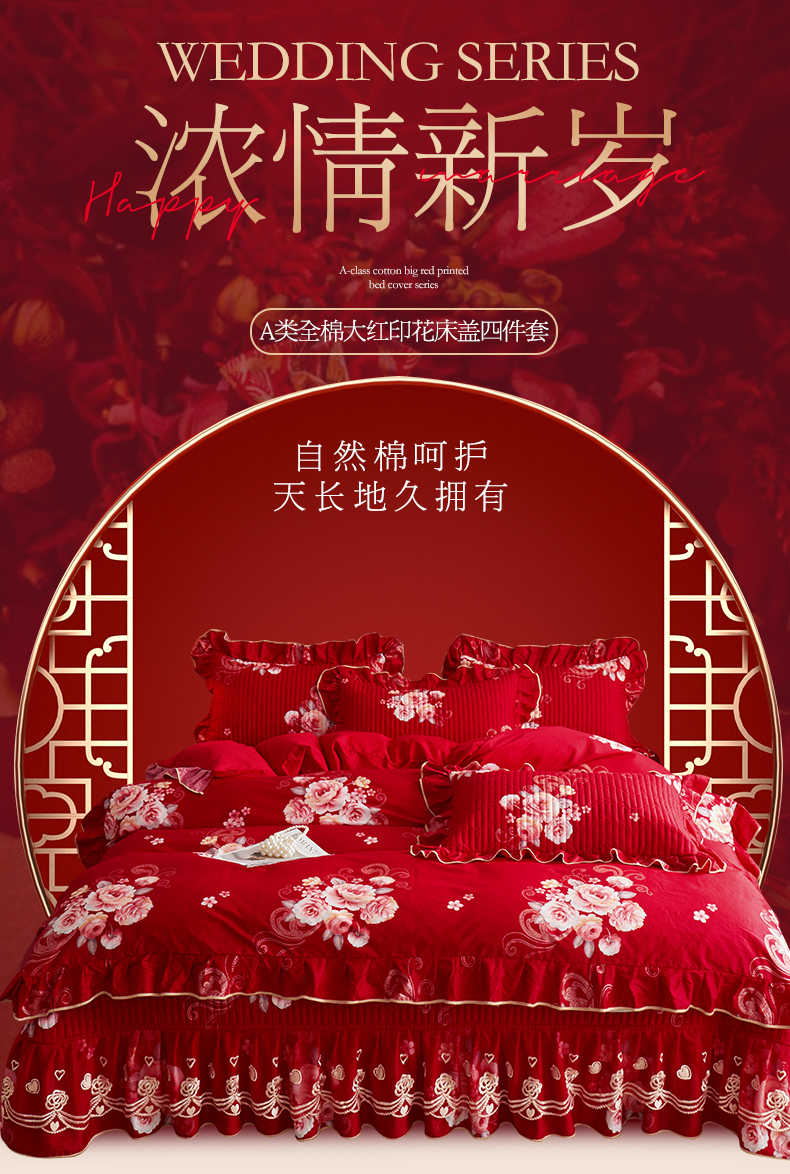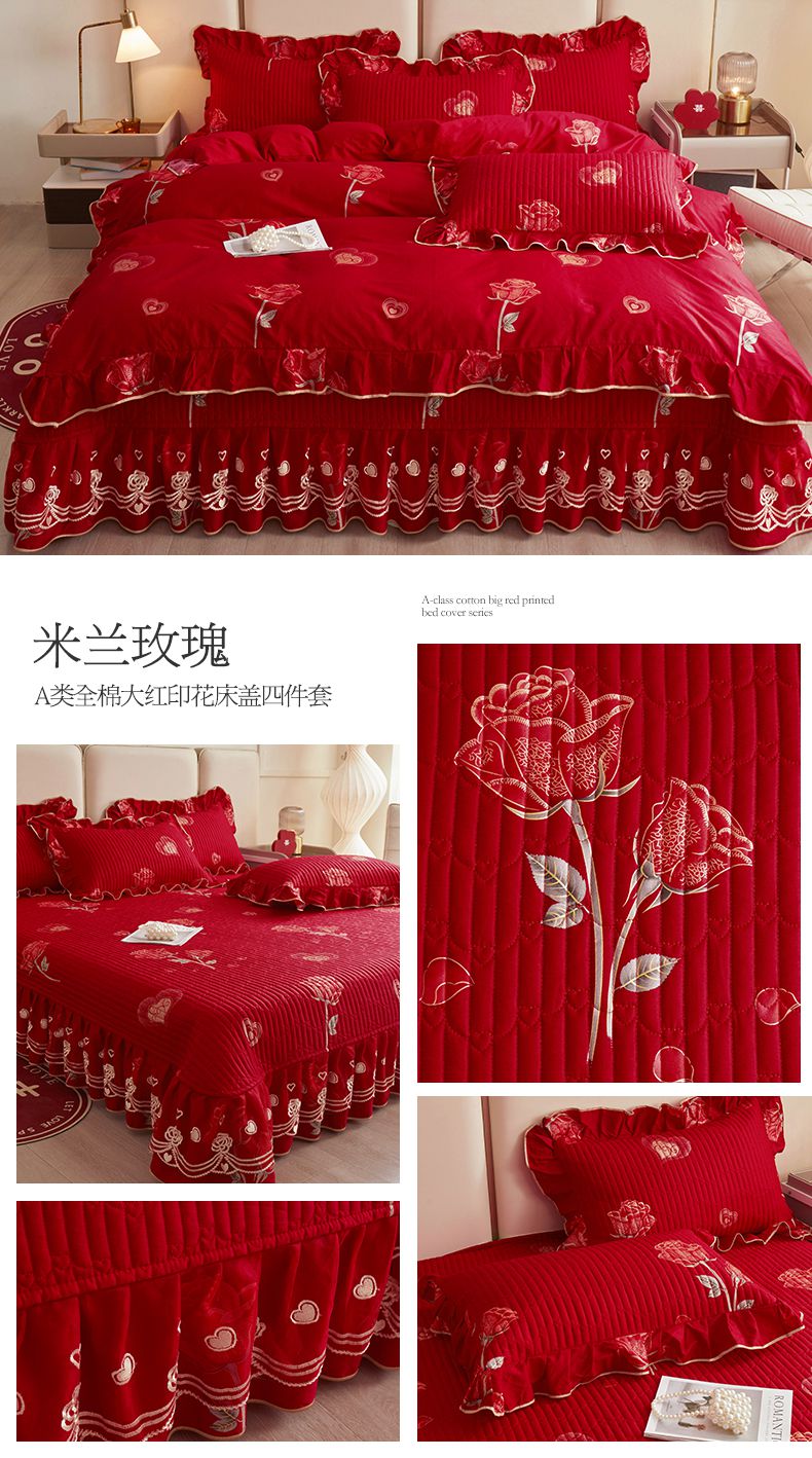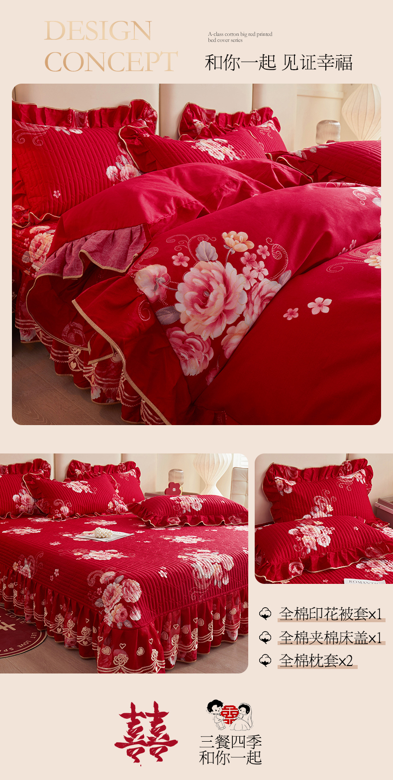 宜凡家纺 2024新款A类全棉大红印花床盖四件套 花开福满