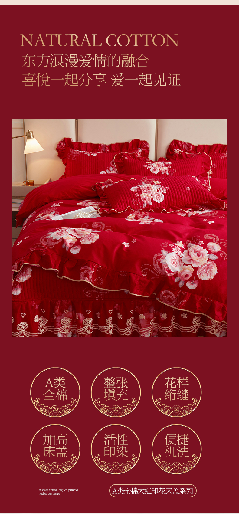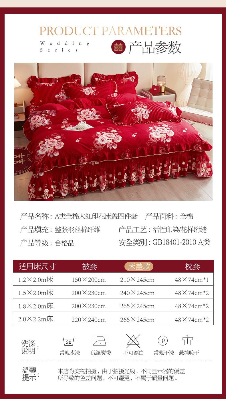 商品名称:宜凡家纺 2024新款A类全棉大红印花床盖四件套 花开福满