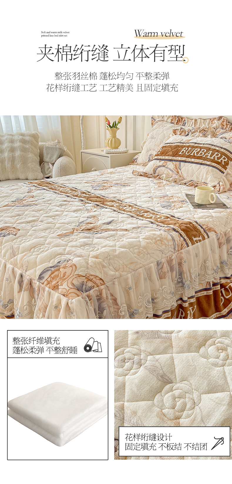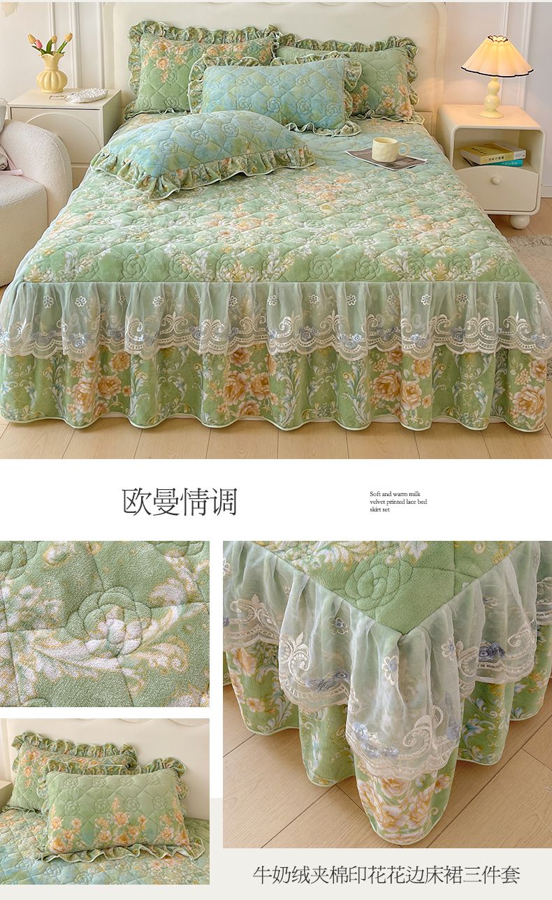当前位置: 91家纺网 > 商品网购 > 床品套件 > 三件套 > 宜凡家纺 2024新款牛奶绒印花夹棉花边床裙三件套 晨园幽香