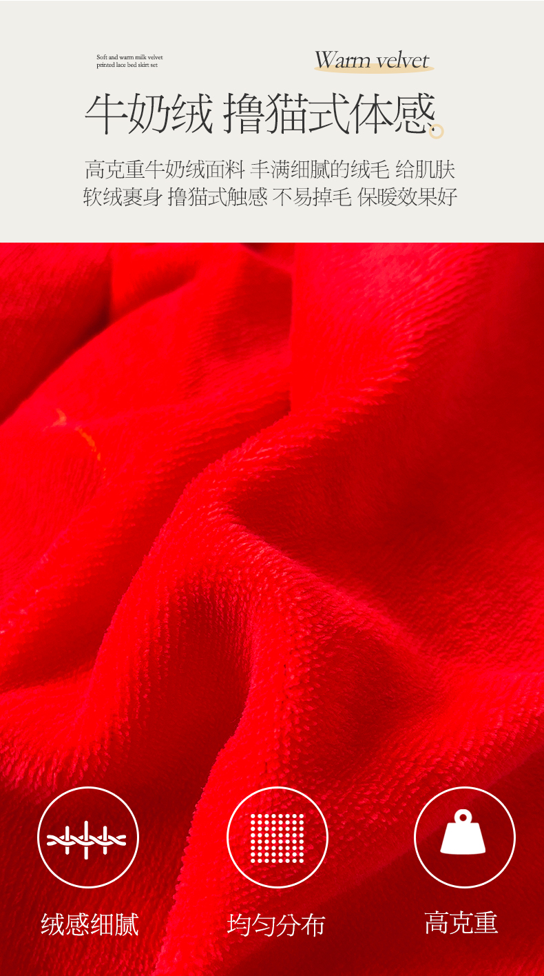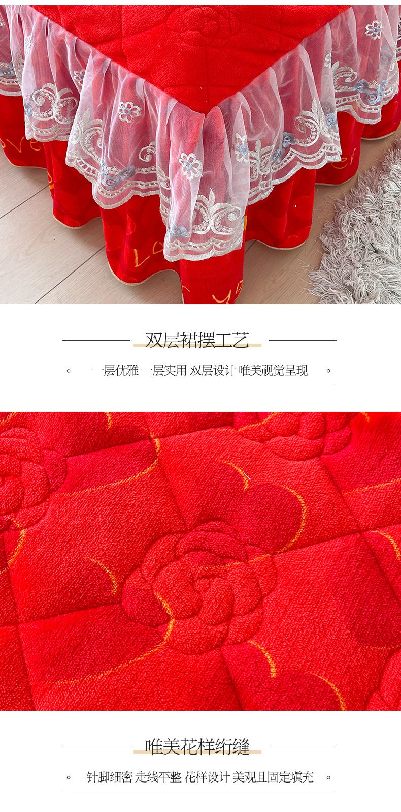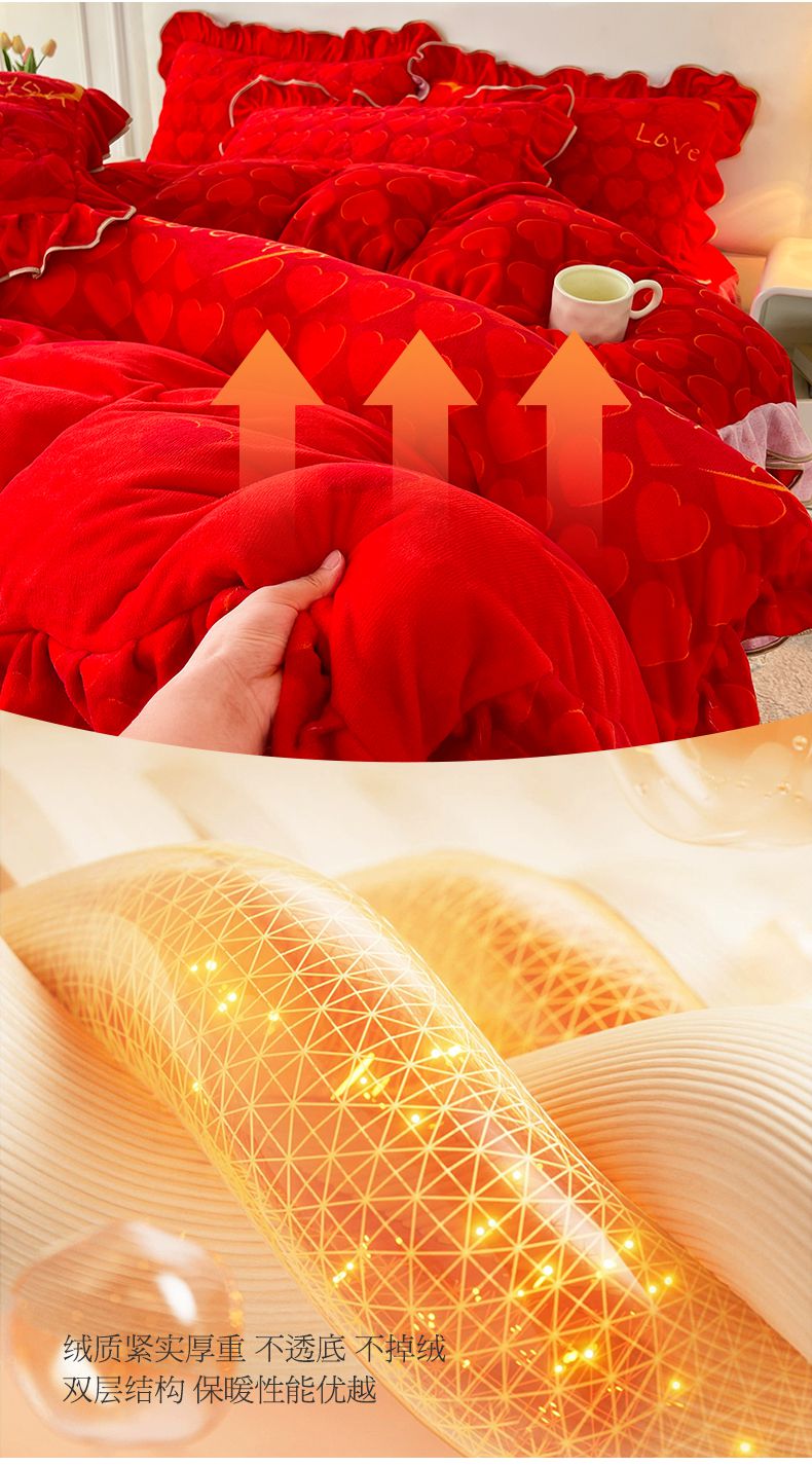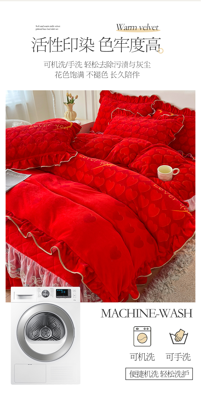 商品名称:宜凡家纺 2024新款牛奶绒印花夹棉花边床裙四件套 心动时刻 大红