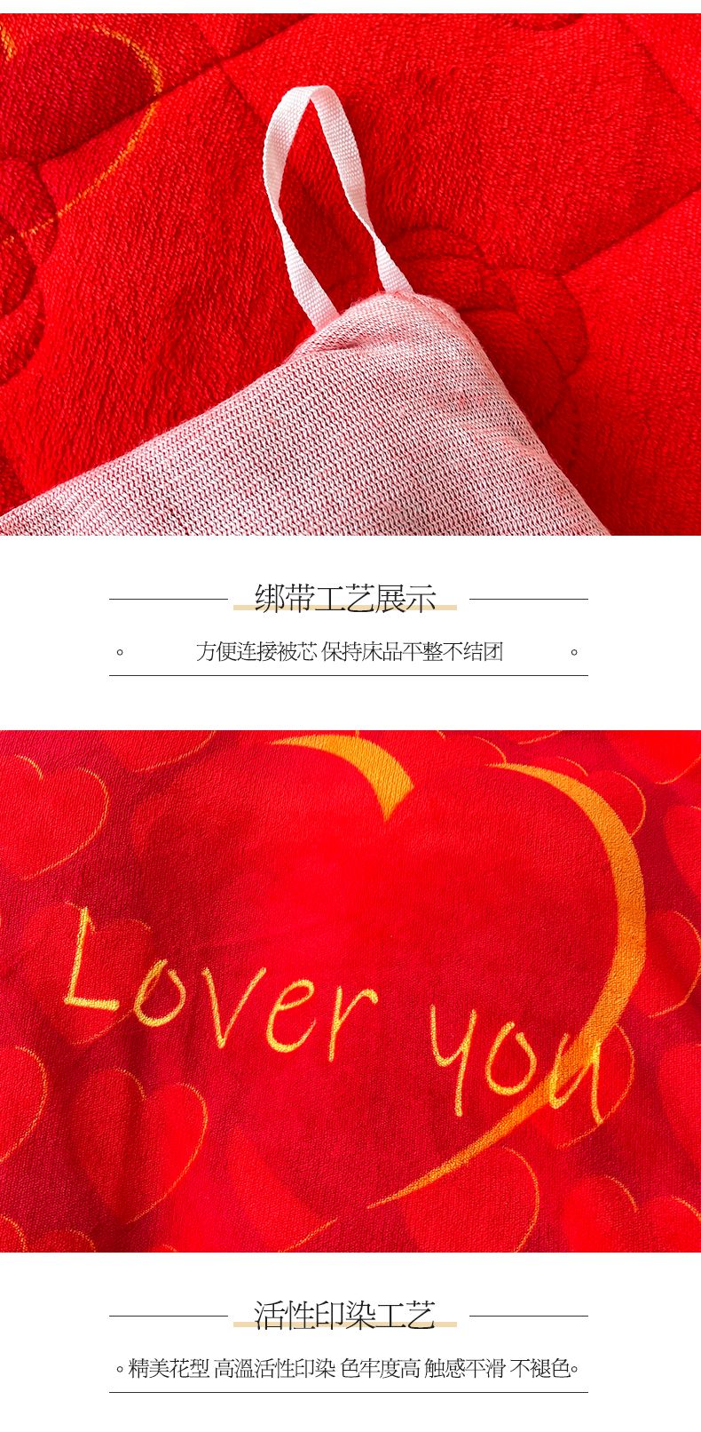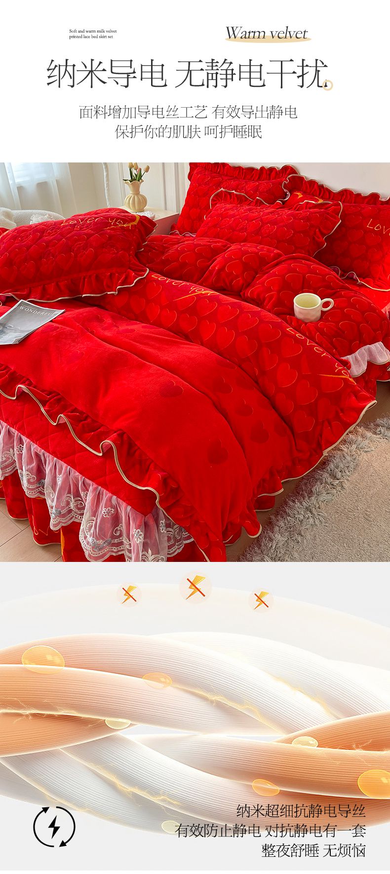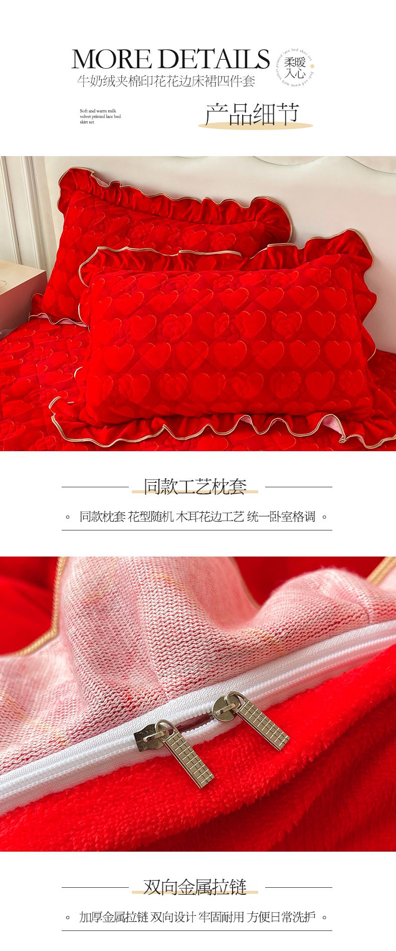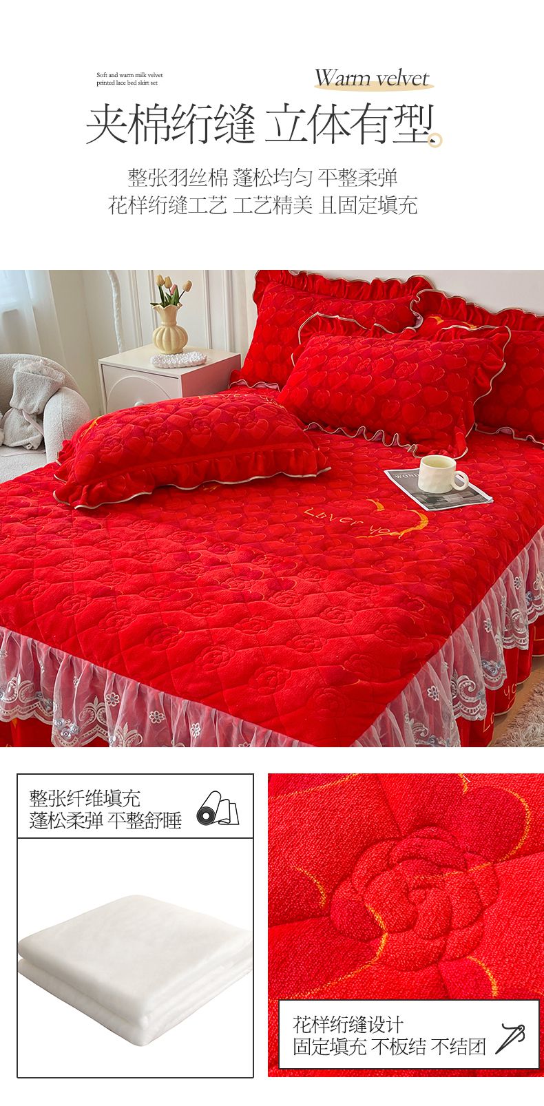商品名称:宜凡家纺 2024新款牛奶绒印花夹棉花边床裙四件套 心动时刻 大红