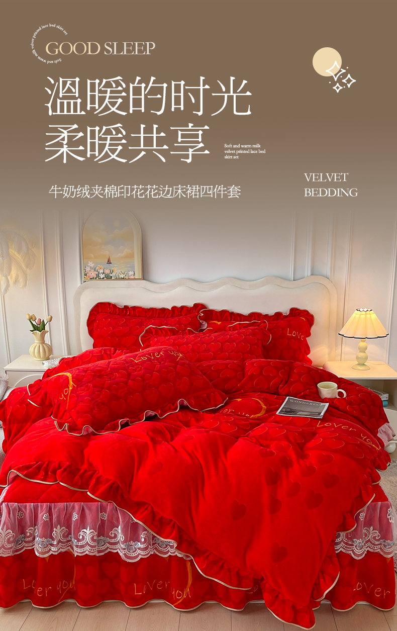 宜凡家纺 2024新款牛奶绒印花夹棉花边床裙四件套 心动时刻 大红