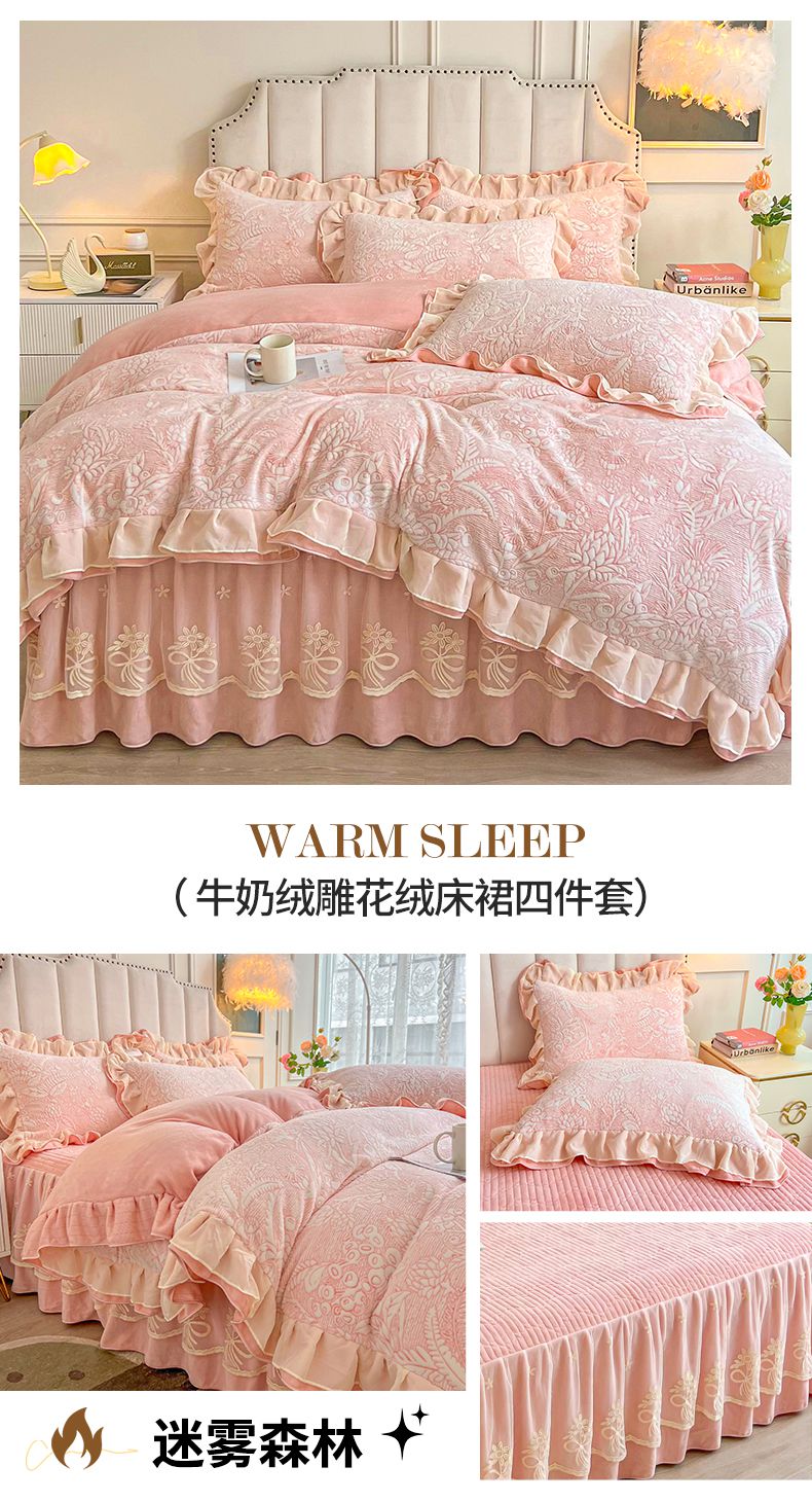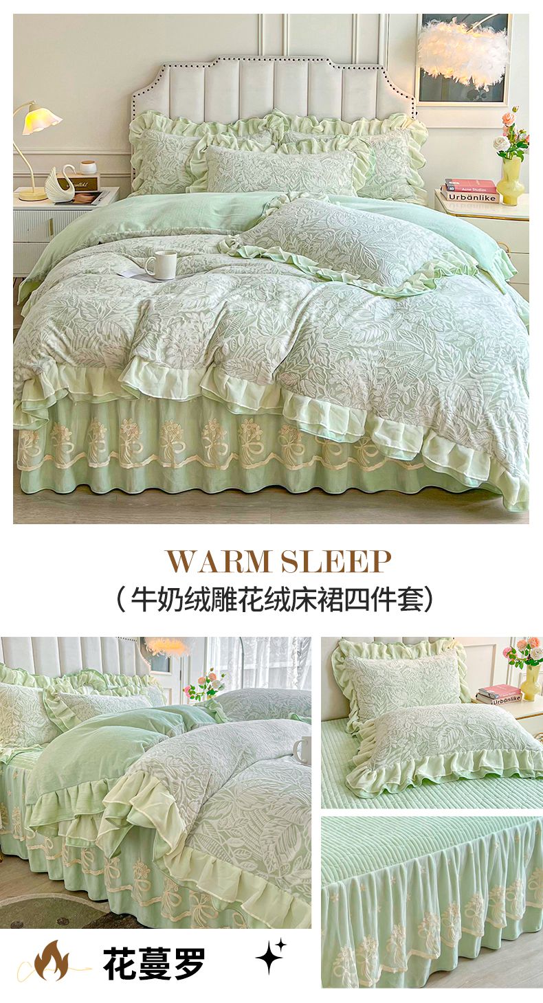 商品名称:宜凡家纺 2024新款牛奶绒雕花绒床裙四件套 花蔓罗