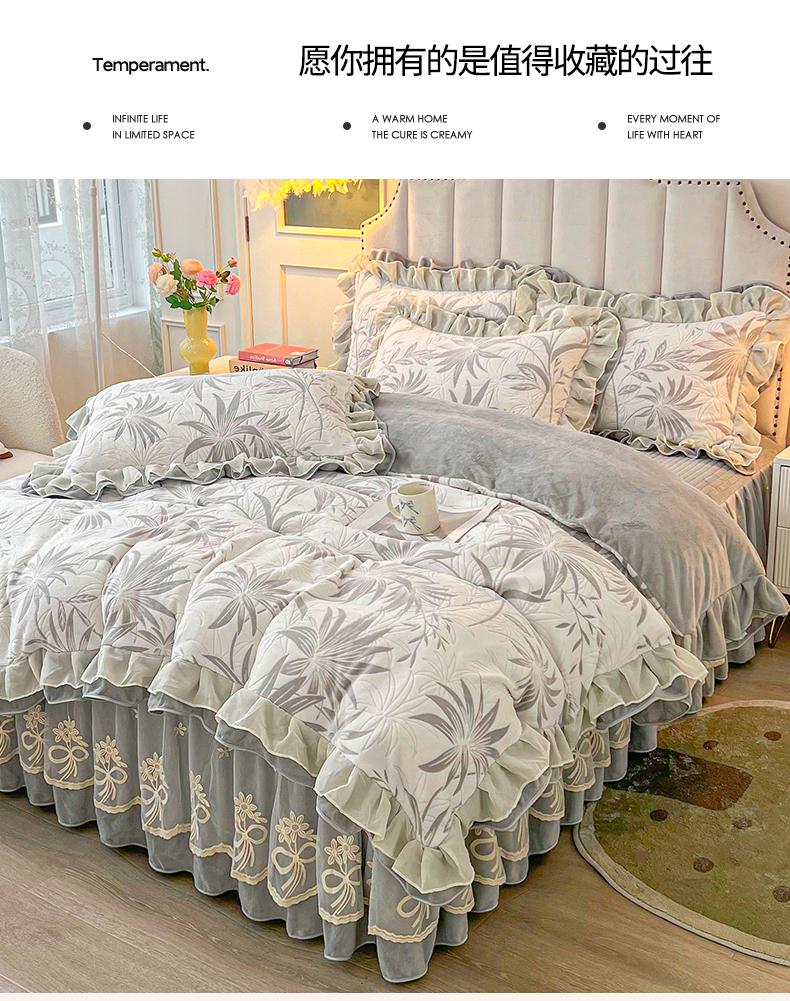 宜凡家纺 2024新款牛奶绒雕花绒床裙四件套 花蔓罗