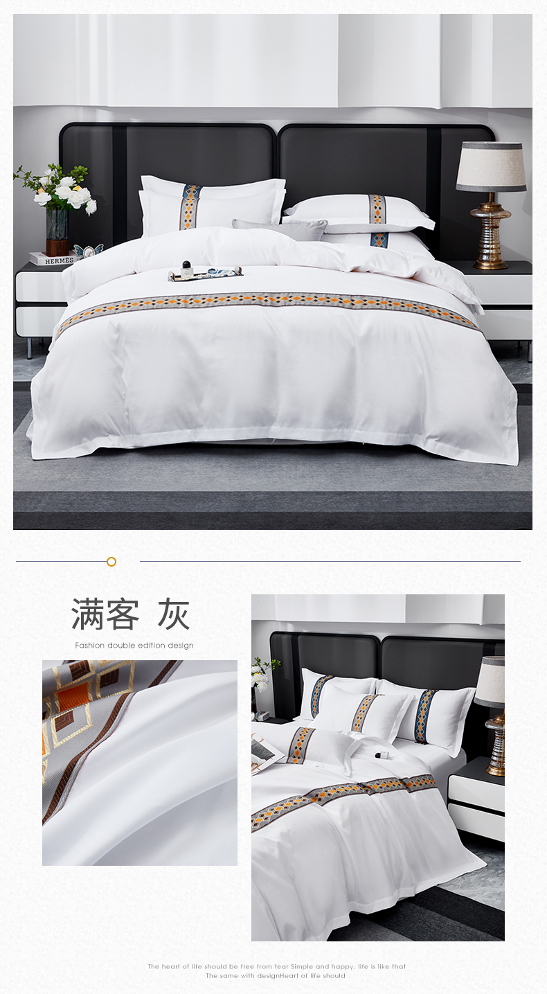 当前位置: 91家纺网 > 商品网购 > 床品套件 > 四件套 > 其它四件套 > 罗菲尼酒店用品 2025新款织带高仿棉酒店四件套宾馆四件套 满客灰