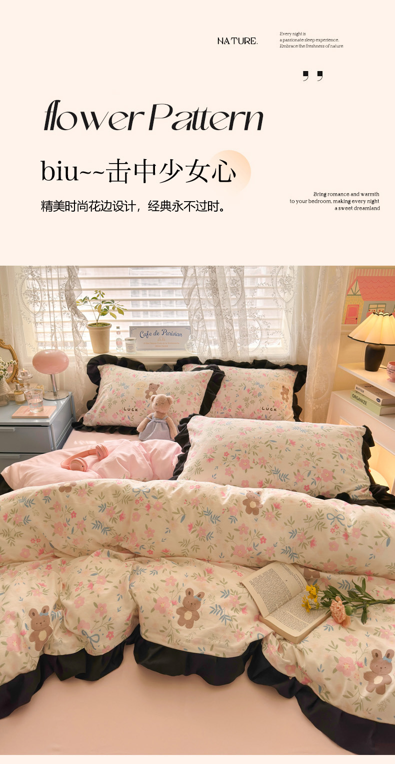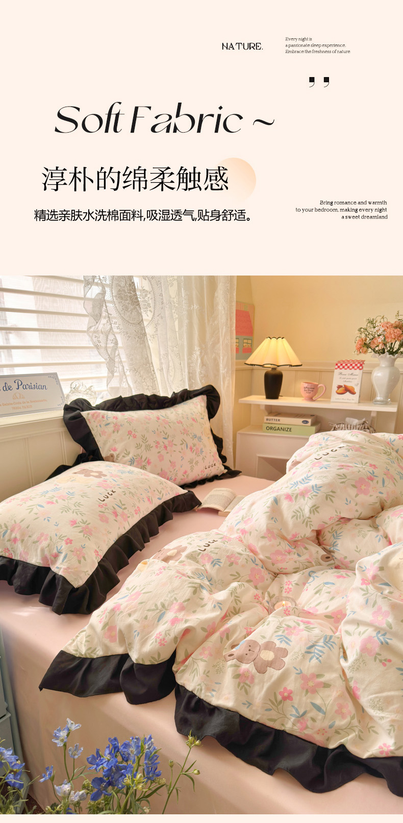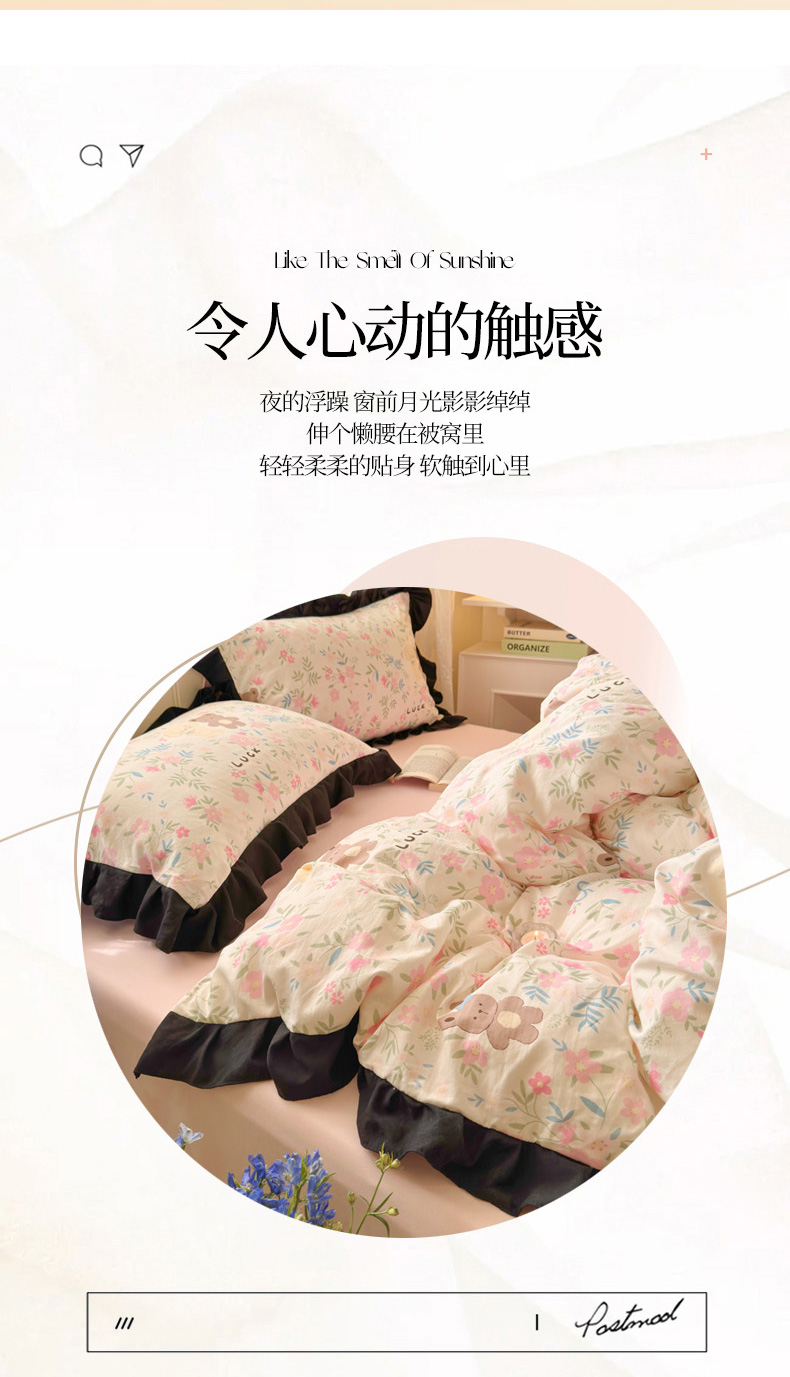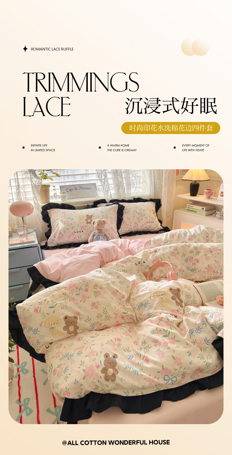 当前位置: 91家纺网 > 商品网购 > 床品套件 > 四件套 > 水洗棉四件套 > 慕澄家纺 2025新款法式浪漫风花边款水洗棉四件套 花边款-花园宝贝