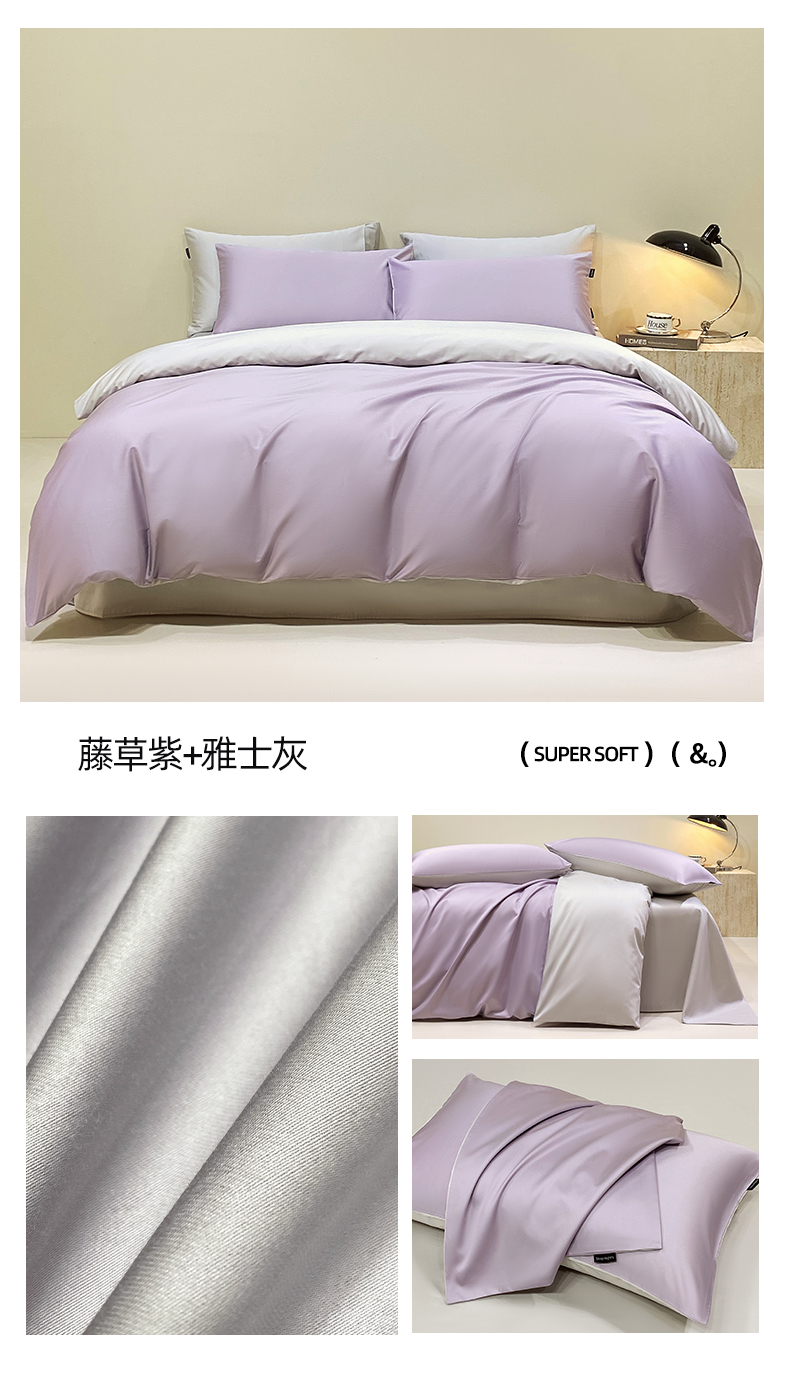 拼社家纺 2025新款轻奢高支贡缎长绒棉四件套全棉四件套简约纯色纯棉床上用品(买家秀) 藤草紫+雅士灰