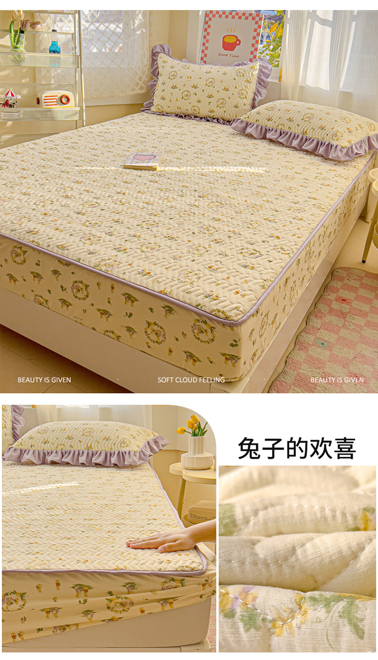 商品名称:纽缦家纺 2025新款云朵提花双层纱夹棉绗缝床笠 兔子的欢喜