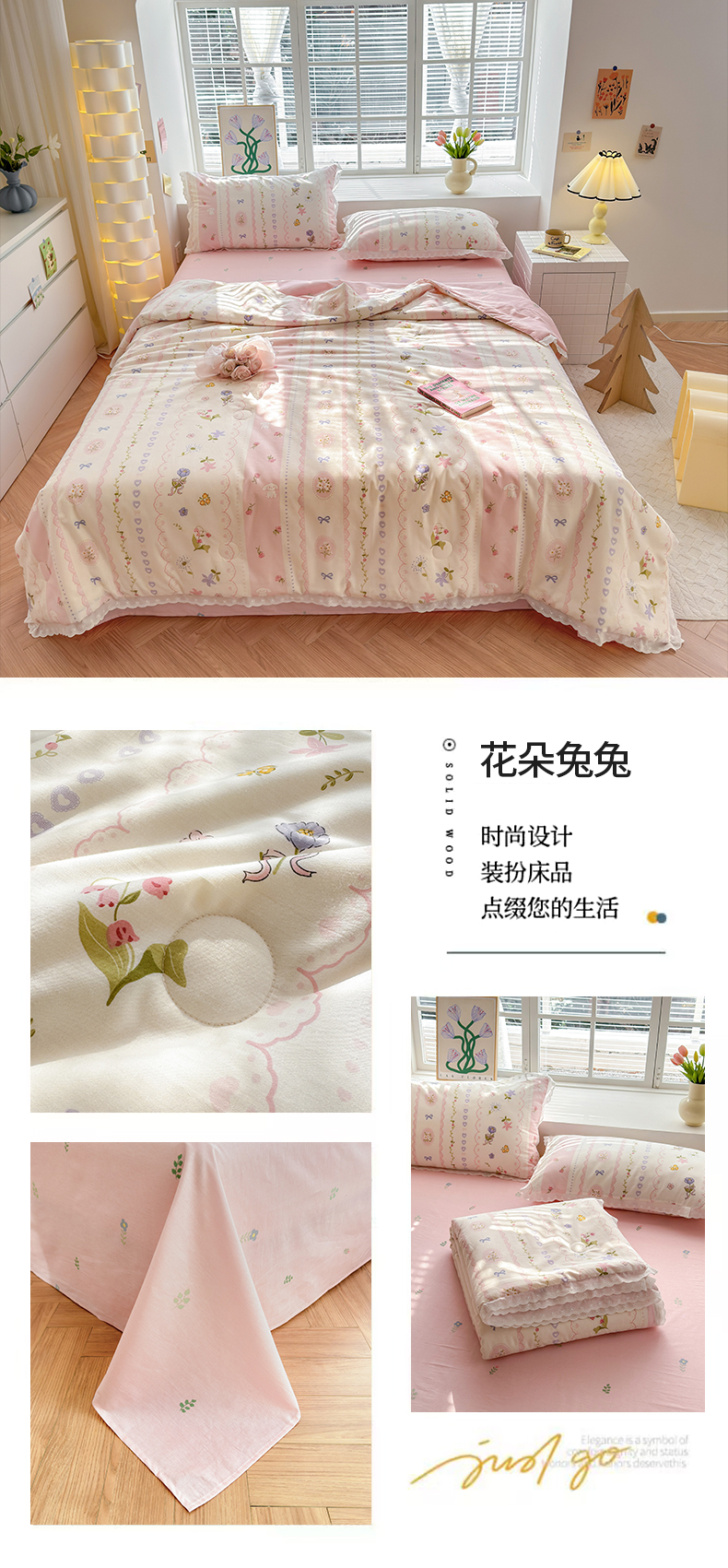 被窝家纺 2025新款全棉花边大豆夏被四件套 花朵兔兔