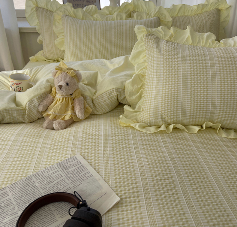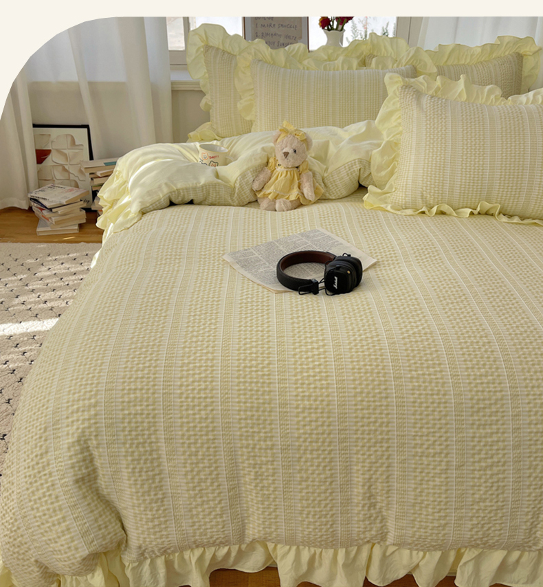 十里居 2025新款泡泡纱提花韩版公主格水洗棉花边款四件套 柚子黄