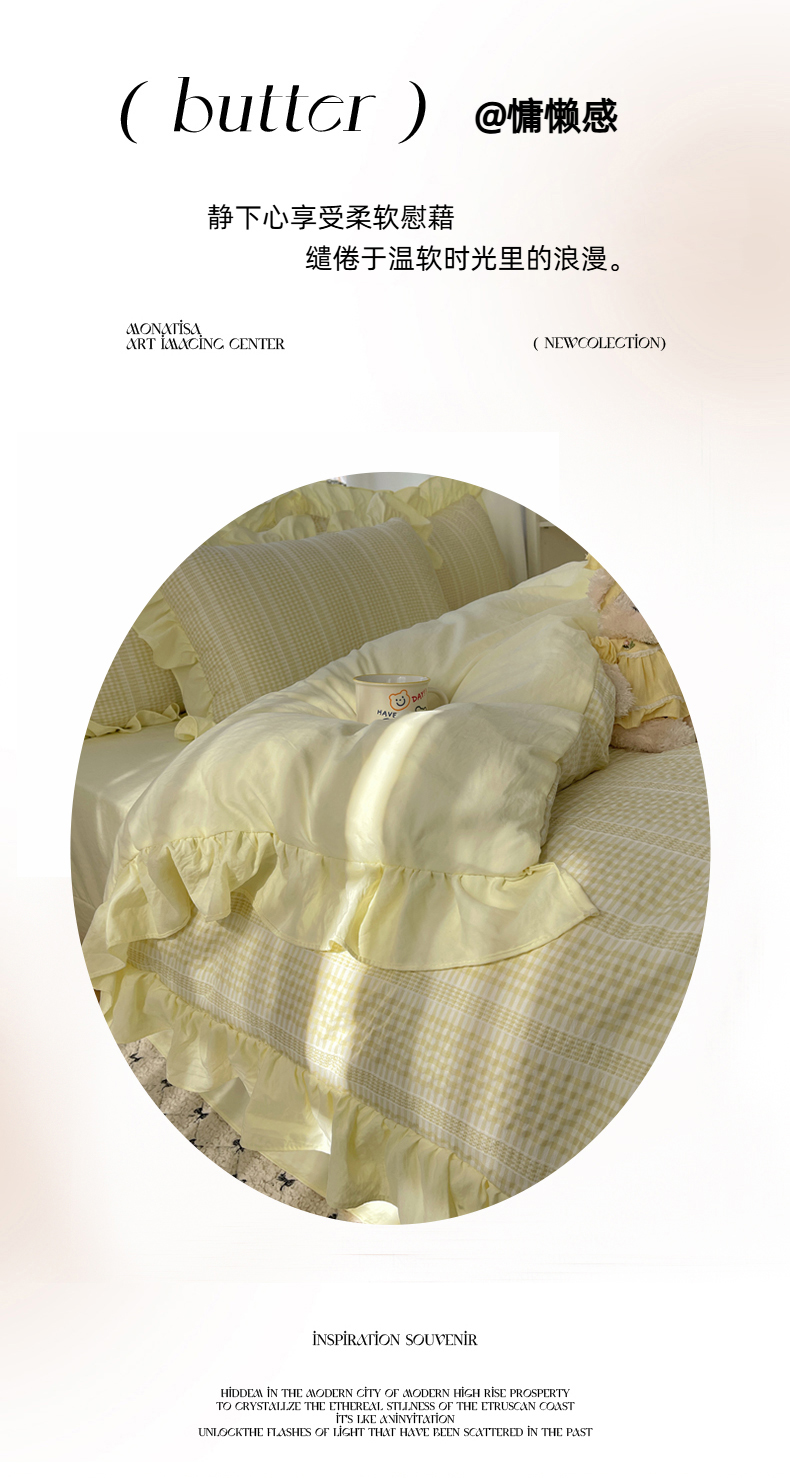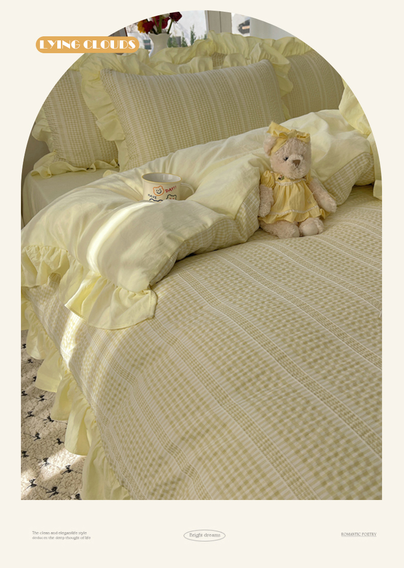 商品名称:十里居 2025新款泡泡纱提花韩版公主格水洗棉花边款四件套 柚子黄