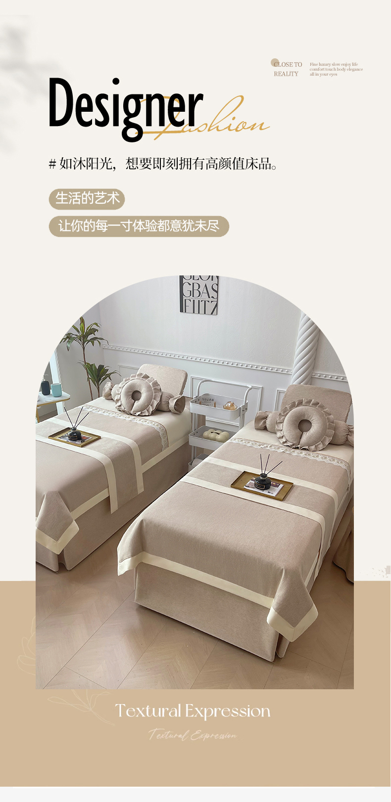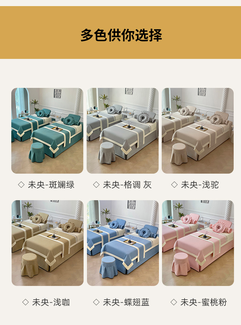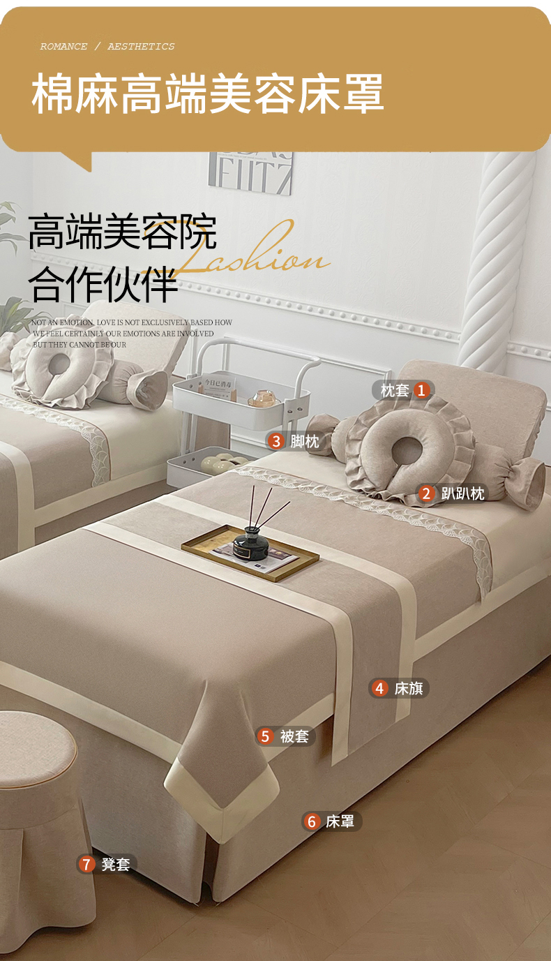 (总)芙怡 2025春夏新款8031款棉麻美容床罩四件套-未央系列,未央-蝶翅蓝,未央-格调 灰,未央-蜜桃 粉,未央-浅咖,未央-浅驼,未央-斑斓绿