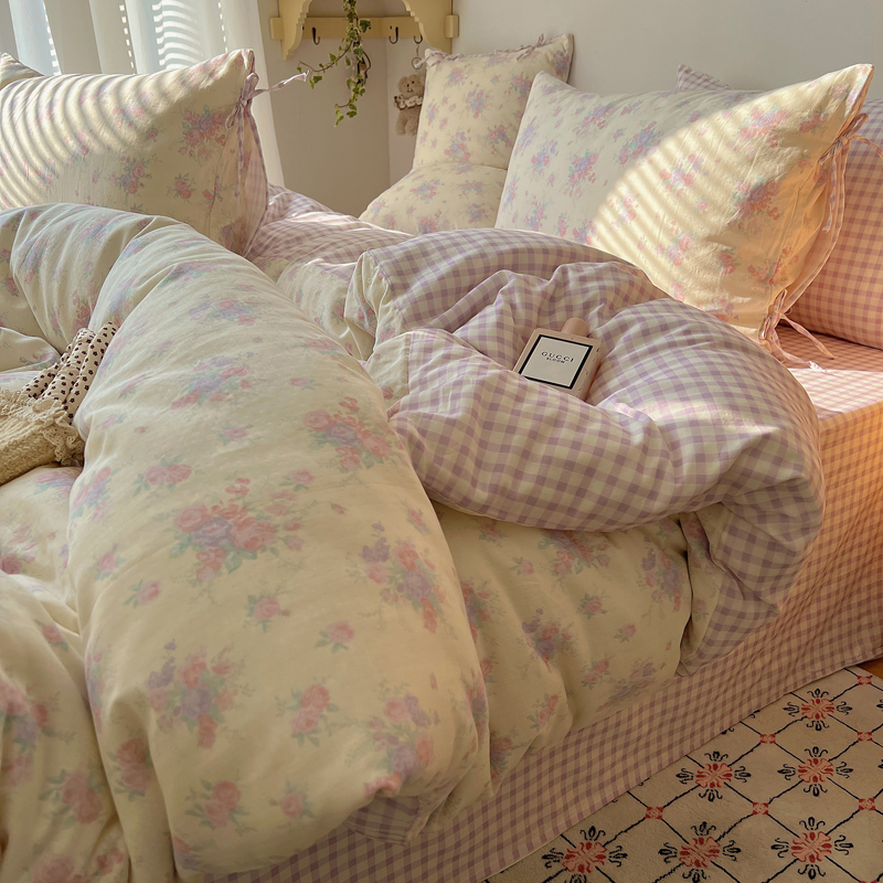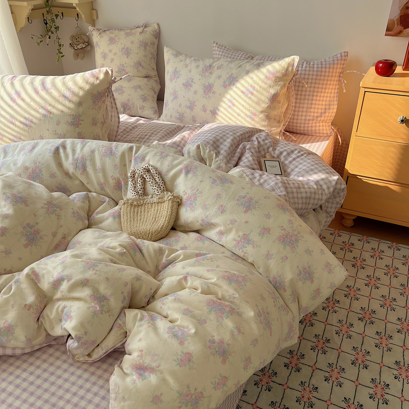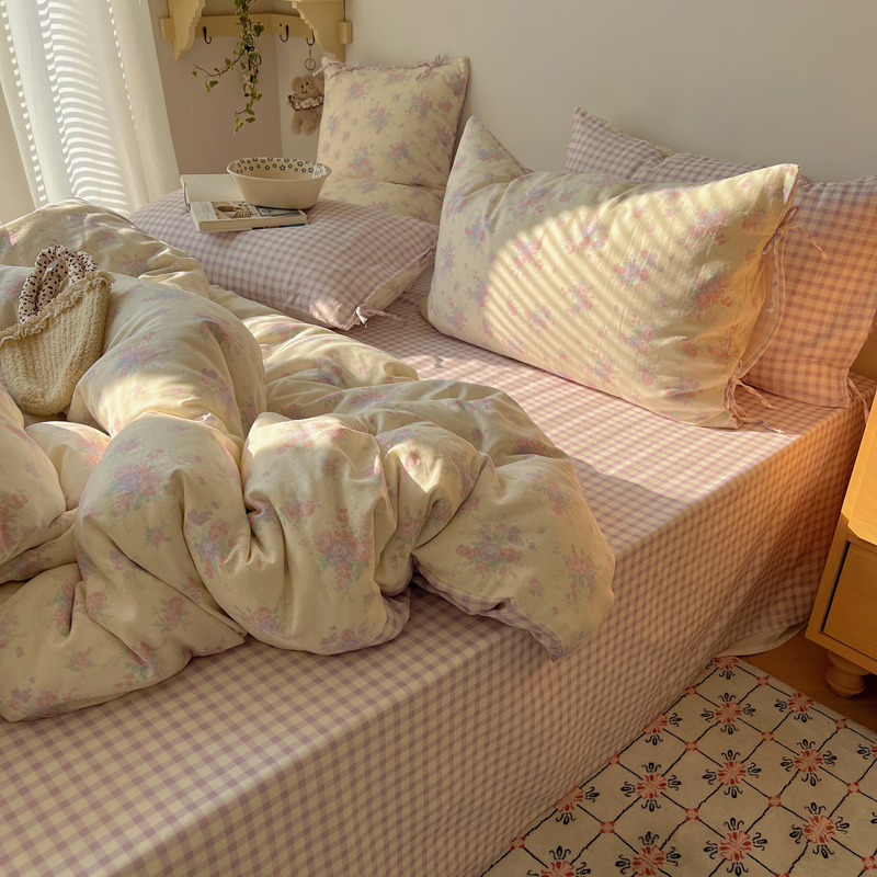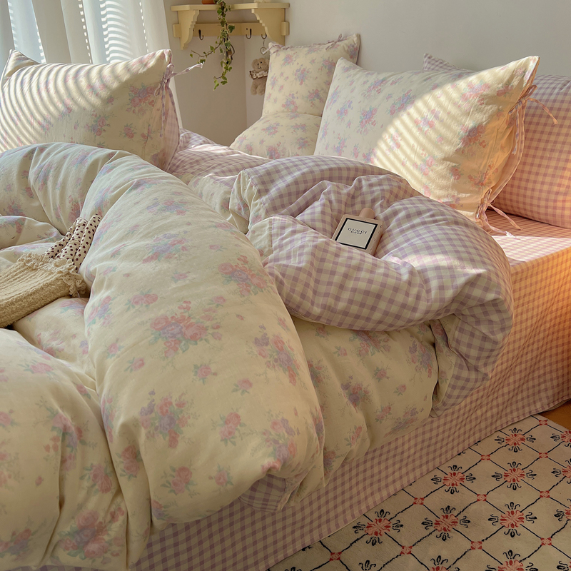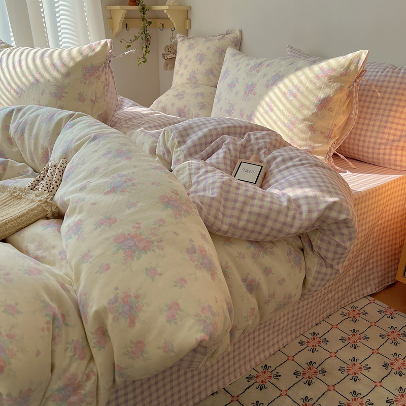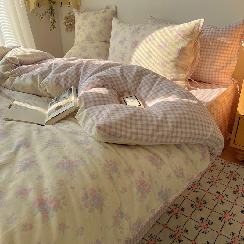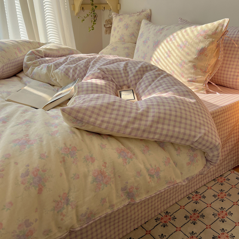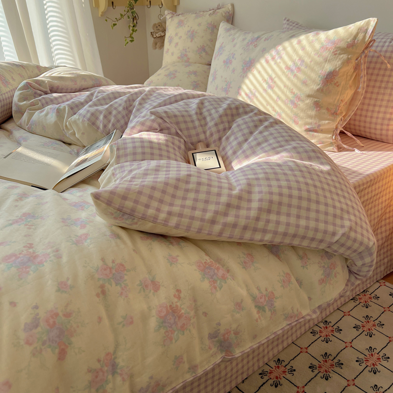商品名称:桃喜 2025双层纱碎花格子蝴蝶结系列四件套 安和桥紫格