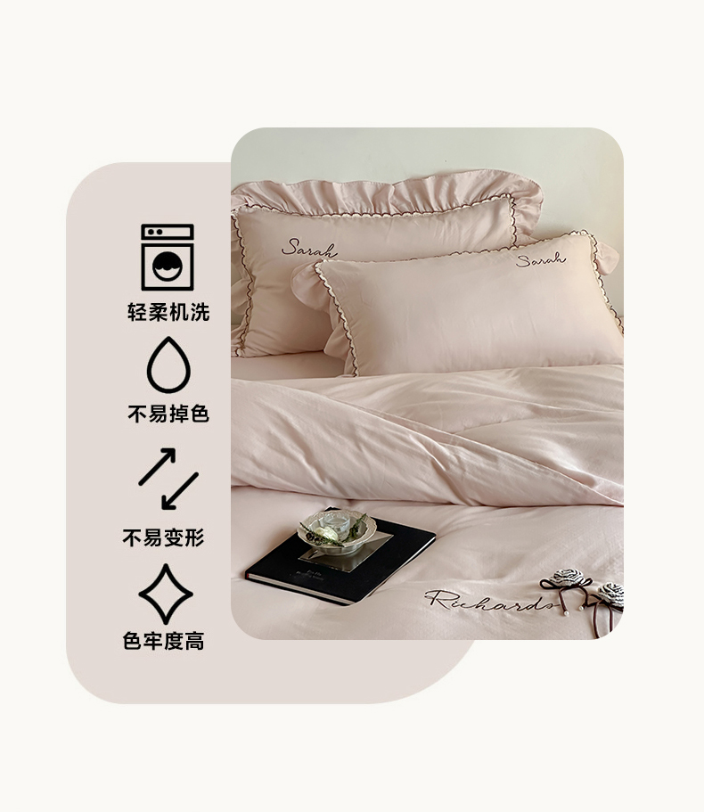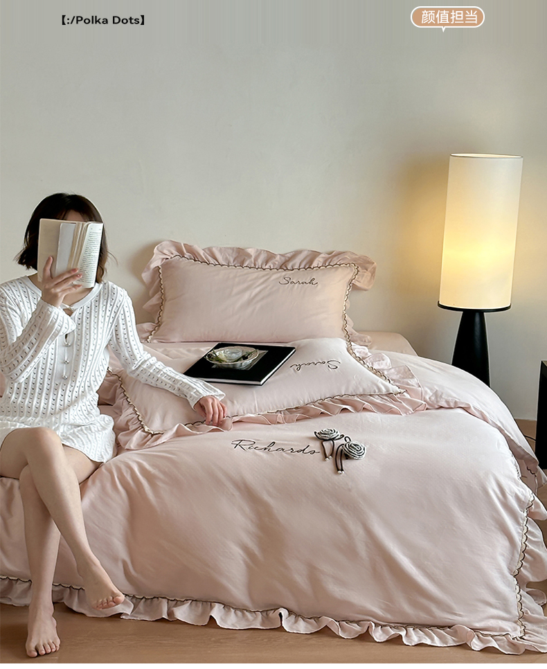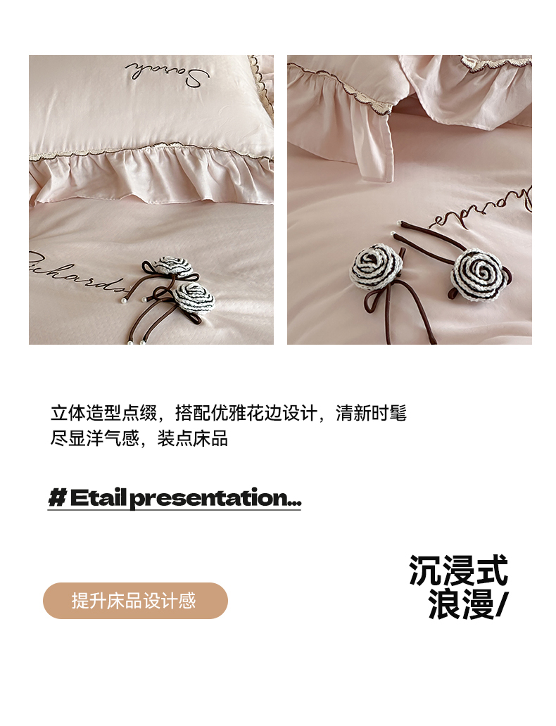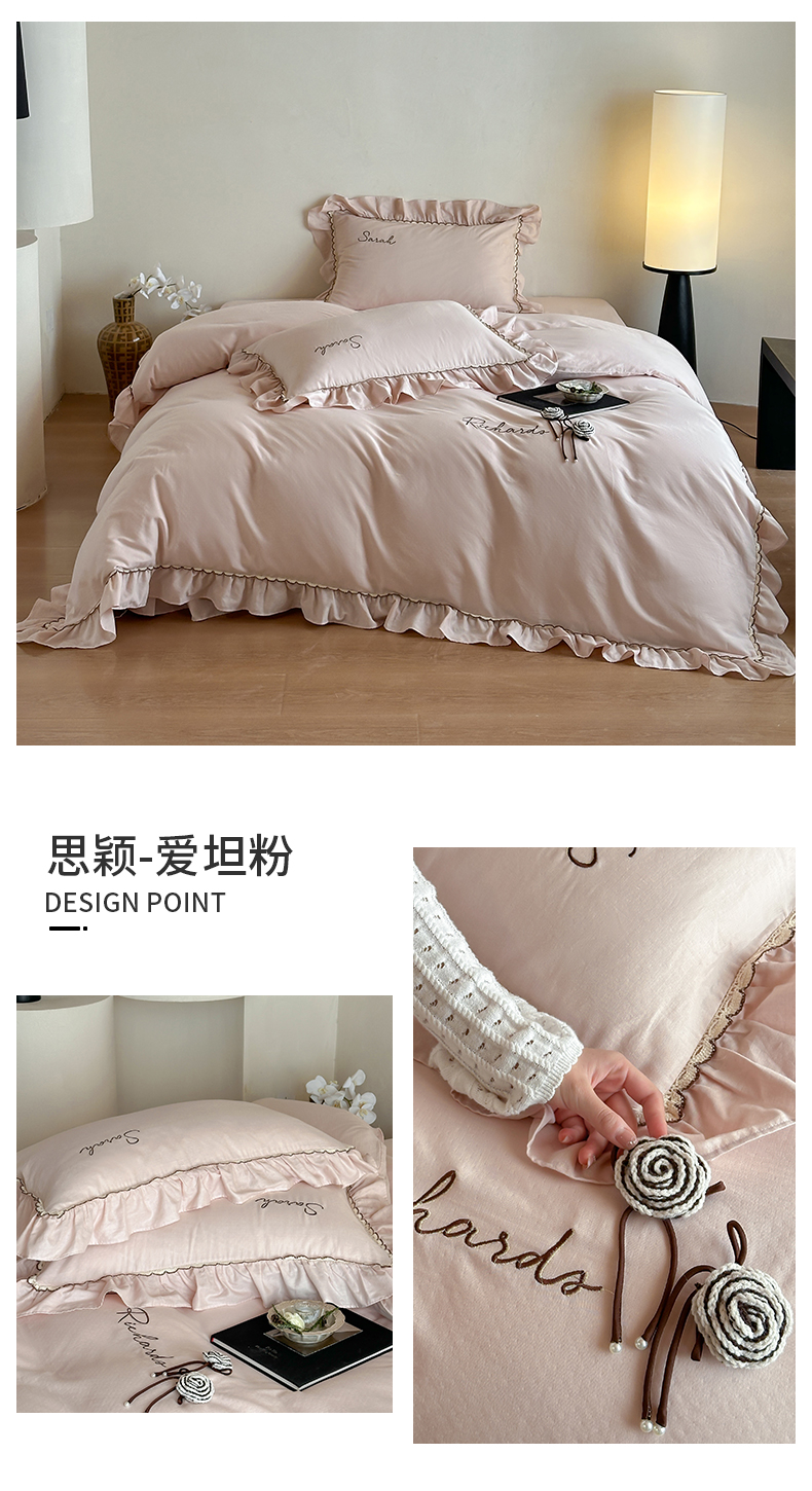 商品名称:名品优仓 2025新款纯棉水洗棉双层纱提花手工花韩版花边四件套 思颖-爱坦粉