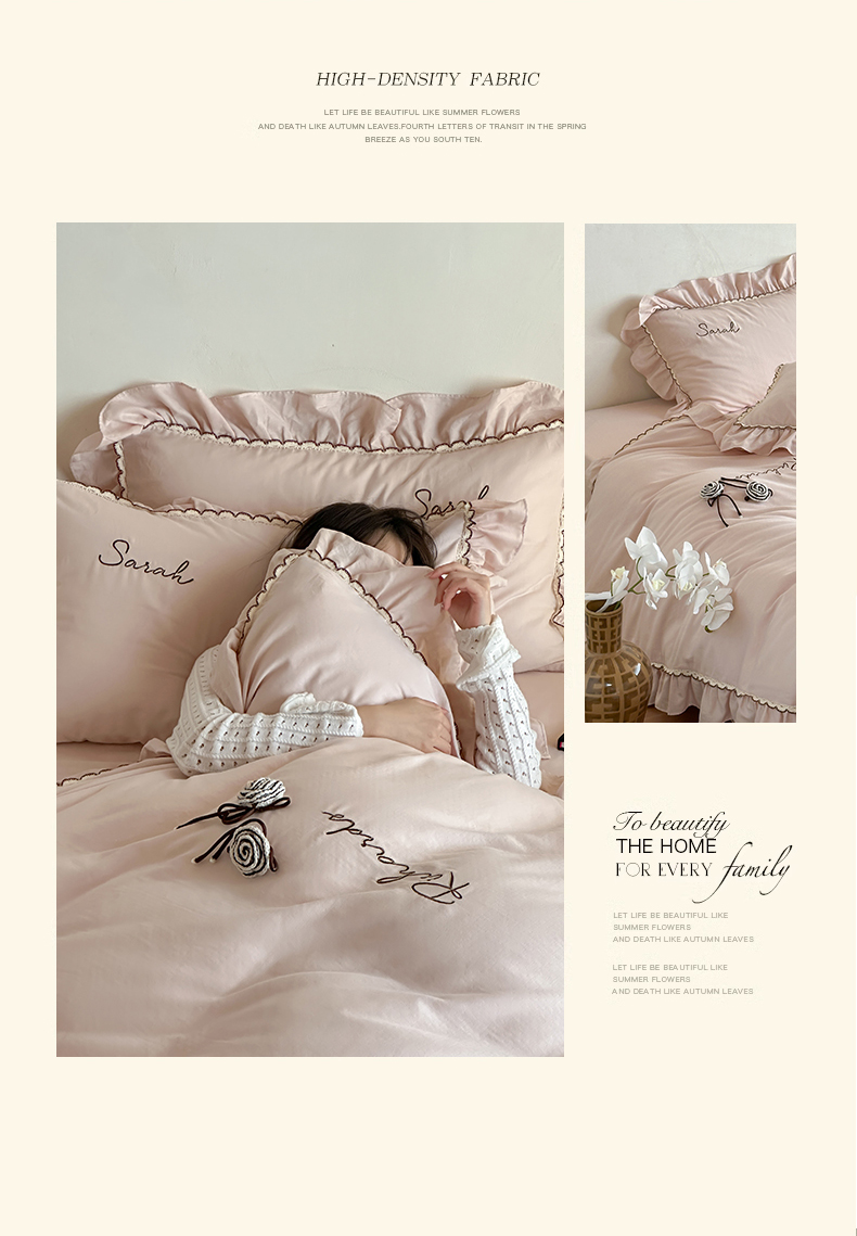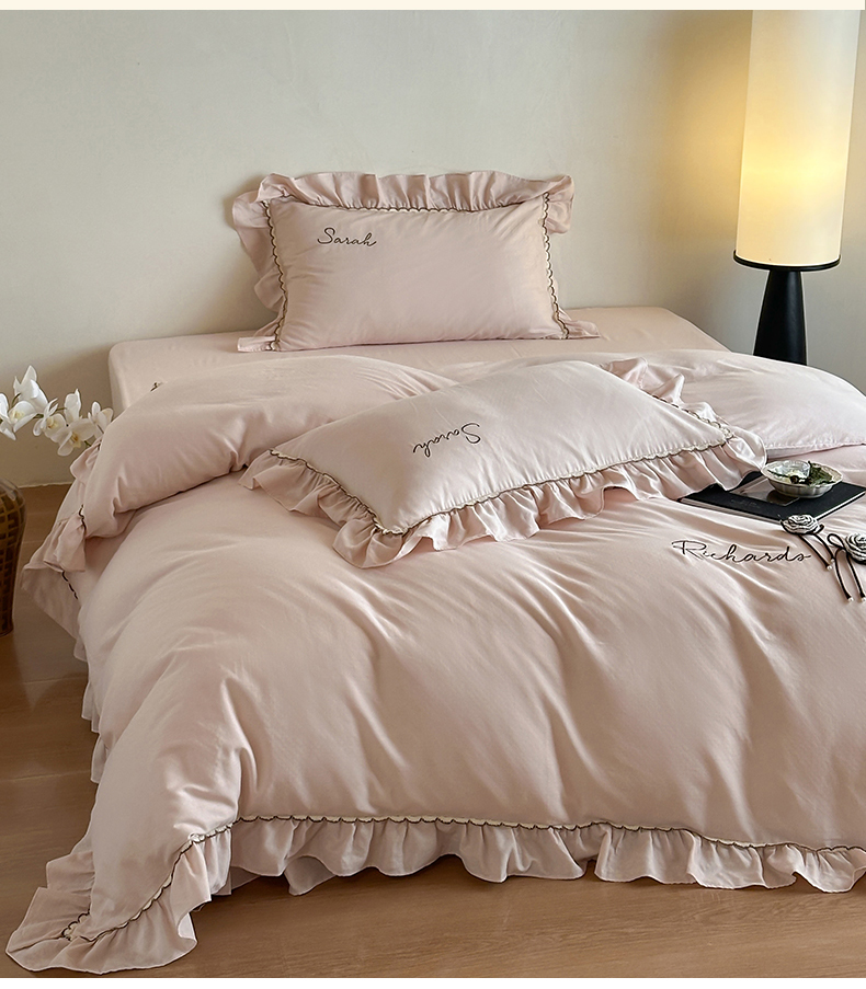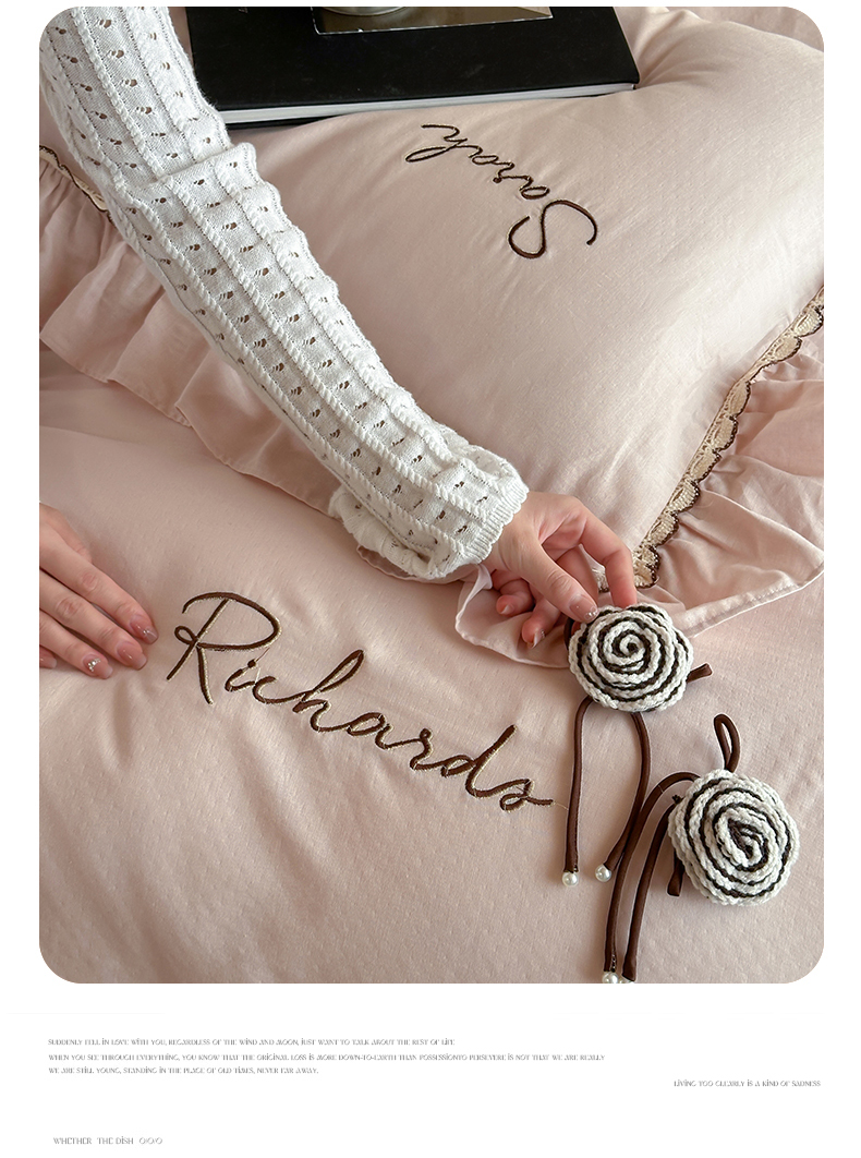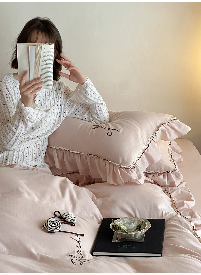 名品优仓 2025新款纯棉水洗棉双层纱提花手工花韩版花边四件套 思颖-爱坦粉