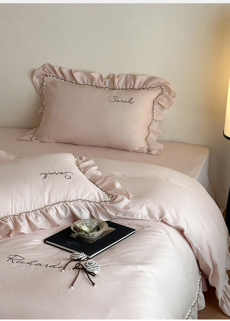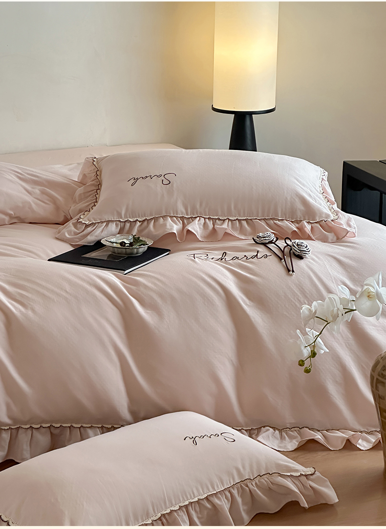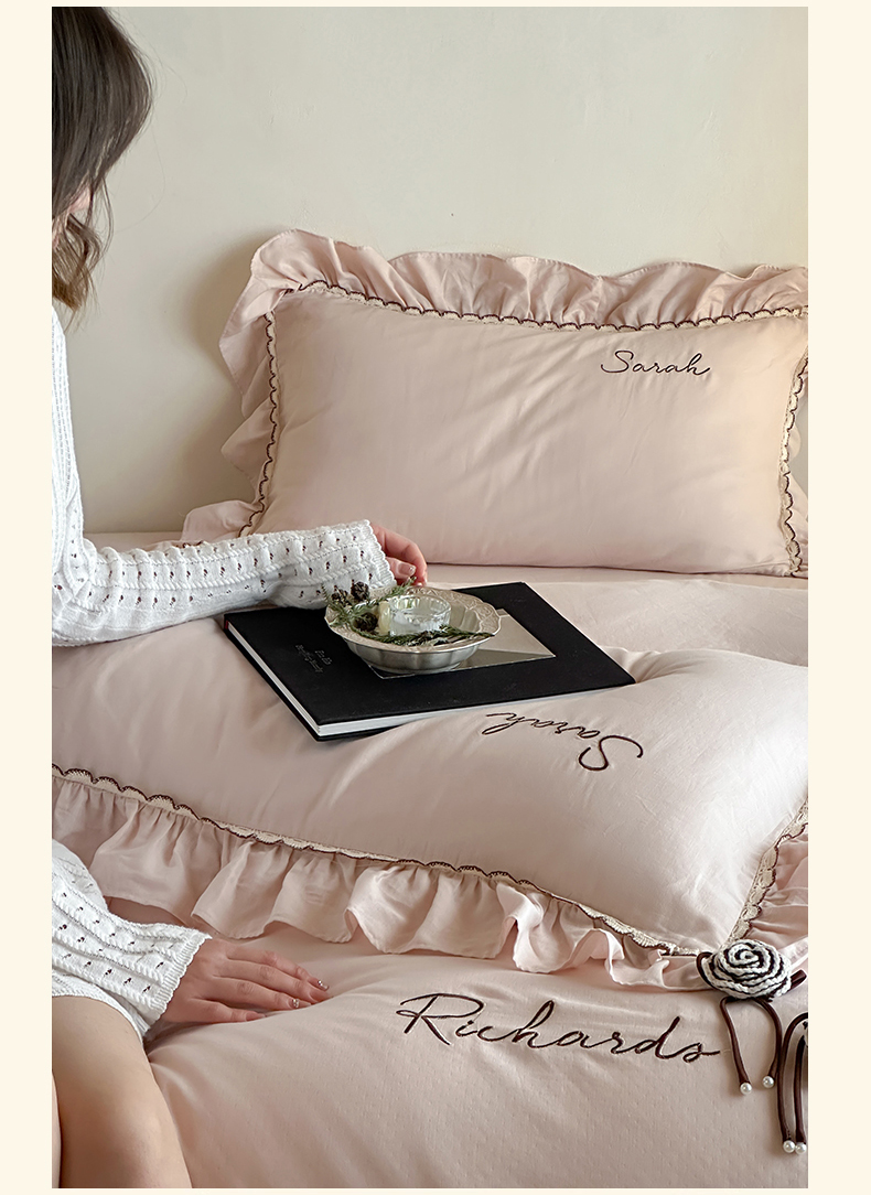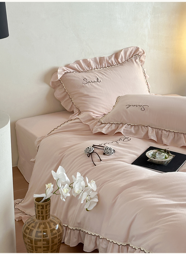 名品优仓 2025新款纯棉水洗棉双层纱提花手工花韩版花边四件套 思颖-爱坦粉