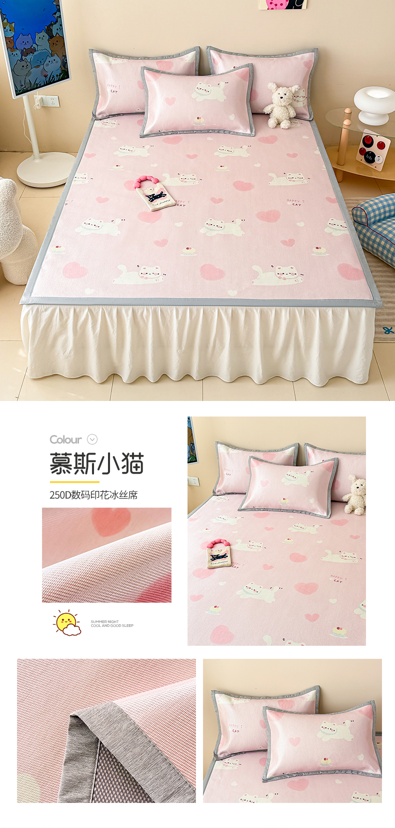 商品名称:懒猫家纺 2025春夏新款250D数码印花冰丝席凉席席子 慕斯小猫