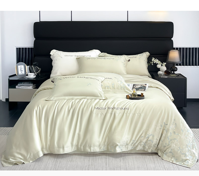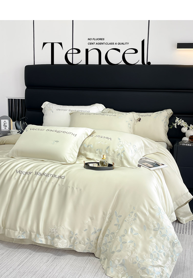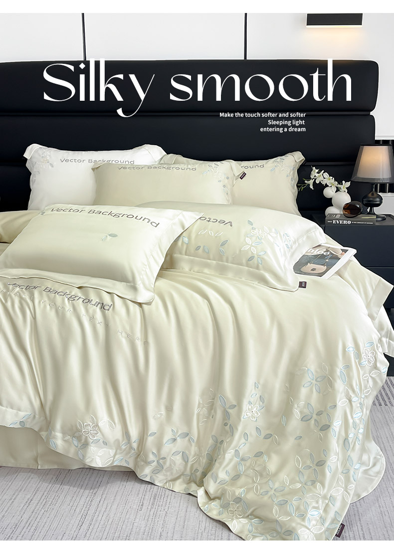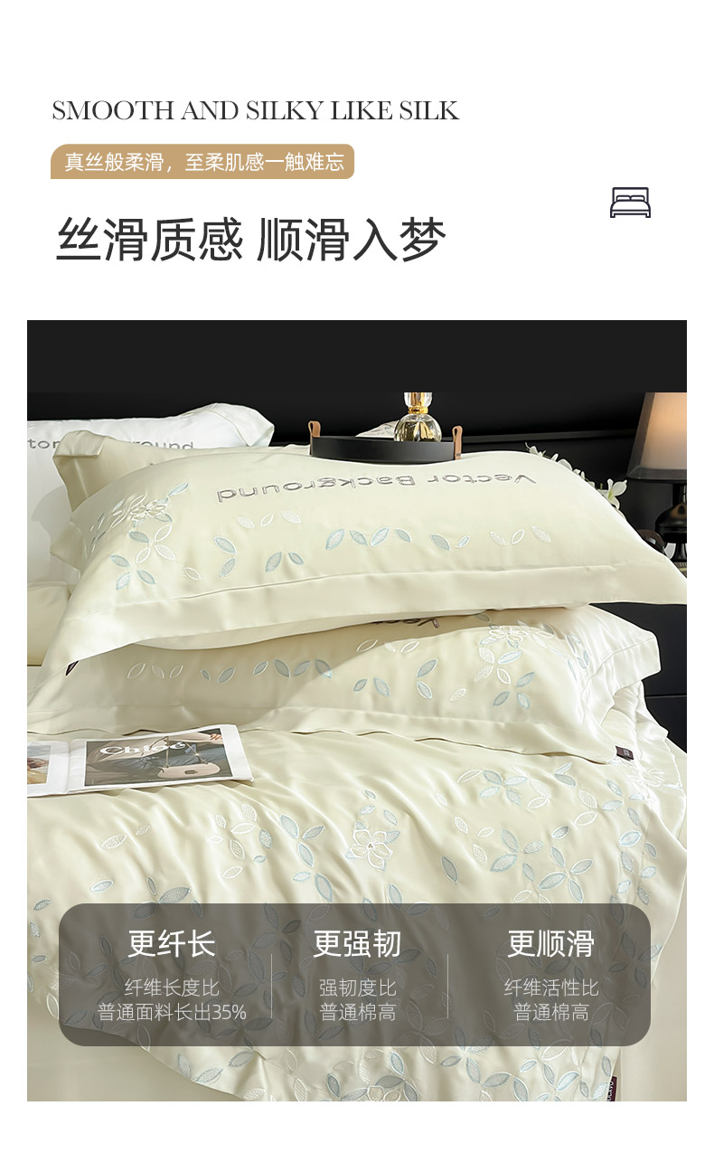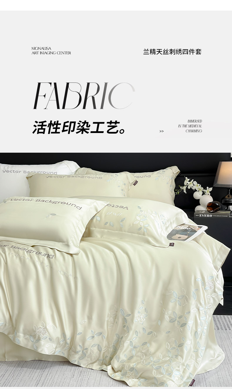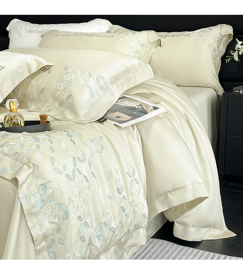 商品名称:2025新款床上用品【夏季爆款】A类兰精天丝四件套真丝重工刺绣被套高端轻奢风纯色 唐云-香草杏