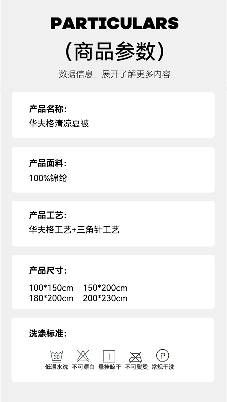 [{"sp_id":1,"sp_name":"\u989c\u8272\u5206\u7c7b","sp_format":2,"sp_list":[{"sp_value_id":652,"sp_value_name":"\u6e05\u51c9\u7c89\u7389","sp_value_image":{"id":999,"path":"https:\/\/img3.91jf.com\/ghelp\/2025\/20250417\/20250417112757_114652.jpeg"},"sp_value_video":{"id":0,"img":"","path":"","time":0,"download_num":0,"play_num":0},"price":"23.00","storage":2000,"weight":"0.500","is_check_weight":0,"plus_price":"","sp_sort":6}]},{"sp_id":27,"sp_name":"\u5c3a\u5bf8","sp_format":1,"sp_list":[{"sp_value_id":302,"sp_value_name":"100x150cm \u5355\u590f\u88ab","sp_value_image":{"id":0,"path":""},"sp_value_video":{"id":0,"img":"","path":"","time":0,"download_num":0,"play_num":0},"price":"23.00","storage":500,"weight":"0.500","is_check_weight":0,"plus_price":"","sp_sort":5},{"sp_value_id":303,"sp_value_name":"150x200cm \u5355\u590f\u88ab","sp_value_image":{"id":0,"path":""},"sp_value_video":{"id":0,"img":"","path":"","time":0,"download_num":0,"play_num":0},"price":"45.00","storage":500,"weight":"1.000","is_check_weight":0,"plus_price":"","sp_sort":6},{"sp_value_id":304,"sp_value_name":"180x200cm \u5355\u590f\u88ab","sp_value_image":{"id":0,"path":""},"sp_value_video":{"id":0,"img":"","path":"","time":0,"download_num":0,"play_num":0},"price":"52.00","storage":500,"weight":"1.200","is_check_weight":0,"plus_price":"","sp_sort":7},{"sp_value_id":305,"sp_value_name":"200x230cm \u5355\u590f\u88ab","sp_value_image":{"id":0,"path":""},"sp_value_video":{"id":0,"img":"","path":"","time":0,"download_num":0,"play_num":0},"price":"60.00","storage":500,"weight":"1.500","is_check_weight":0,"plus_price":"","sp_sort":8}]}]