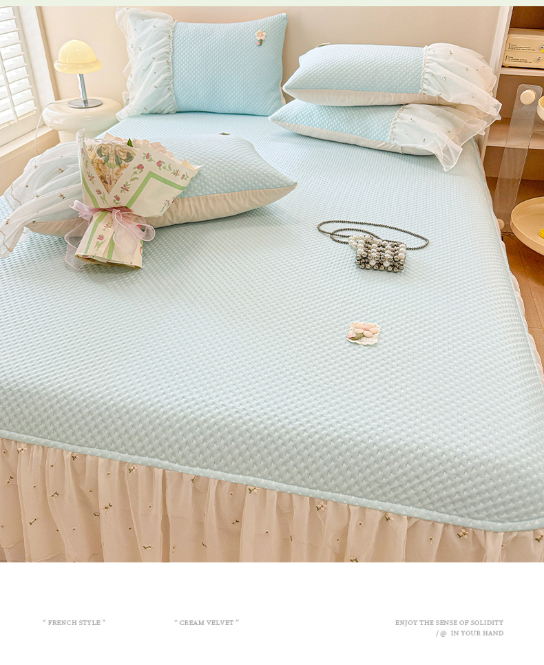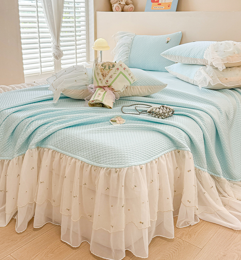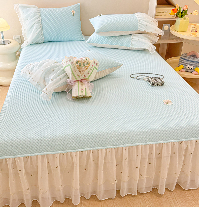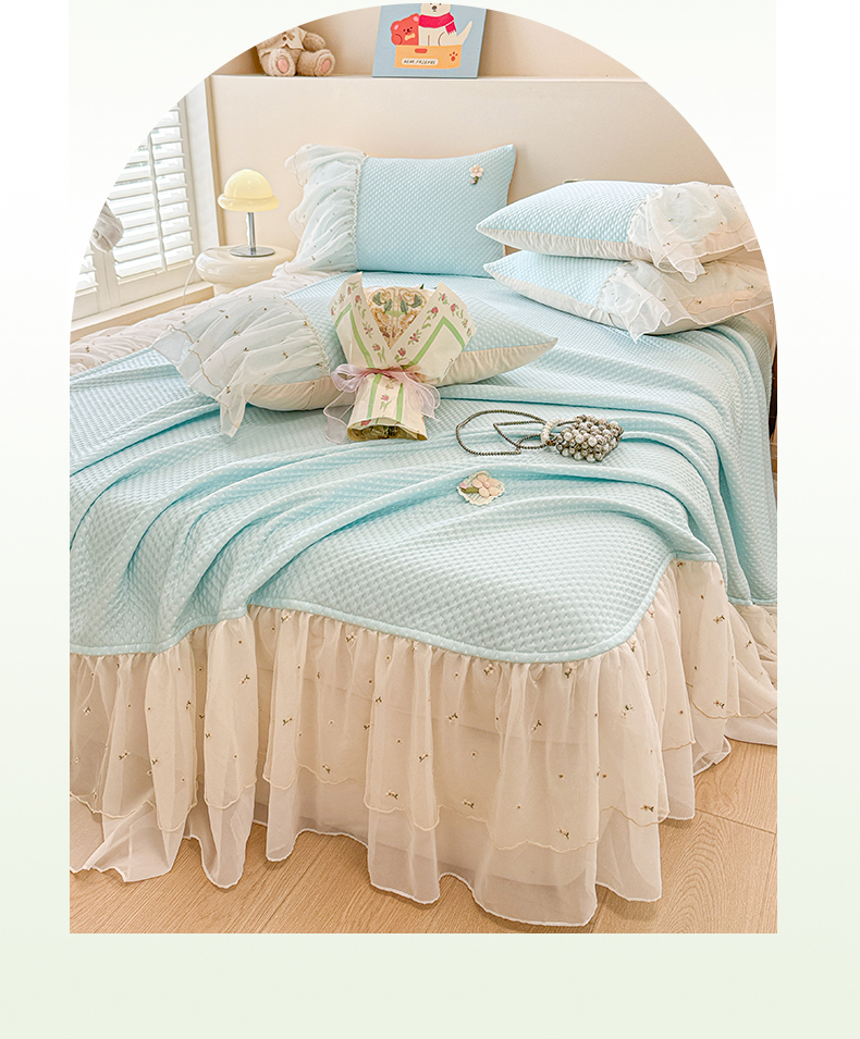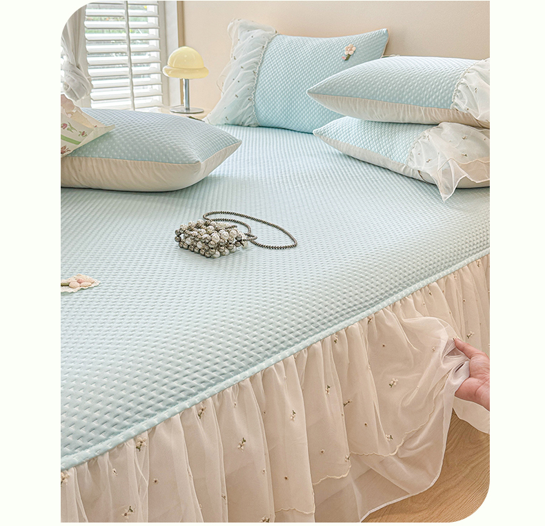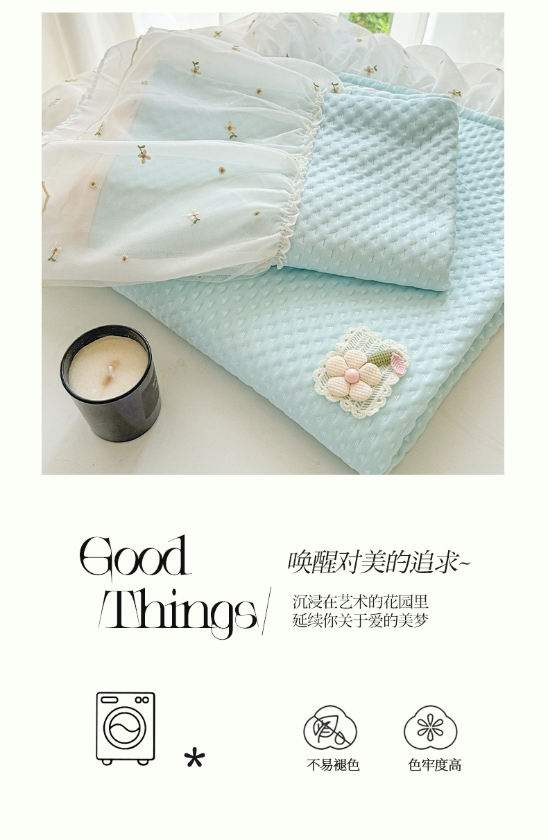 商品名称:蓝邻家纺 2025春夏新款PE提花雪纺+绣花花边凉席席子 夏花-蓝