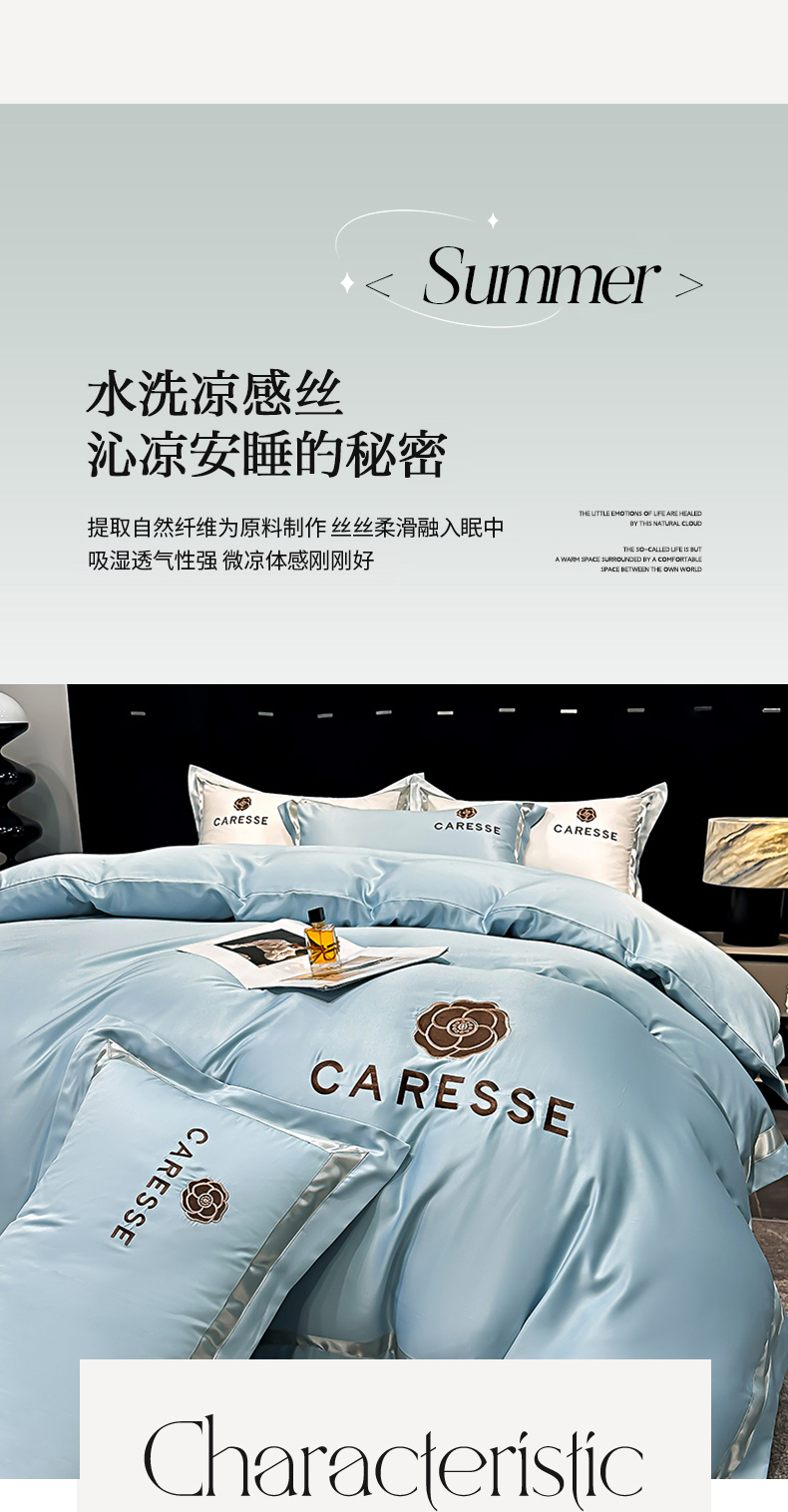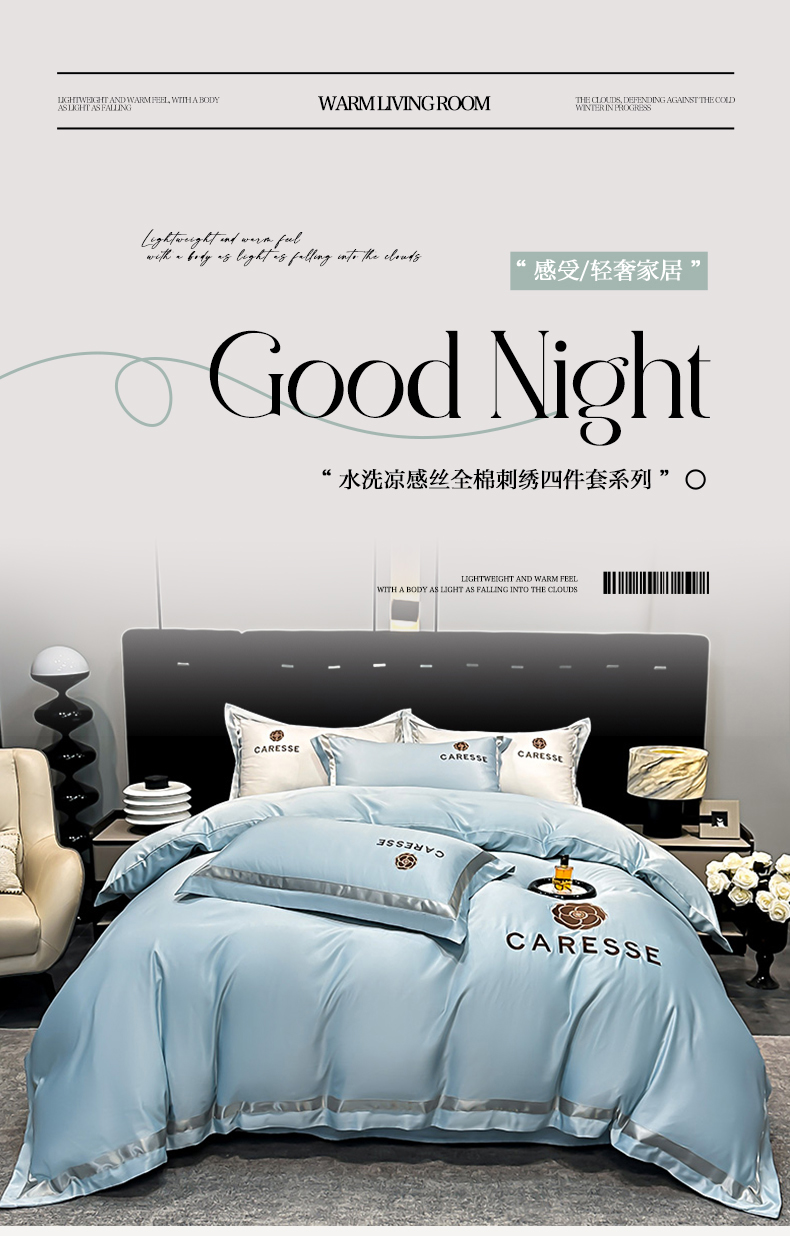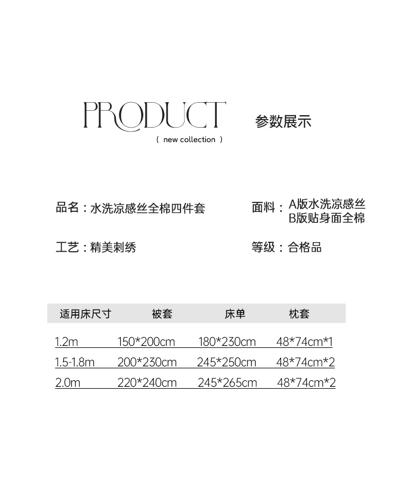 商品名称:妮恒美家纺 2025新款A版水洗真丝天丝B版纯棉刺绣绣花四件套全棉被套床单床笠款四件套 梦恋-海蓝灰