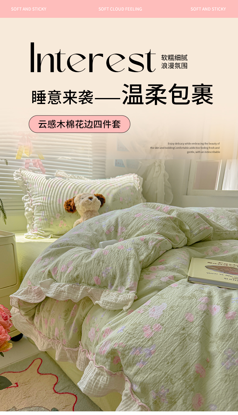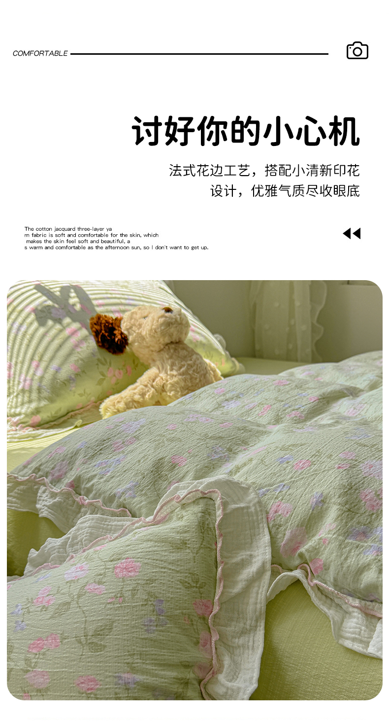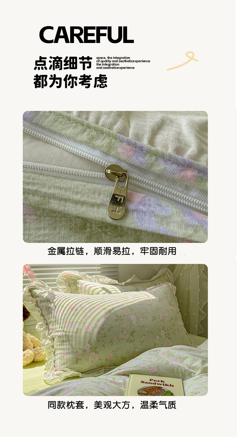 当前位置: 91家纺网 > 商品网购 > 床品套件 > 四件套 > 提花四件套 > 繁花家居 2025新款云感棉提花学生季超温柔小花边四件套 叶雨浪漫