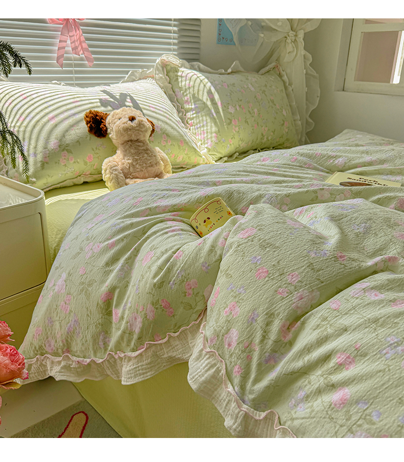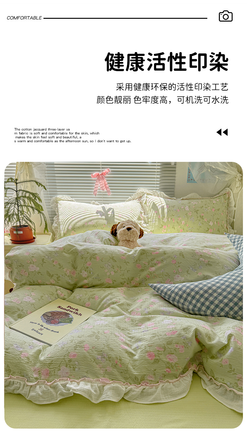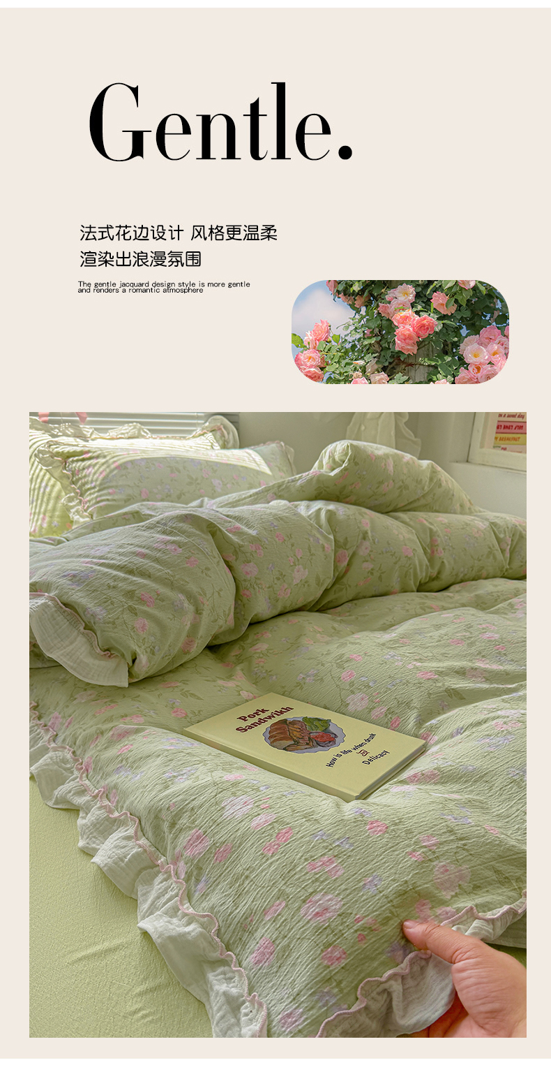 当前位置: 91家纺网 > 商品网购 > 床品套件 > 四件套 > 提花四件套 > 繁花家居 2025新款云感棉提花学生季超温柔小花边四件套 叶雨浪漫