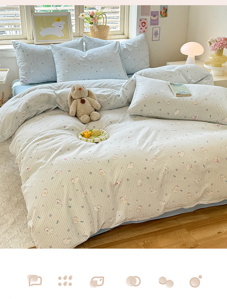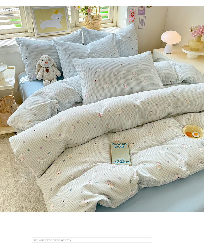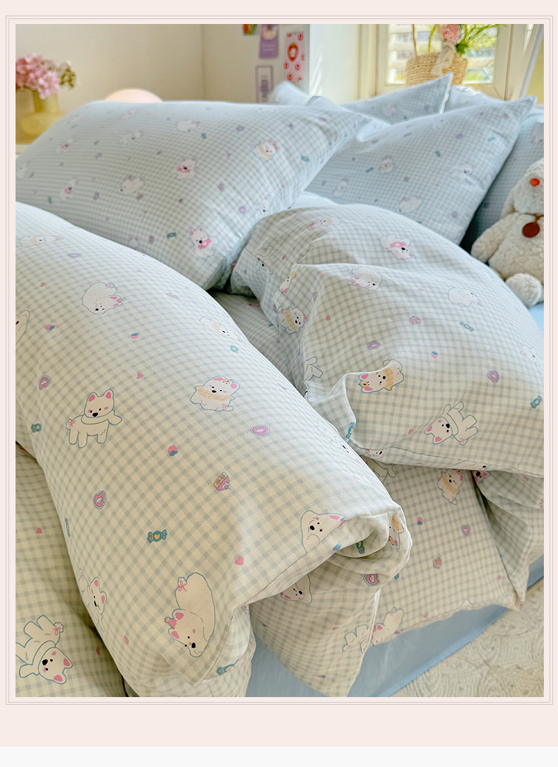 (总)多品家纺 2026新款奶呼呼超柔云感双层纱系列四件套,白露紫,半岛兰格,半岛紫格,豹纹猫咪,粉粉小花,福气满满,花田小狗,欢乐时光,开心狗,棉花兔兔,浅浅春意,桃气兔兔,淘气园,汪星人,小橘狗,熊多多,熊熊空间,学院派,樱桃蓝,樱桃紫
