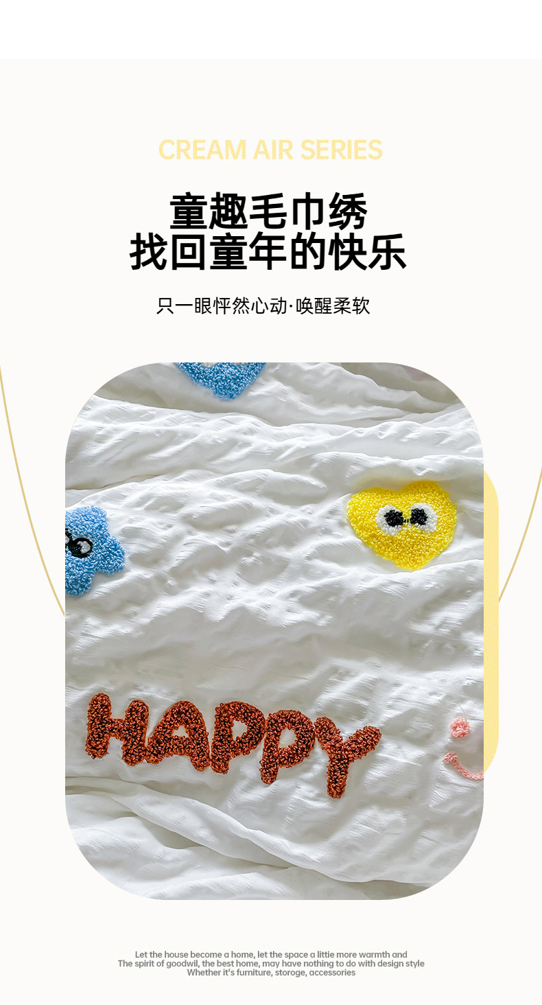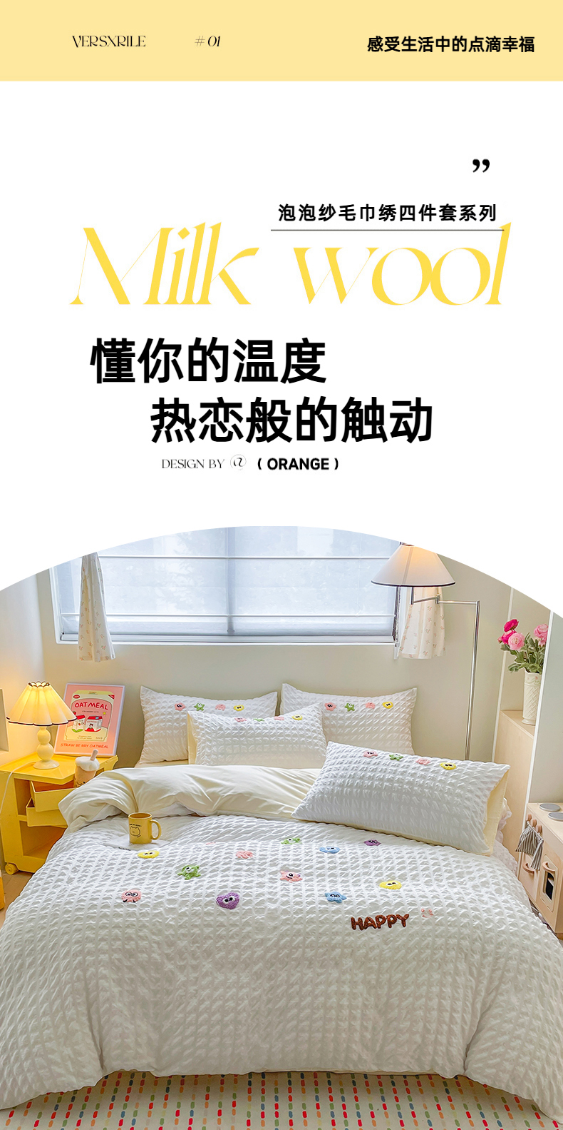 千希家纺 2025新款高克重超柔泡泡纱毛巾绣泡芙精灵系列四件套 泡芙精灵-月牙白