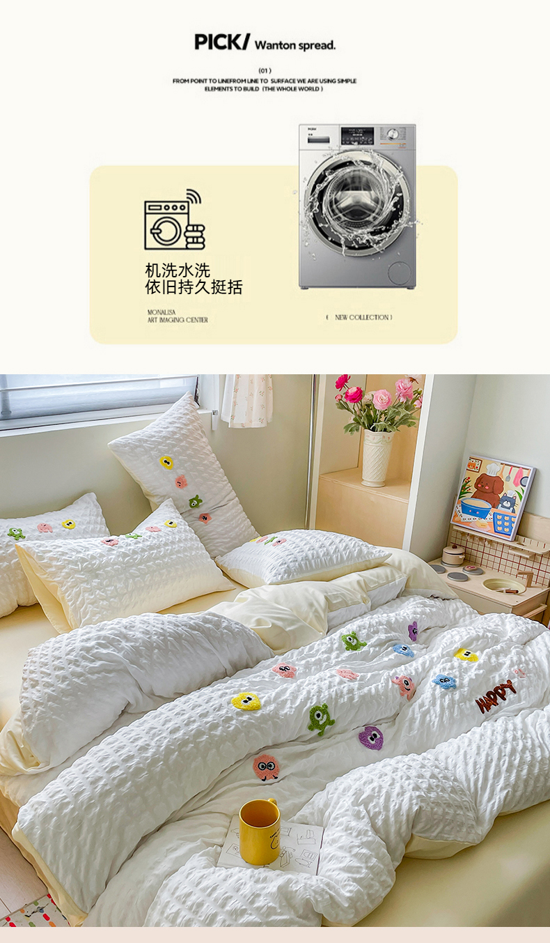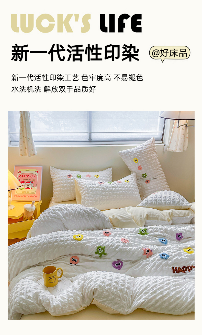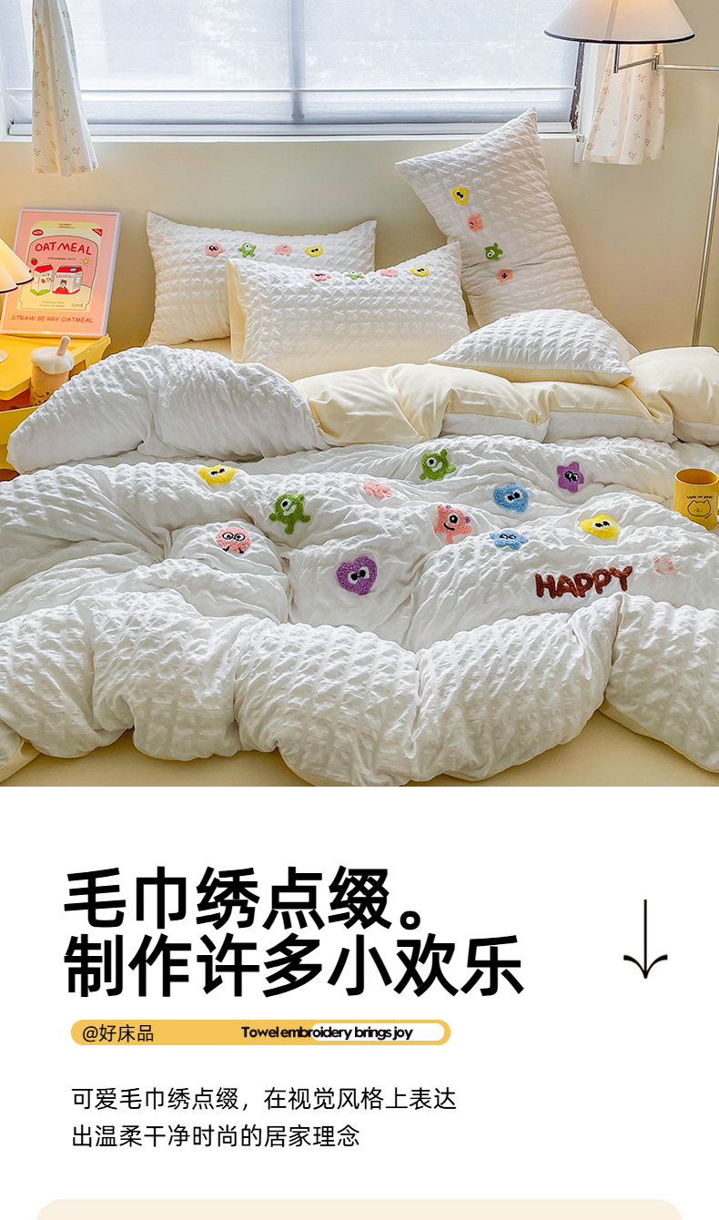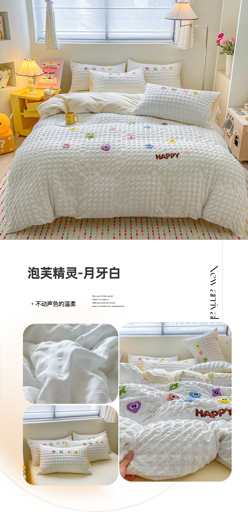 商品名称:千希家纺 2025新款高克重超柔泡泡纱毛巾绣泡芙精灵系列四件套 泡芙精灵-月牙白