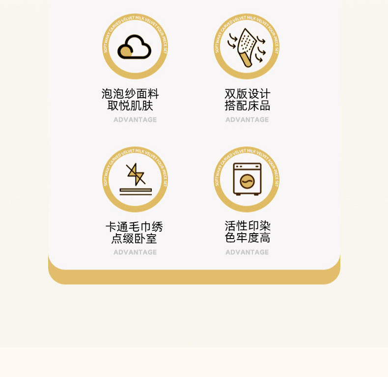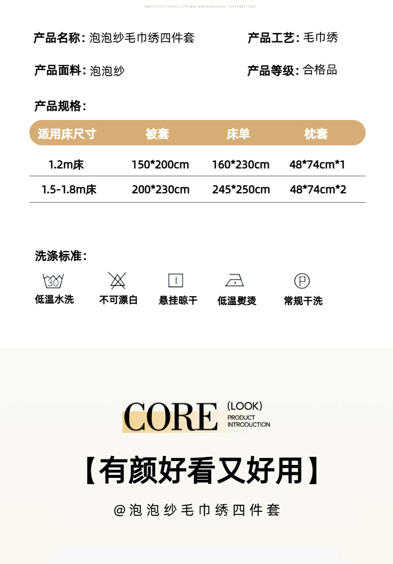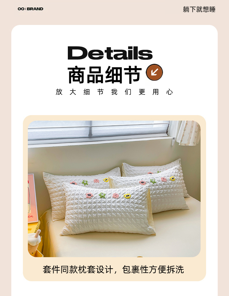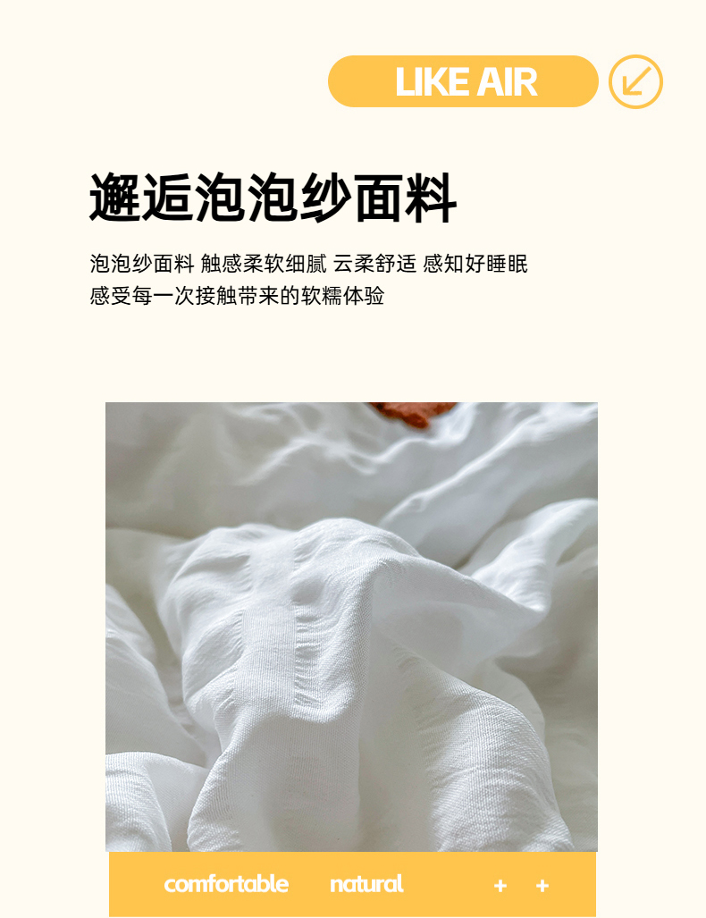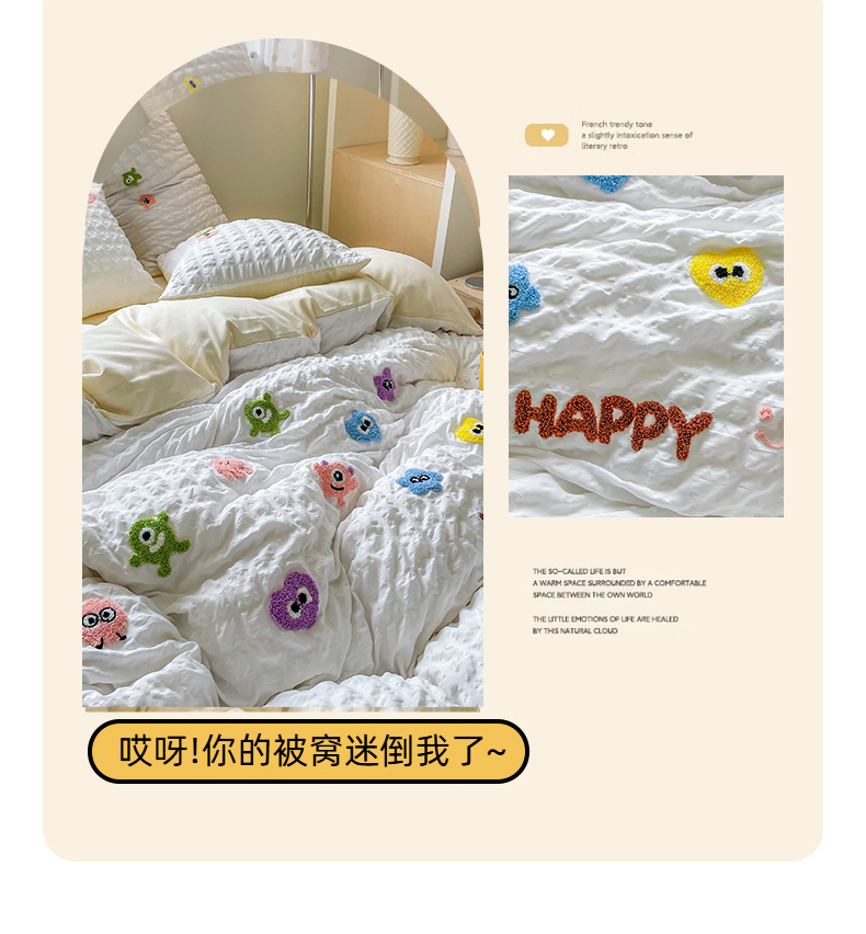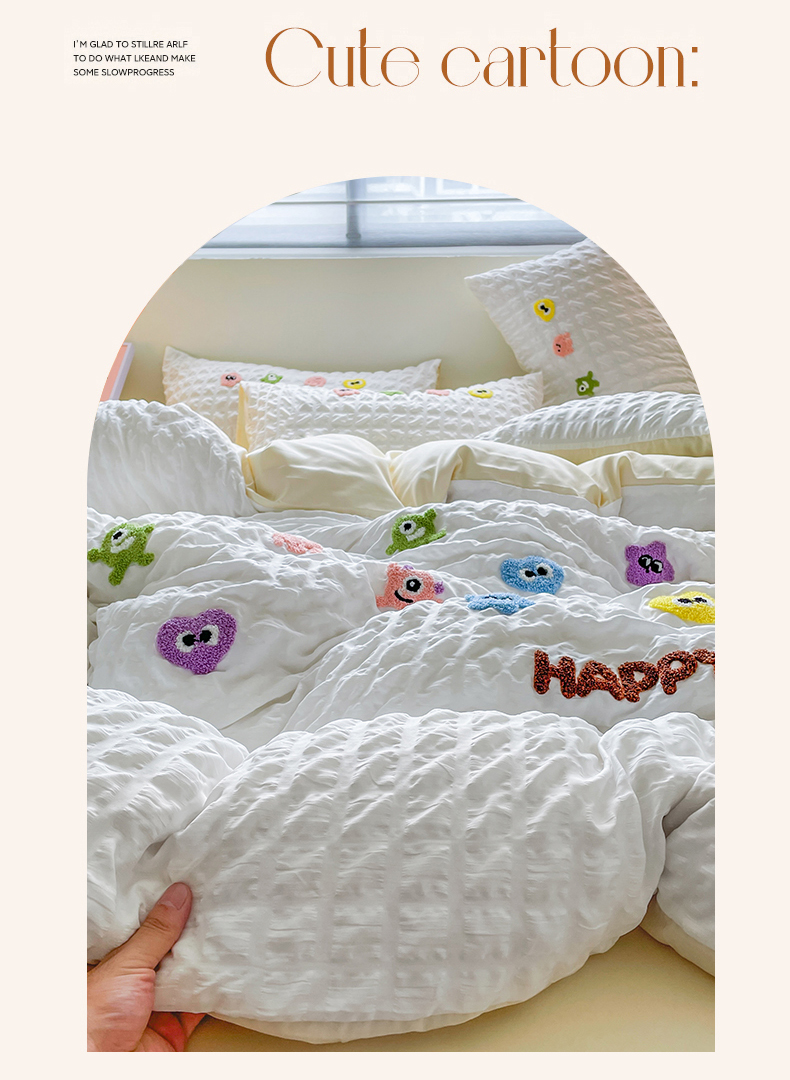 商品名称:千希家纺 2025新款高克重超柔泡泡纱毛巾绣泡芙精灵系列四件套 泡芙精灵-月牙白