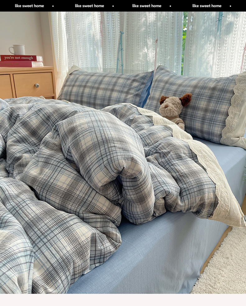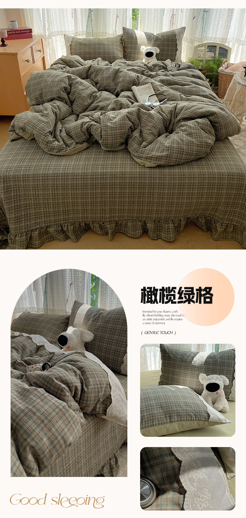 当前位置: 91家纺网 > 商品网购 > 床品套件 > 四件套 > 其它四件套 > 轻奢坊 2025新款125g高克重皱皱撒欢复古格子蕾丝花边四件套 复古炭黑