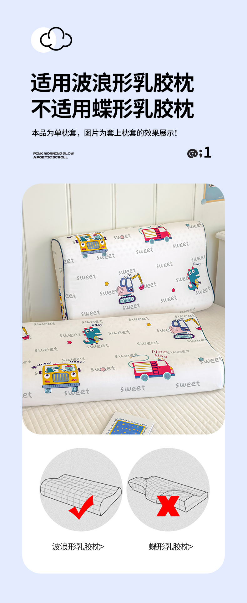 (总)良佐生活 2023新款A类60支全棉贡缎乳胶枕枕套儿童橡胶枕头套高低,口袋熊,恐龙宝宝,开心熊 粉,冰淇淋,恐龙乐园,花仙兔,贝塔 粉,挖掘车