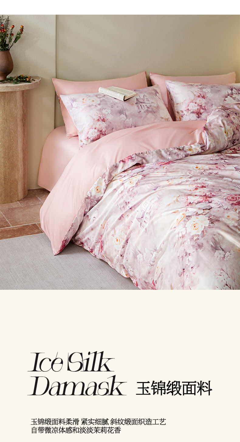 麦田家纺 2025新款A类冰丝天丝玉锦缎印花四件套 梦丽雅仙豆沙