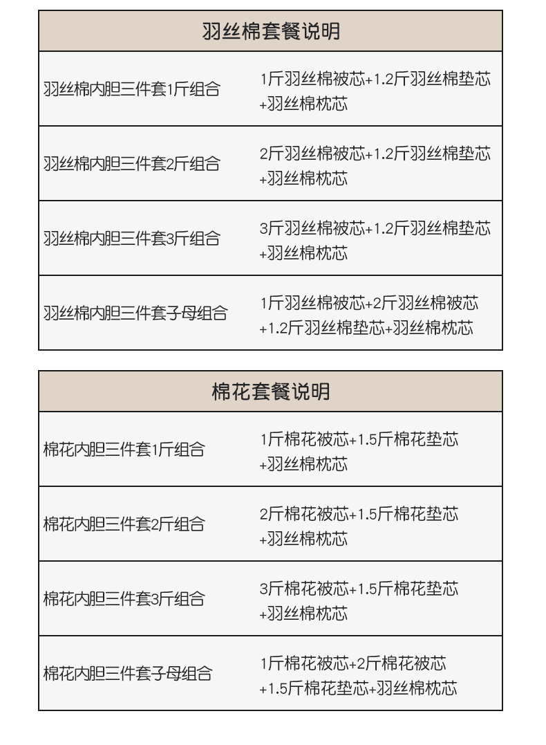 羽丝2斤被芯+1.2斤垫芯+羽丝枕 | ¥42.00 |