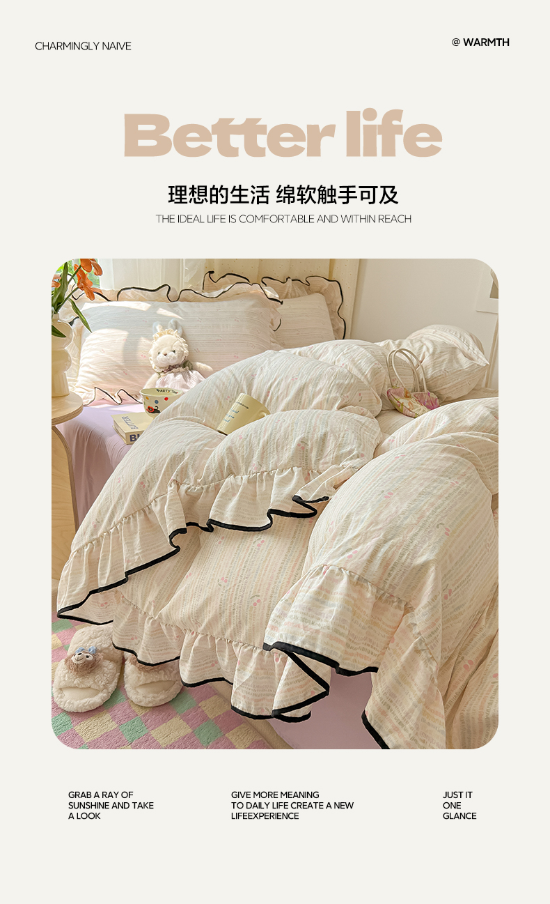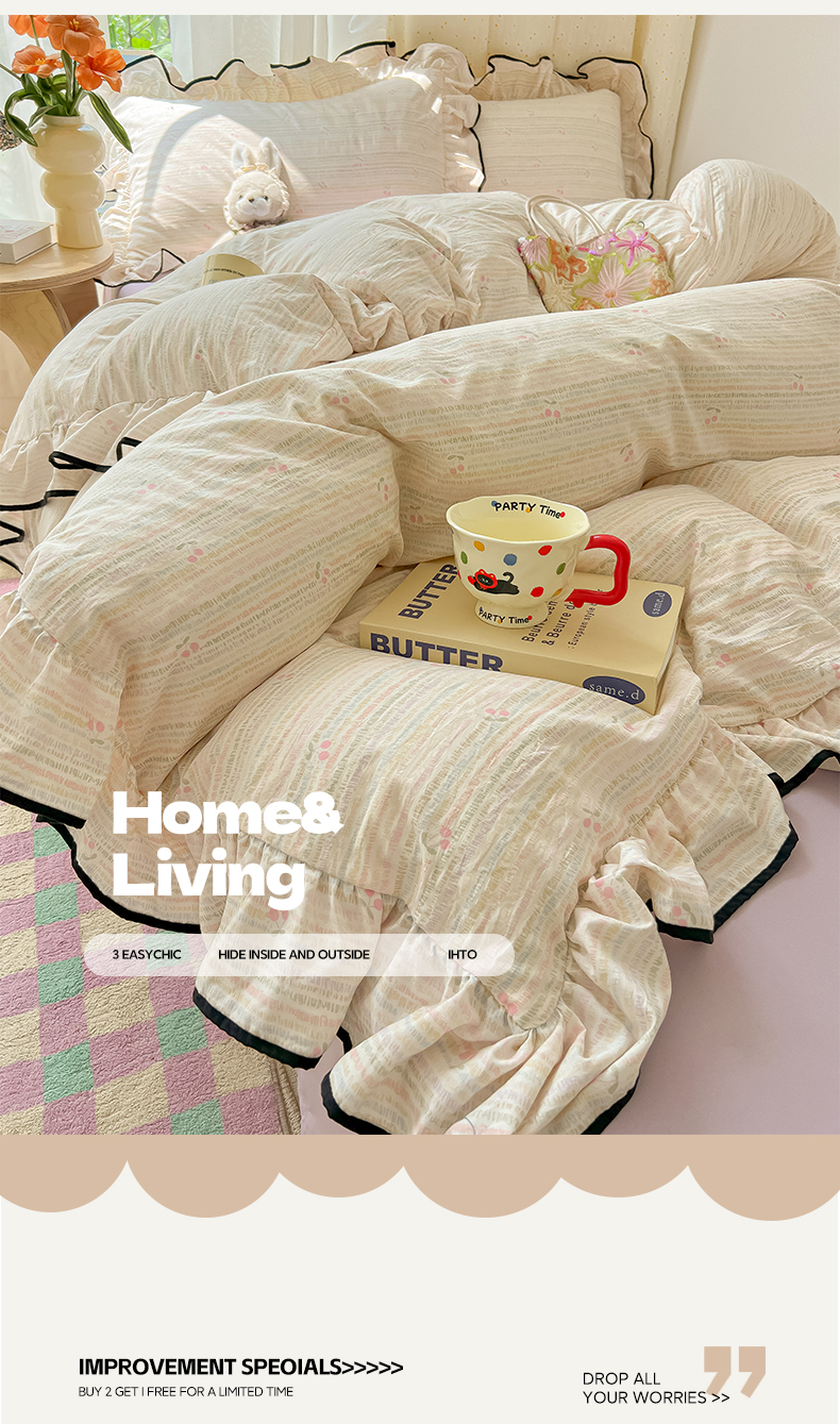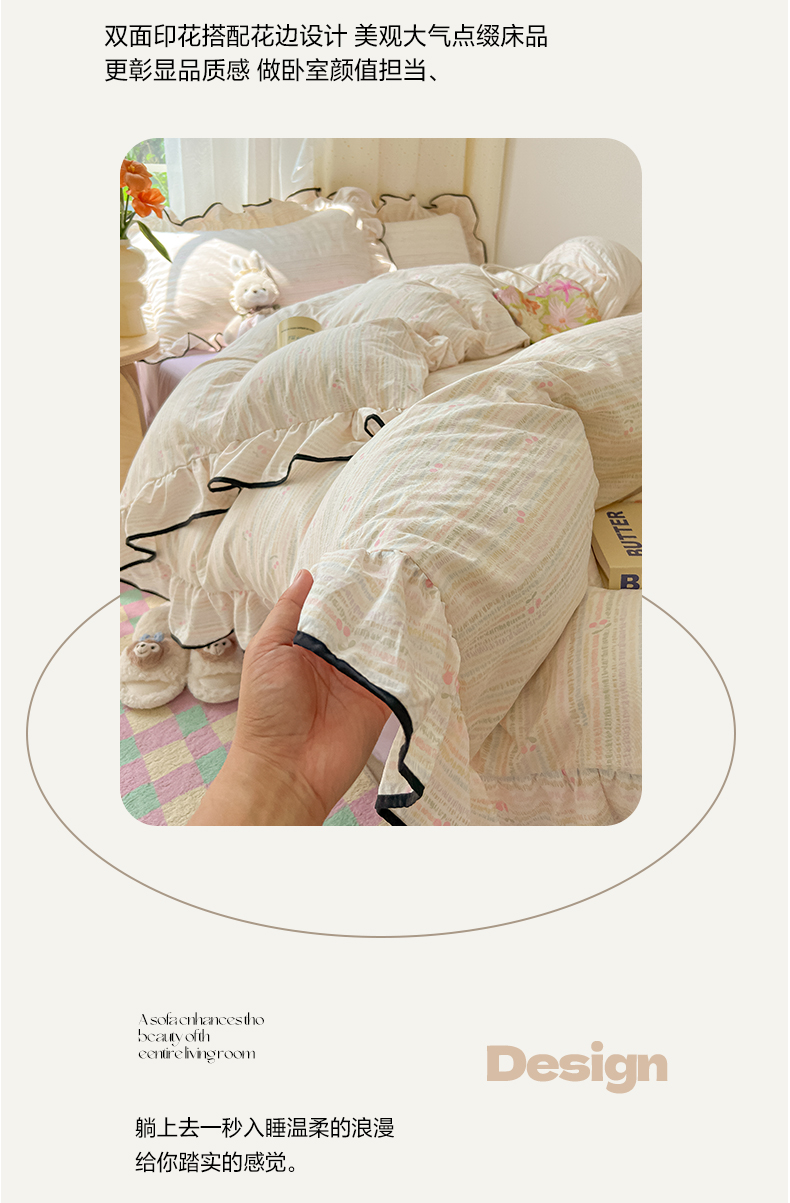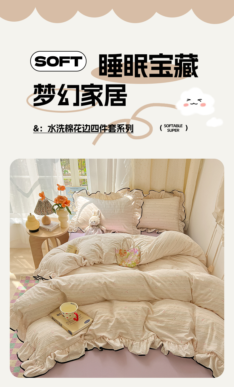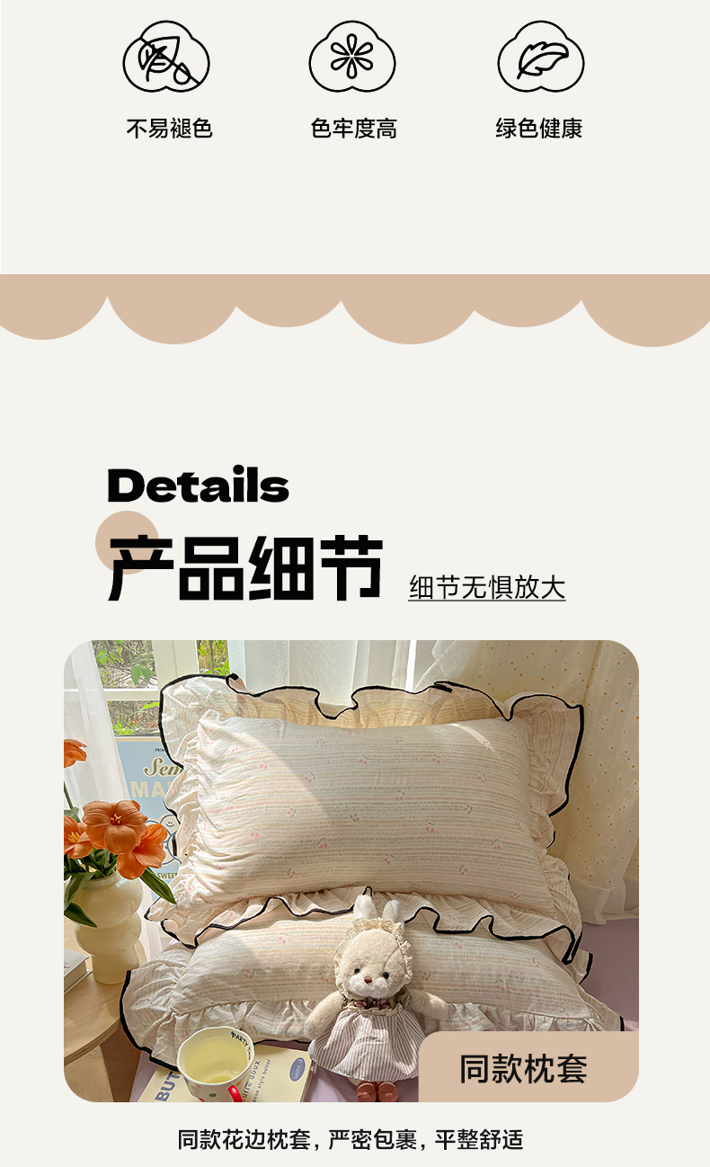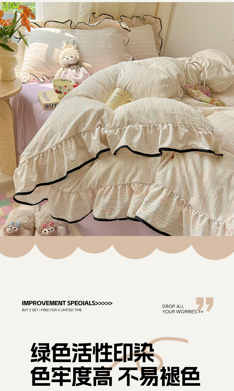 当前位置: 91家纺网 > 商品网购 > 床品套件 > 四件套 > 其它四件套 > 韩巢家纺 2025新款水洗棉大花边被套四件套直播热销款学生宿舍被罩床单三件套(提供卖家秀) 甜樱恋曲【大花边款】