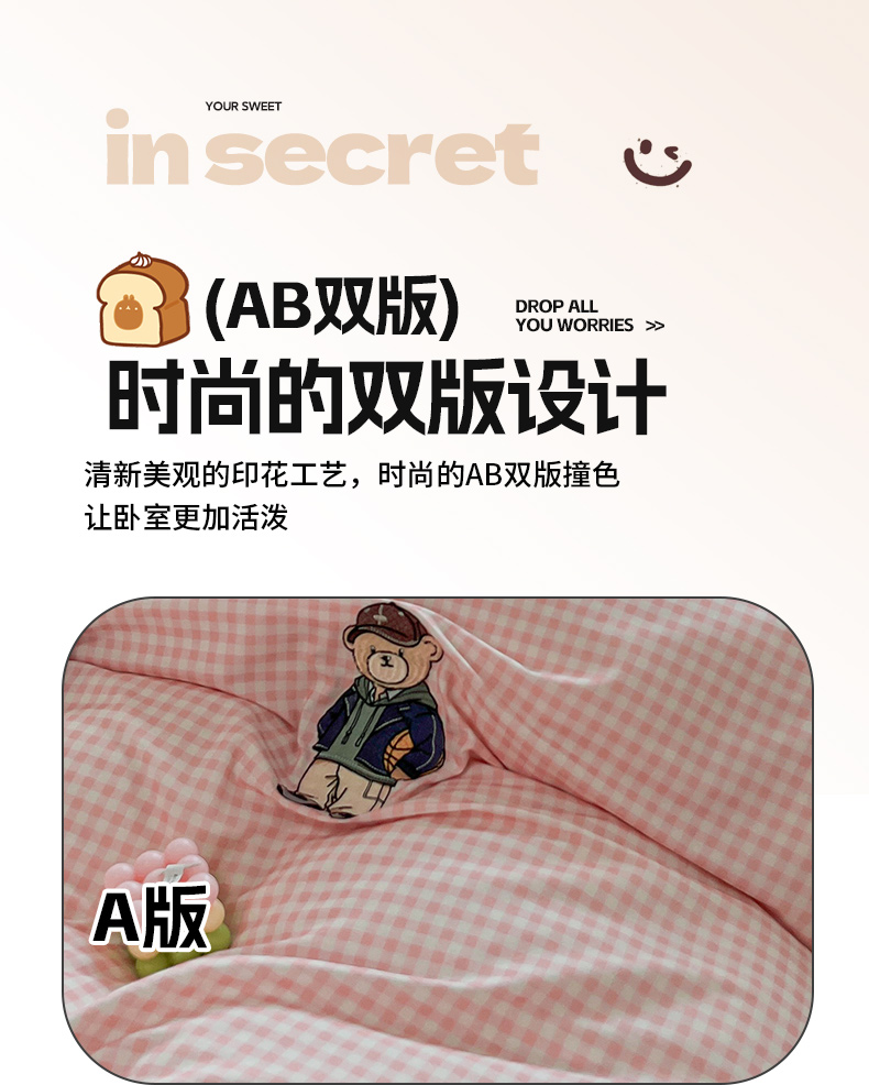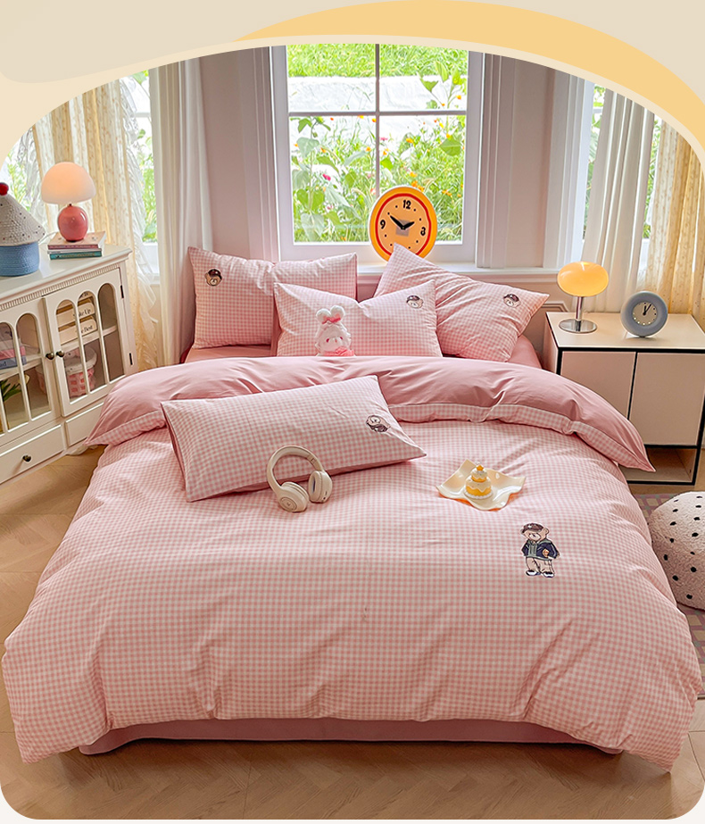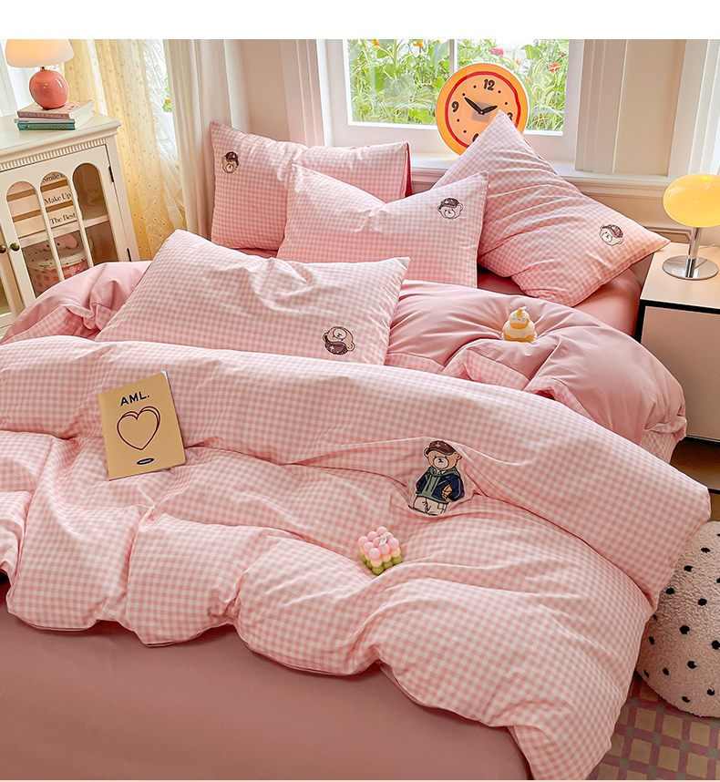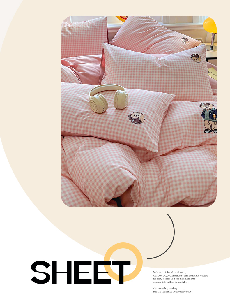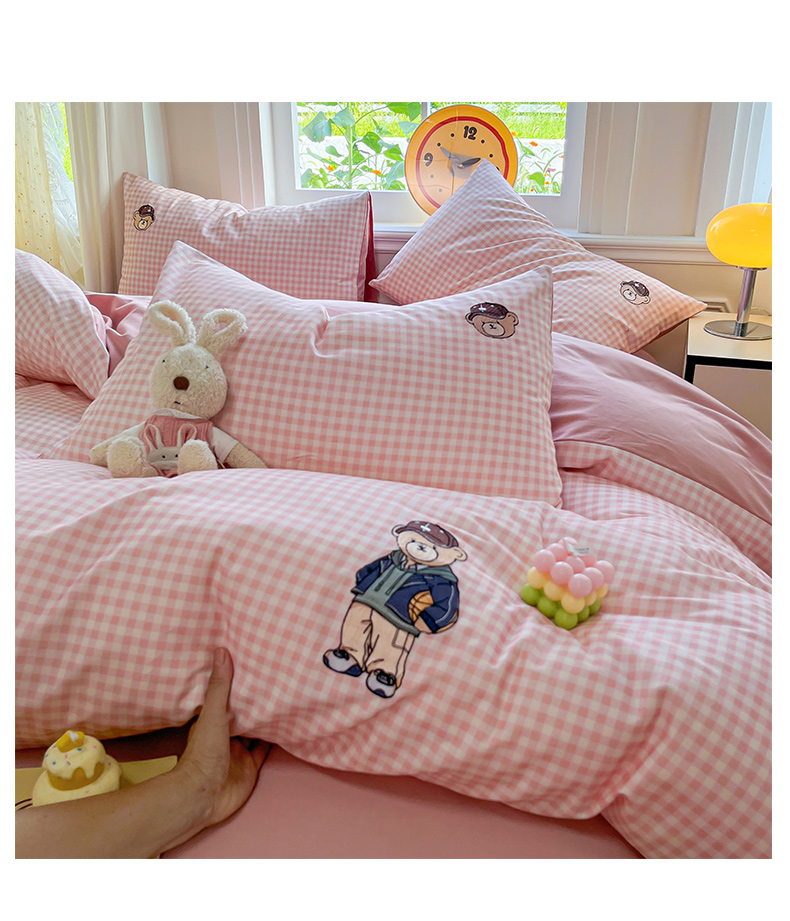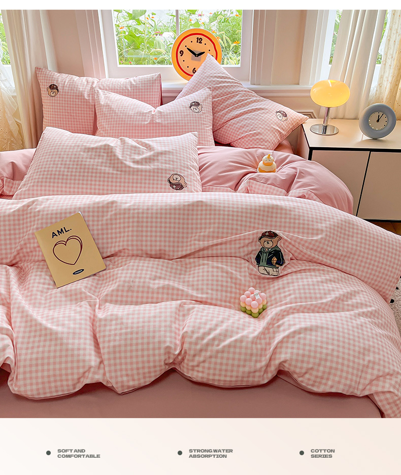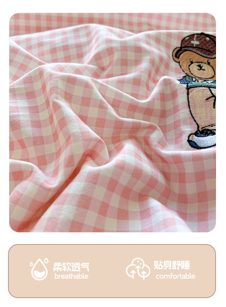 商品名称:大境 2025秋冬专版刺绣A类全棉磨毛四件套三件套 篮球小熊-粉小格