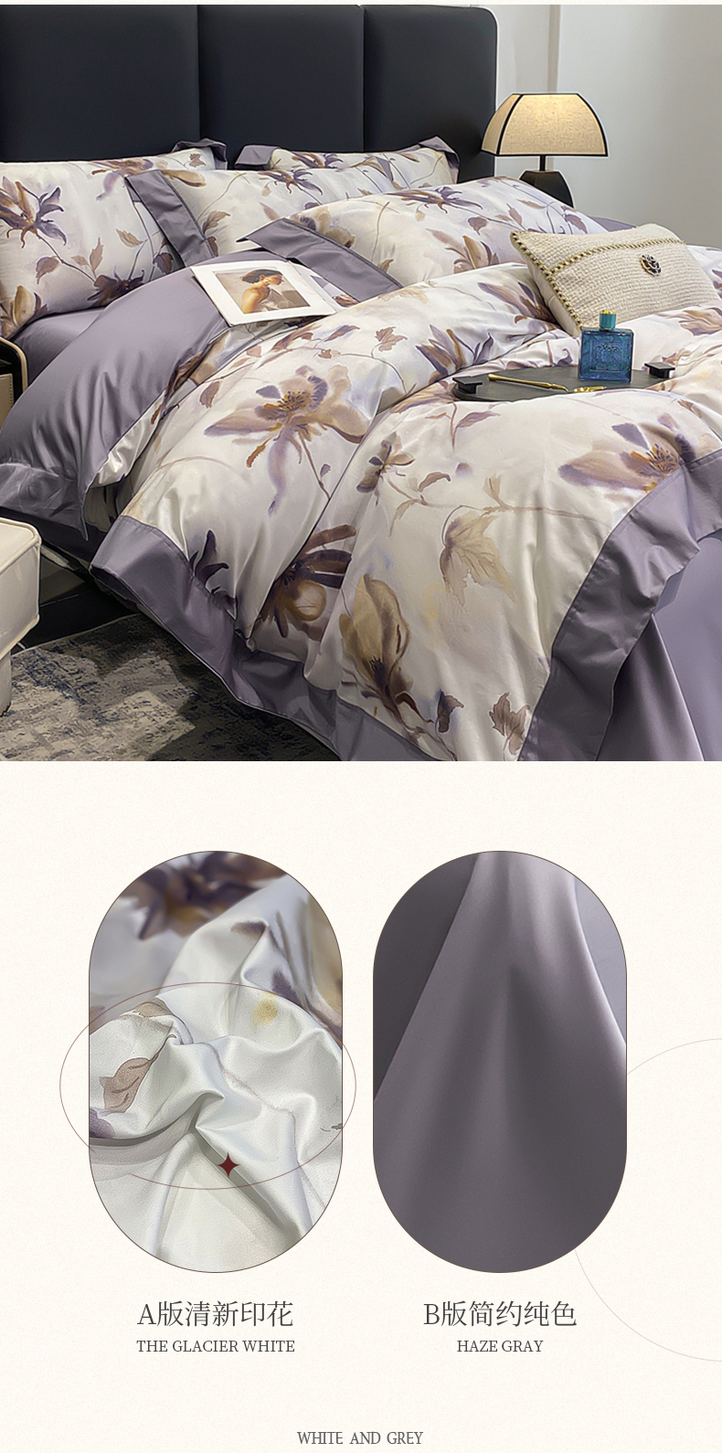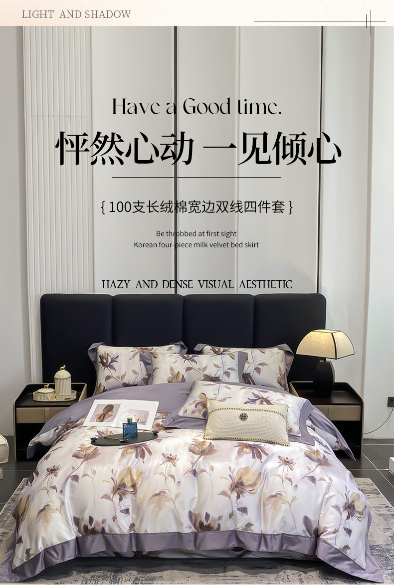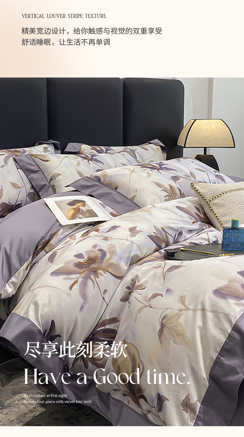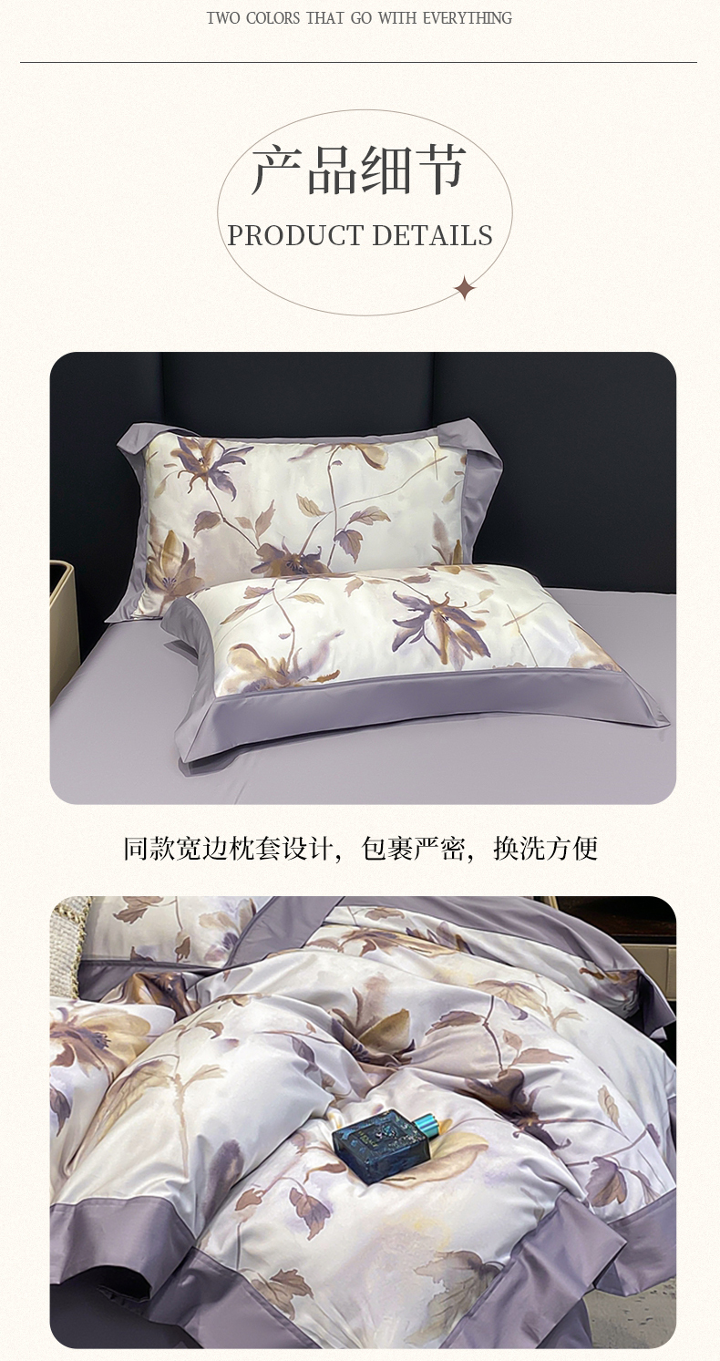 (总)娇逸家居 2025新款高克重A类数码印花牛奶绒双拼边款四件套,采薇灰,扶桑,浅影,秋灵粉,秋灵黄,秋灵绿,舜华粉,采薇米,舜华绿,仙客,栩蝶,璎珞,玉树,芸芙
