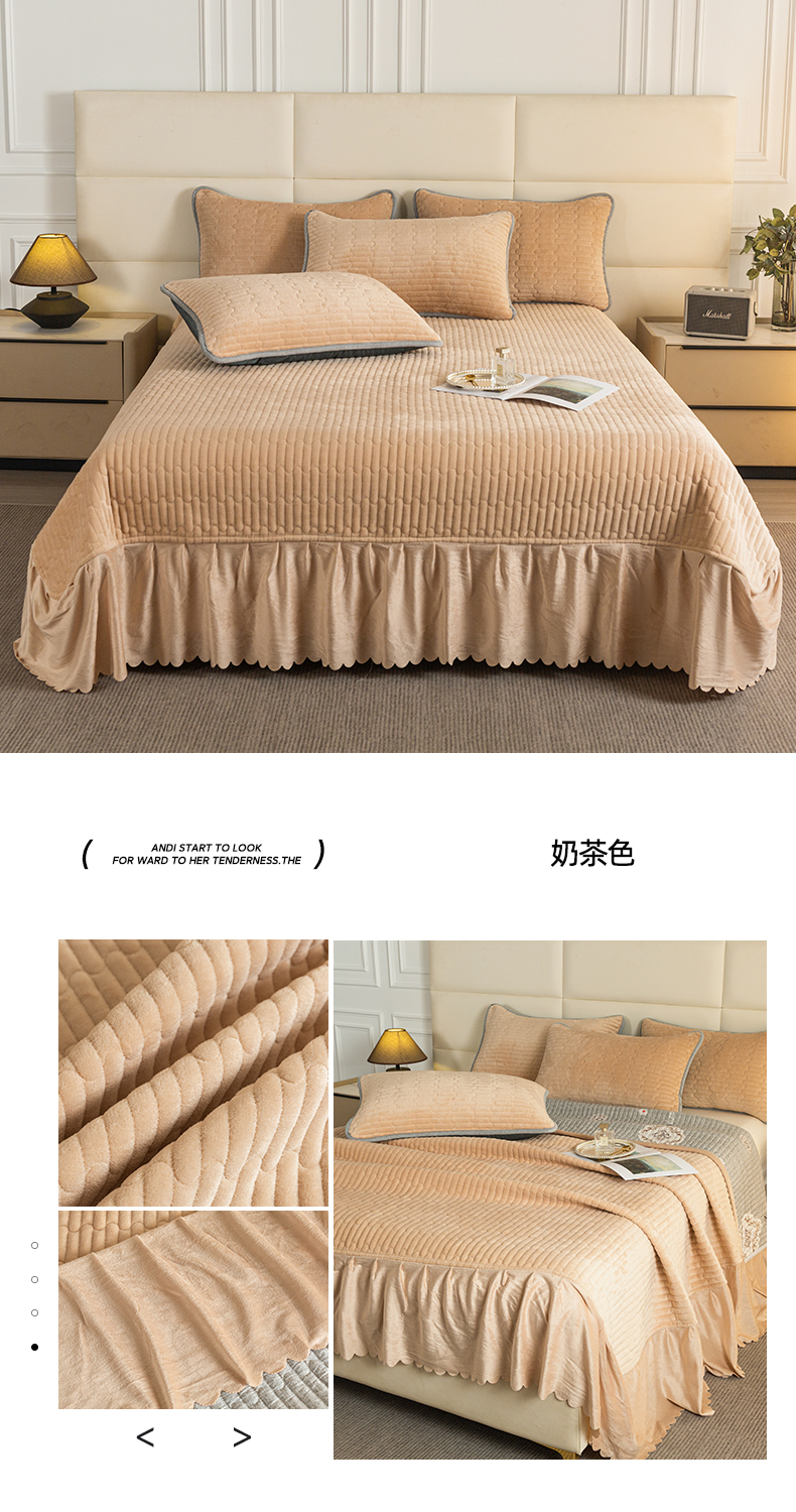 梓依家纺 2025新款牛奶绒单床裙款蕾丝床盖三件套四件套 奶茶色