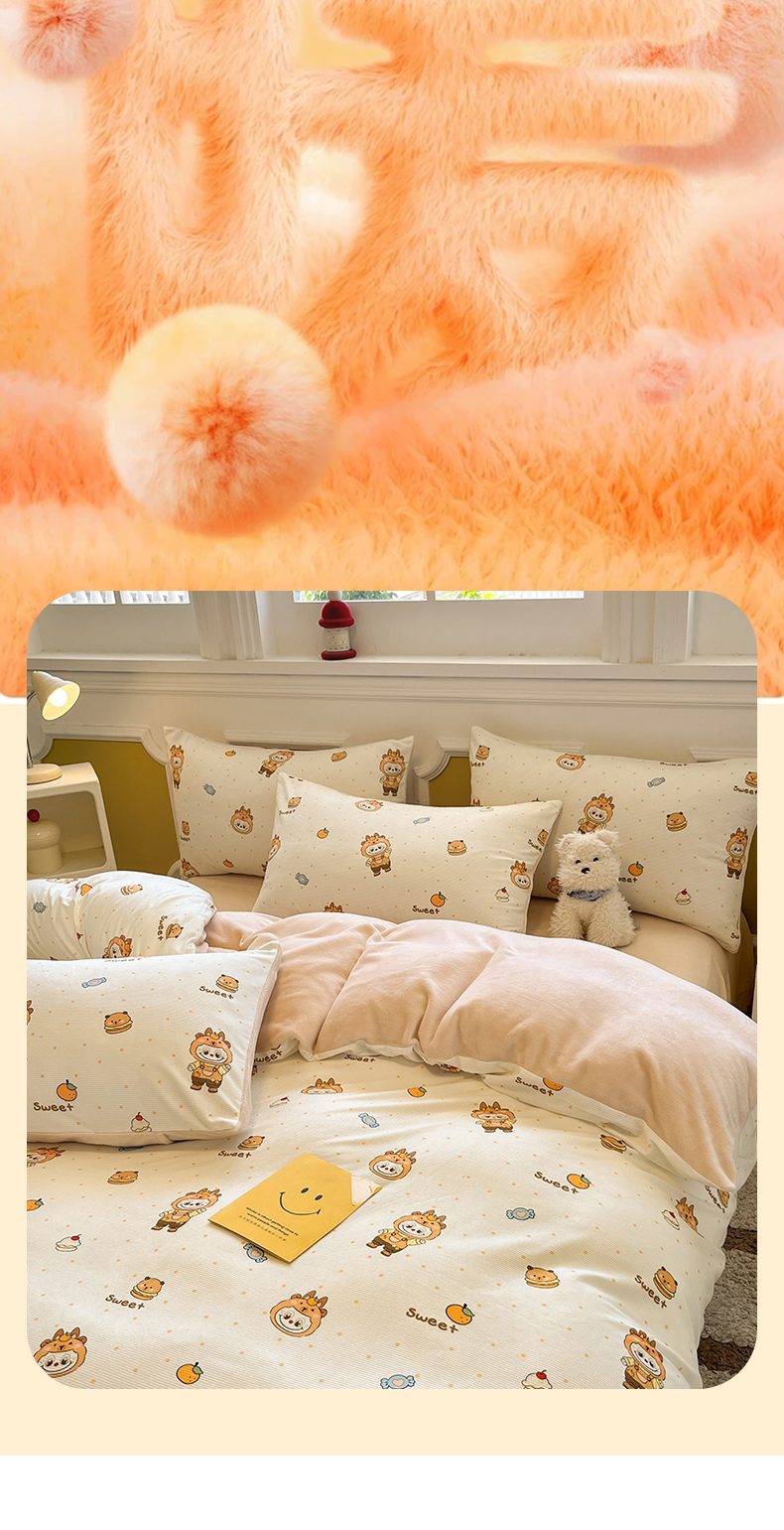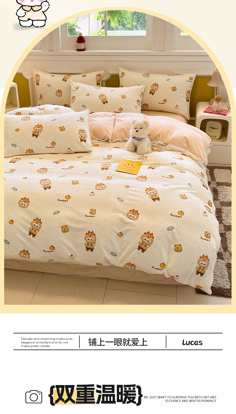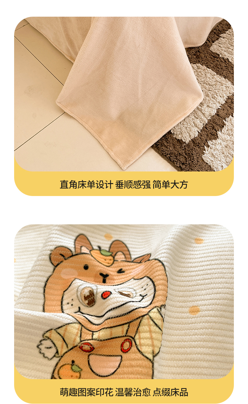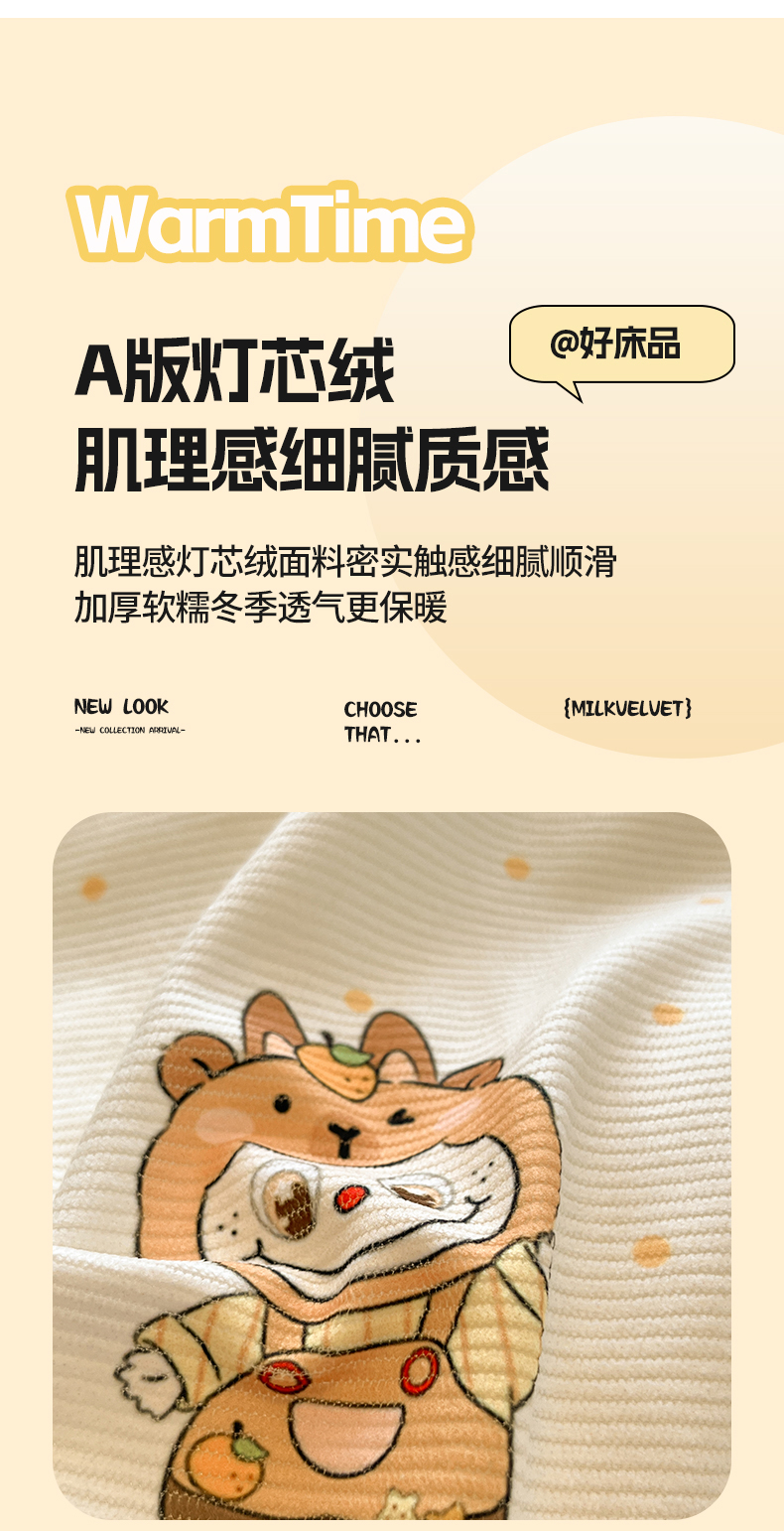商品名称:羚羊语家纺 2025新款灯芯绒 温暖颂系列-印花牛奶绒四件套高克重简约卡通花卉提花加厚保暖床单床笠三件套(买家秀请联系客服!) 温暖颂-卡皮小布