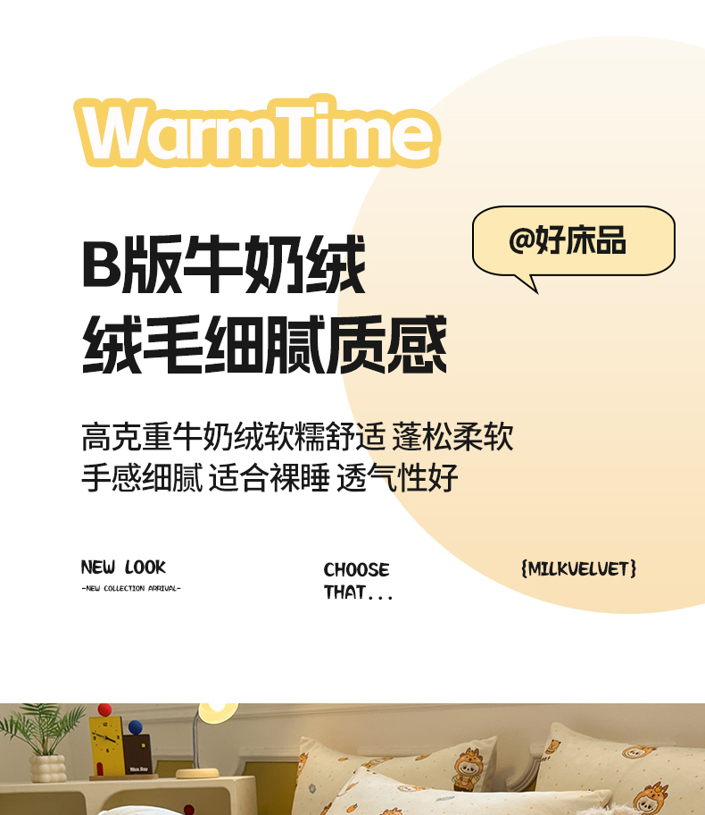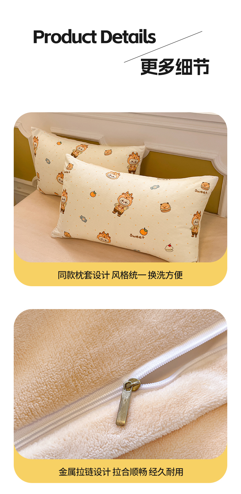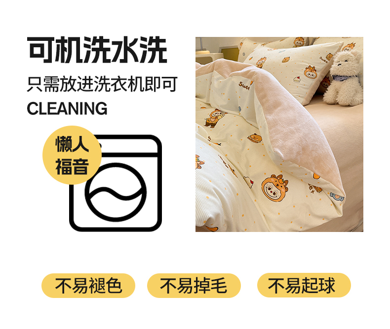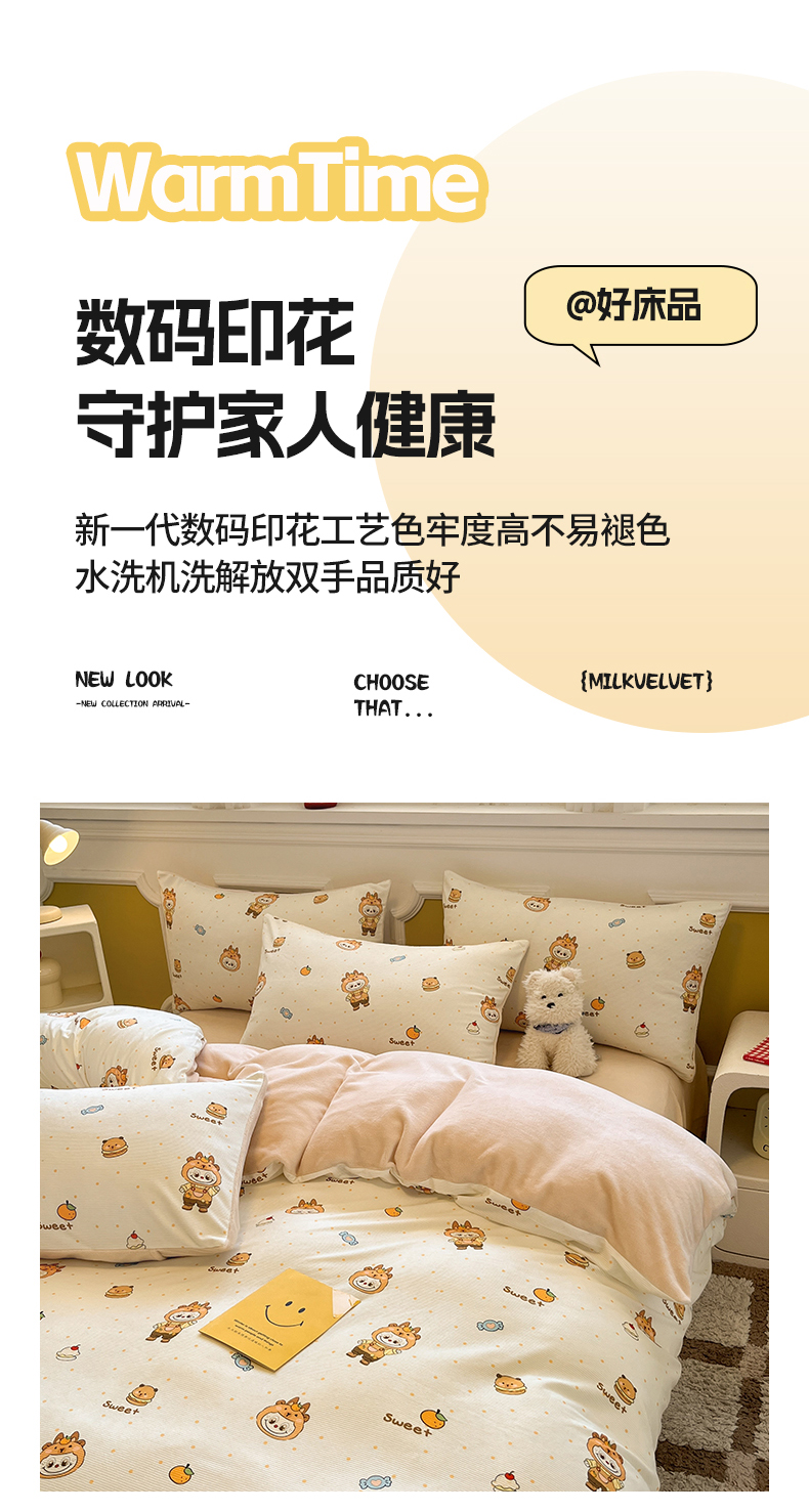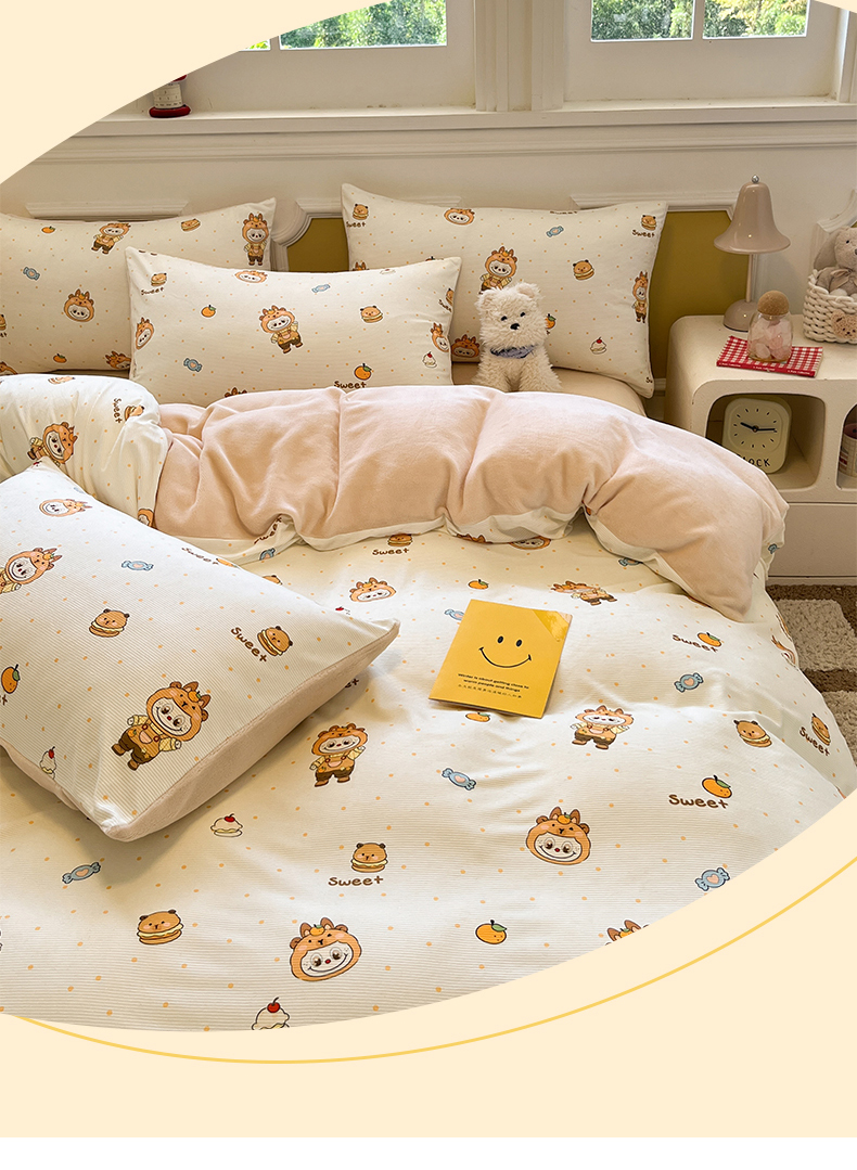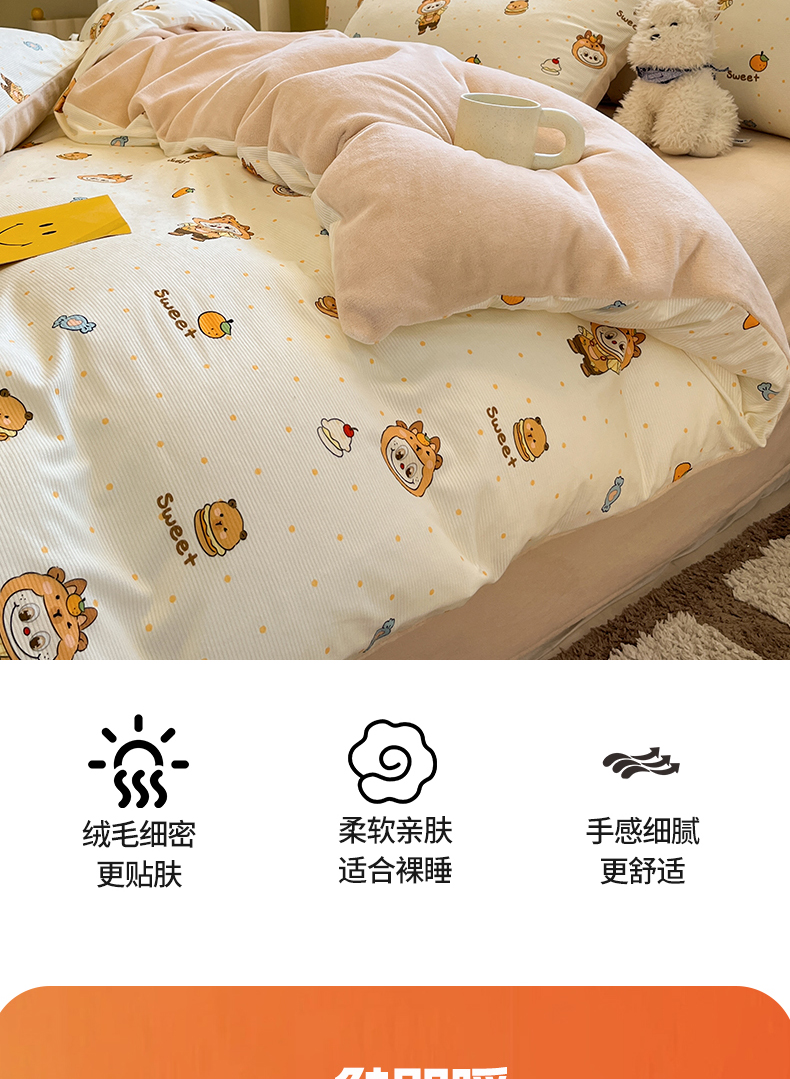 商品名称:羚羊语家纺 2025新款灯芯绒 温暖颂系列-印花牛奶绒四件套高克重简约卡通花卉提花加厚保暖床单床笠三件套(买家秀请联系客服!) 温暖颂-卡皮小布