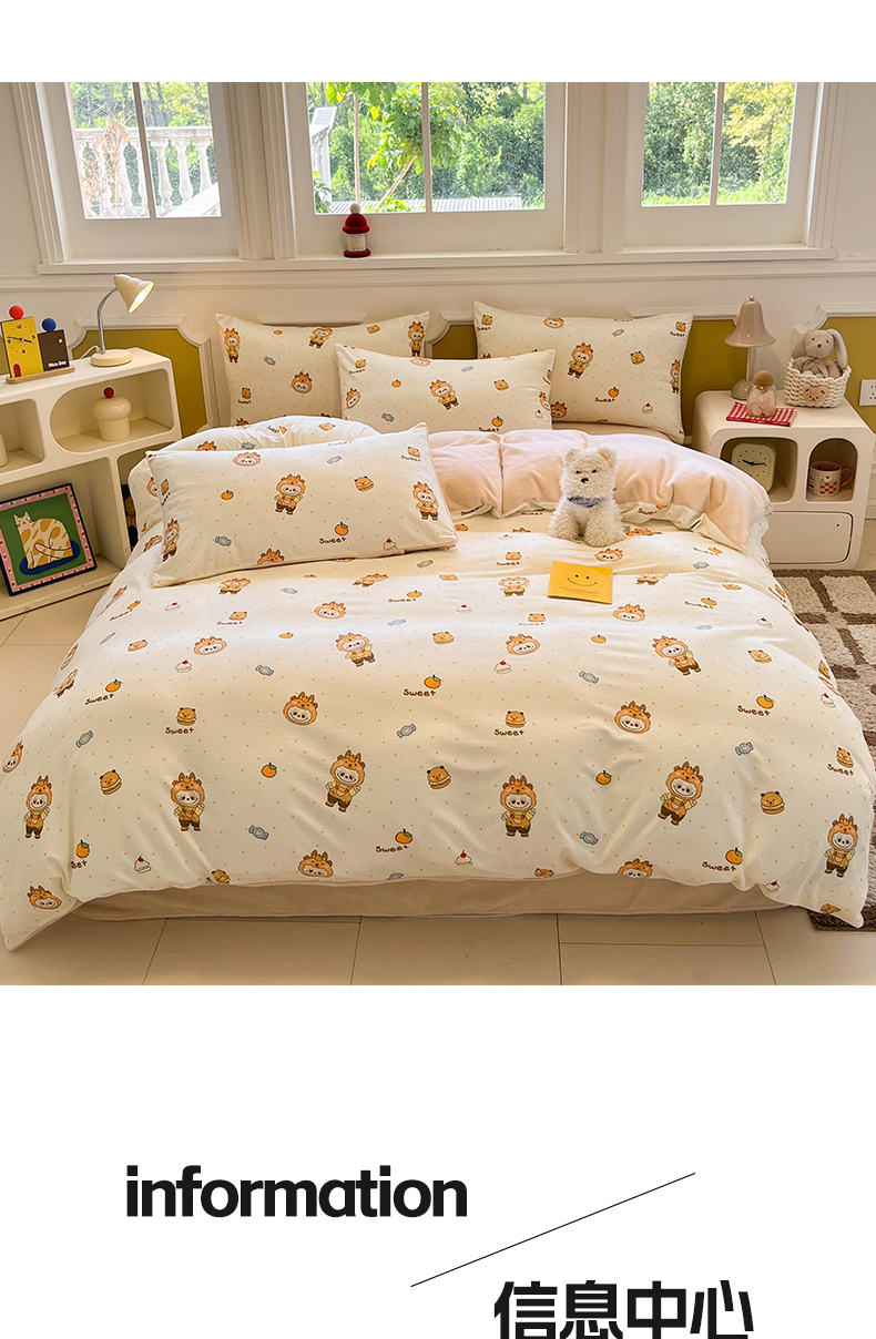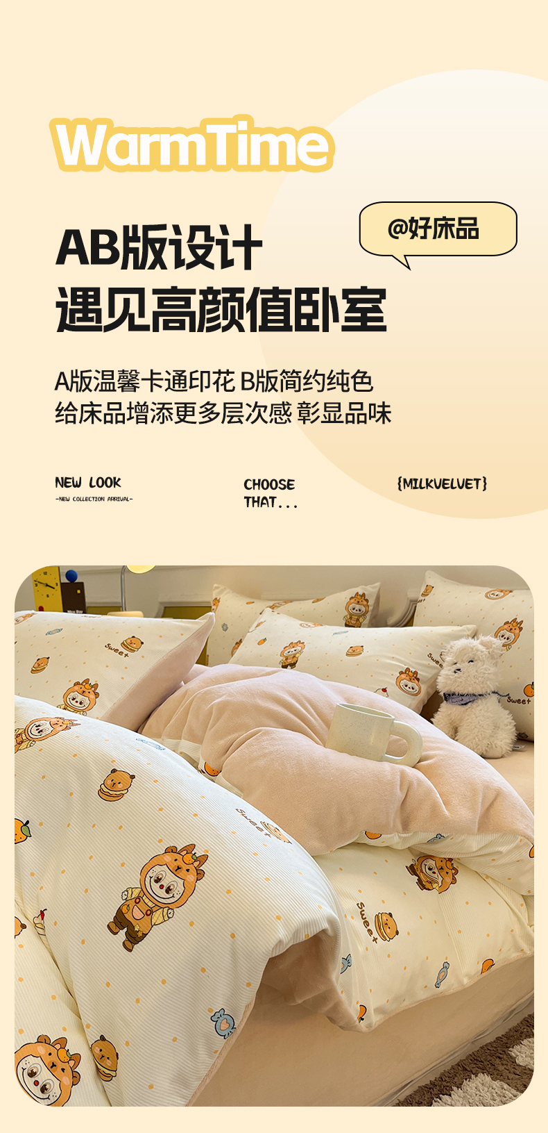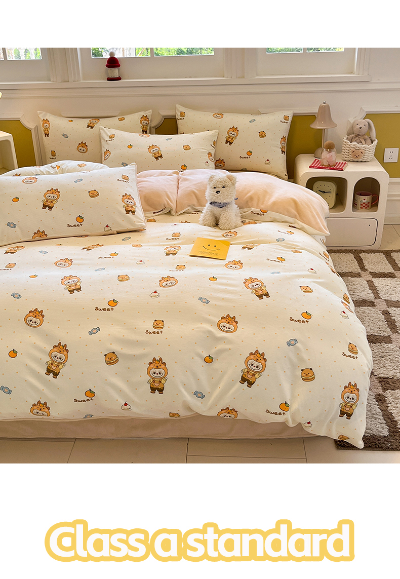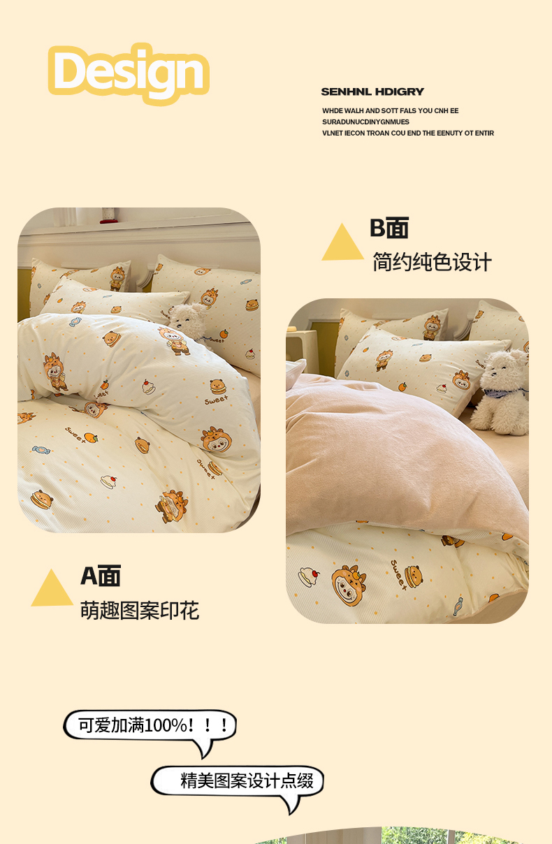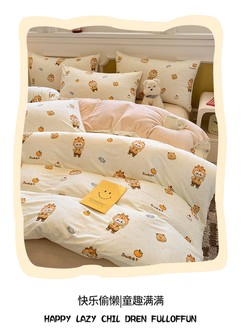 羚羊语家纺 2025新款灯芯绒 温暖颂系列-印花牛奶绒四件套高克重简约卡通花卉提花加厚保暖床单床笠三件套(买家秀请联系客服!) 温暖颂-卡皮小布