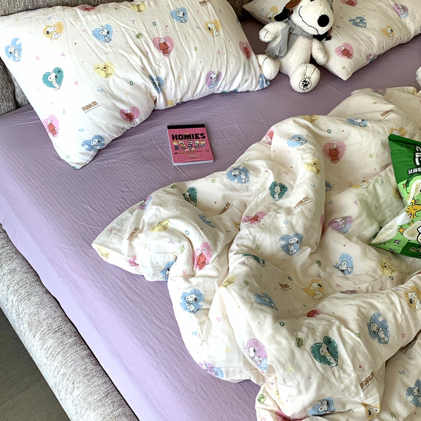 当前位置: 91家纺网 > 商品网购 > 床品套件 > 四件套 > 全棉普通四件套 > 源启生活 2025新款正版史努比系列全棉纯棉双层纱四件套 甜心史努比