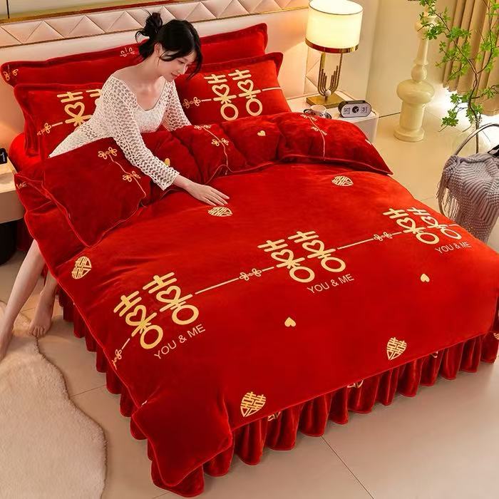 沐妍家纺 2024新款重工刺绣绣花纯色牛奶绒四件套皇冠-喜庆红,皇冠-喜庆红